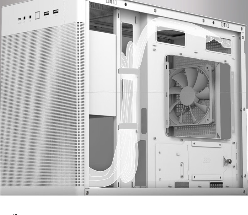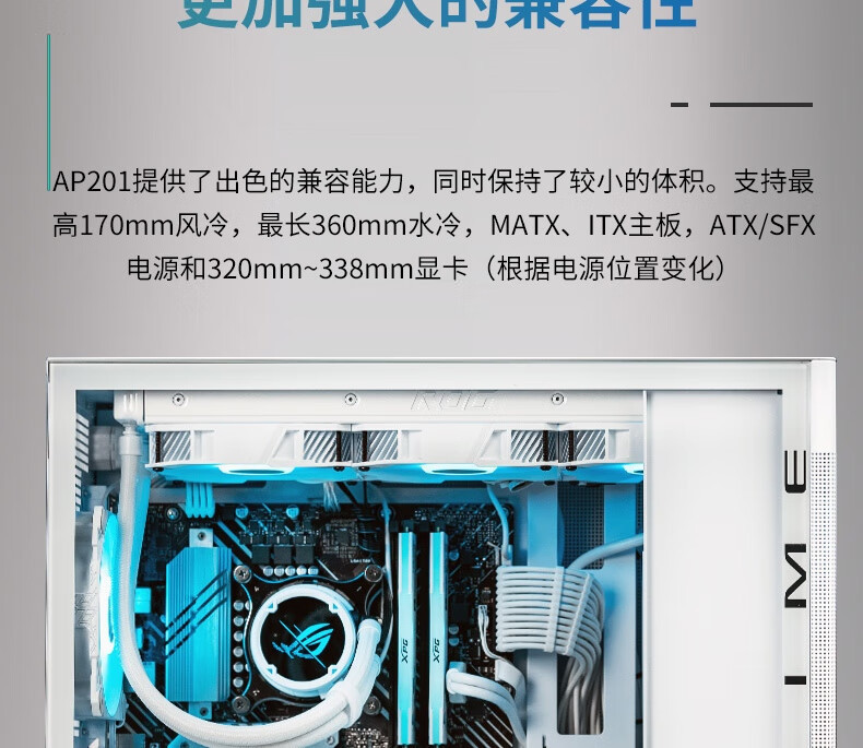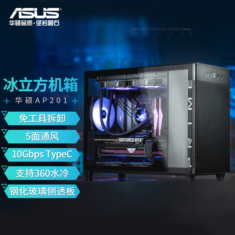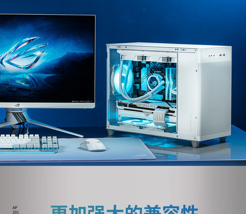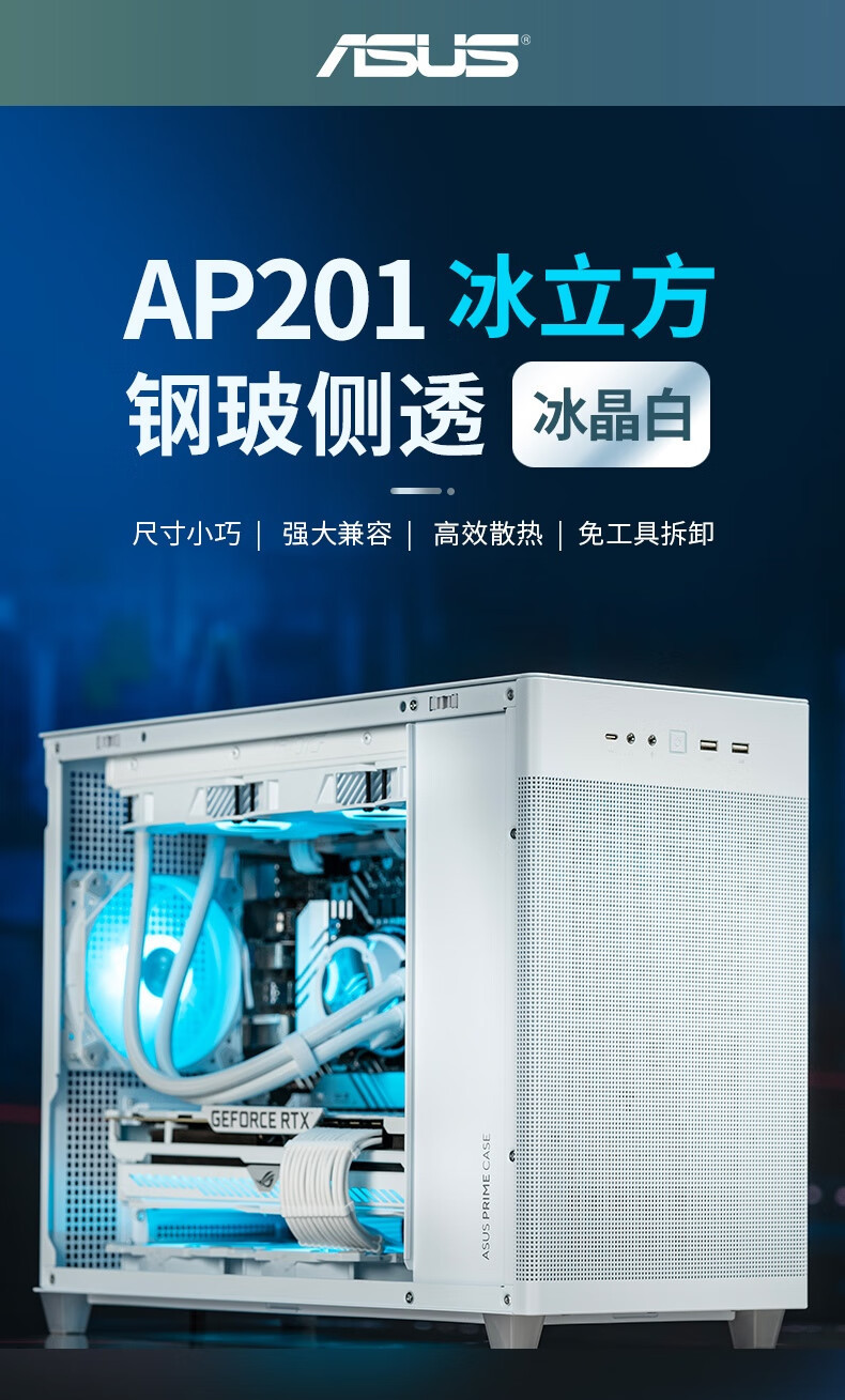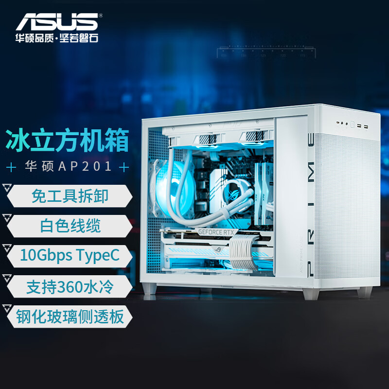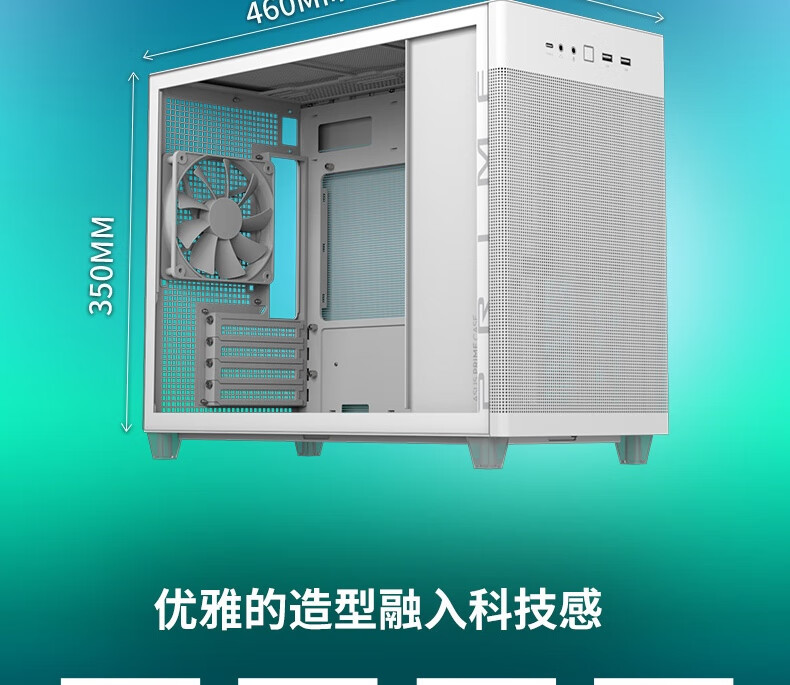 设计风格:简约立方体造型,冰晶白配色搭配 钢玻侧透侧板,打造通透视觉效果,适合白色主题装机华硕官网。