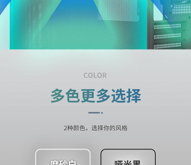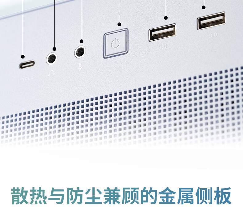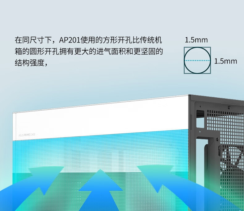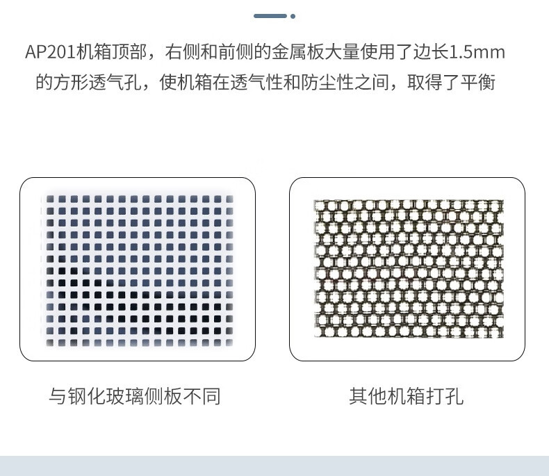 50,000+ 方形散热孔(边长 1.5mm)覆盖侧板和顶部,兼顾透气性与防尘性,有效减少灰尘堆积。