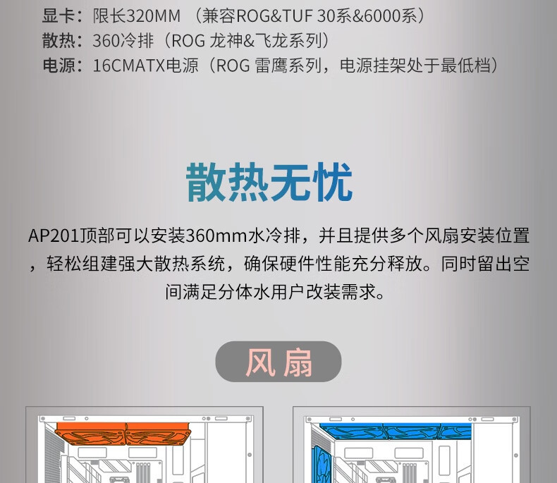 最大支持 6 个风扇,可组建 “下进上出” 或 “前进后出” 风道,压制高性能硬件发热ASUS中国。