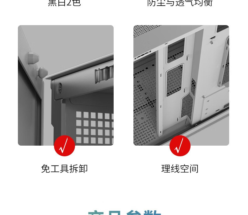 免工具拆卸:侧板、顶部盖板和防尘网均支持免工具操作,方便装机与维护。