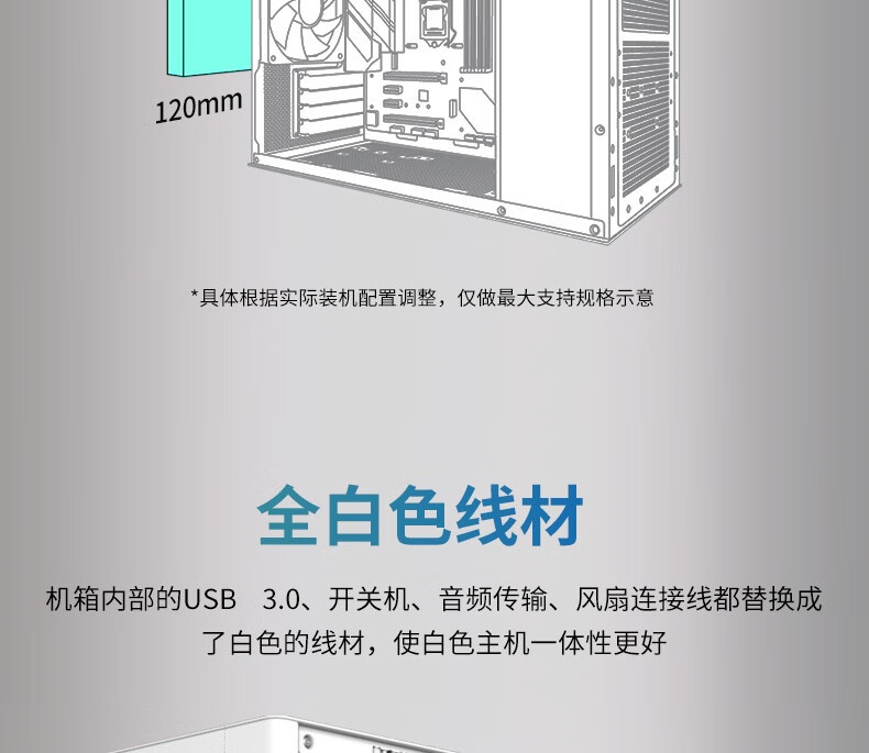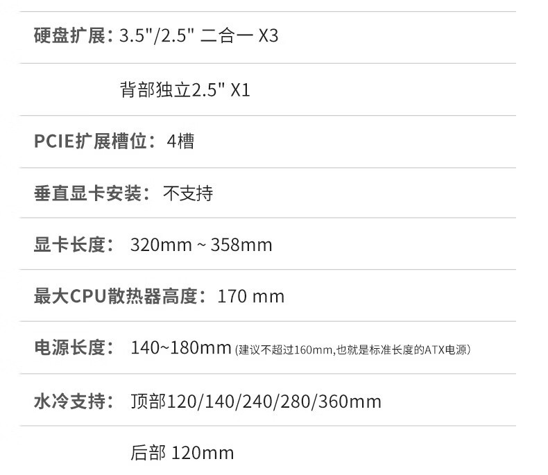 风冷上限:CPU 散热器限高 170mm,可容纳双塔风冷(如利民 AX120 R SE)。