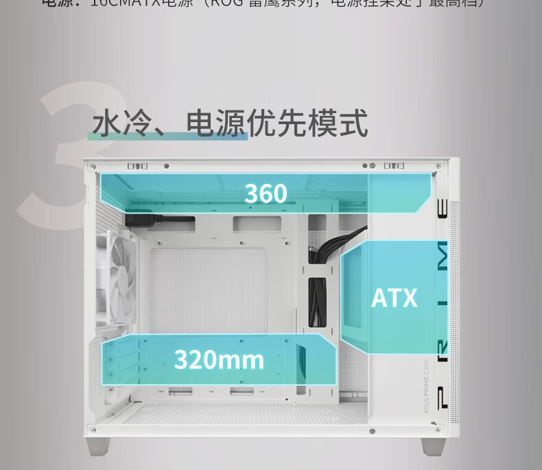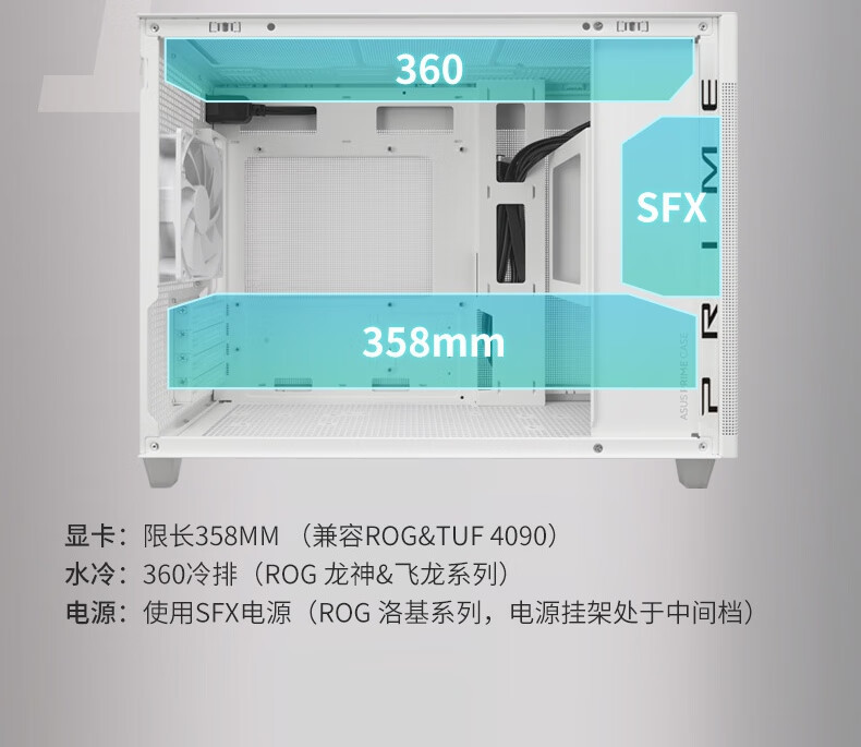 水冷上限:顶部支持 360mm 水冷排(如华硕天选 TX360 ARGB),后置支持 120mm 水冷排,兼容主流高端散热系统。