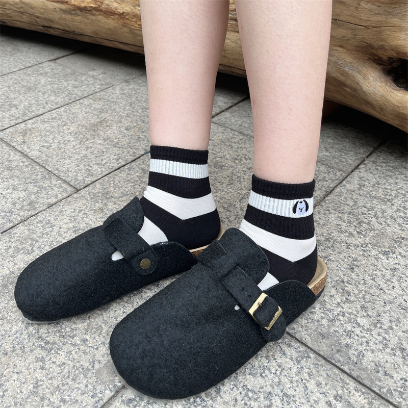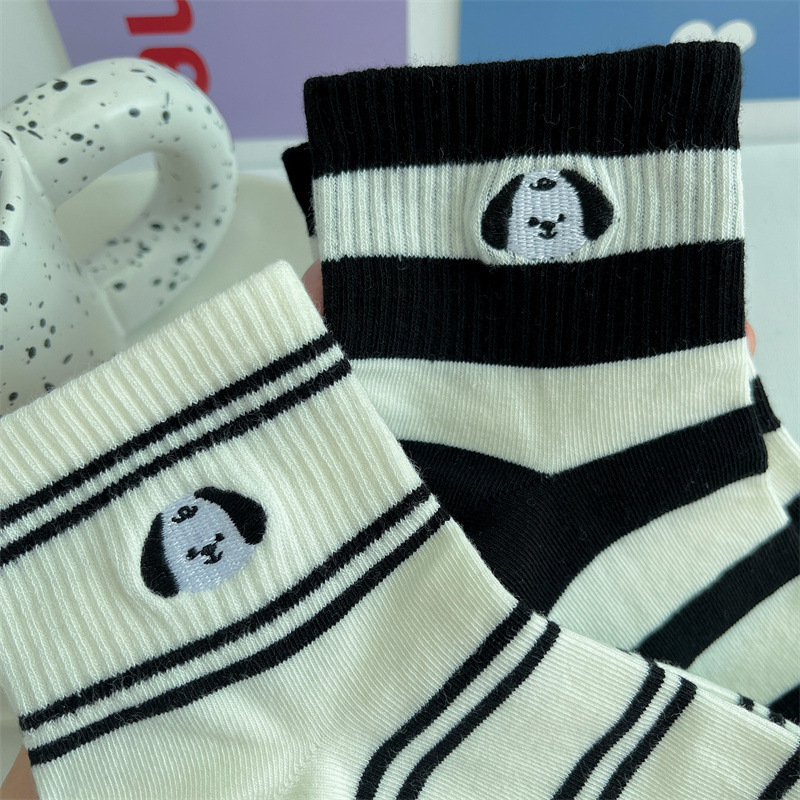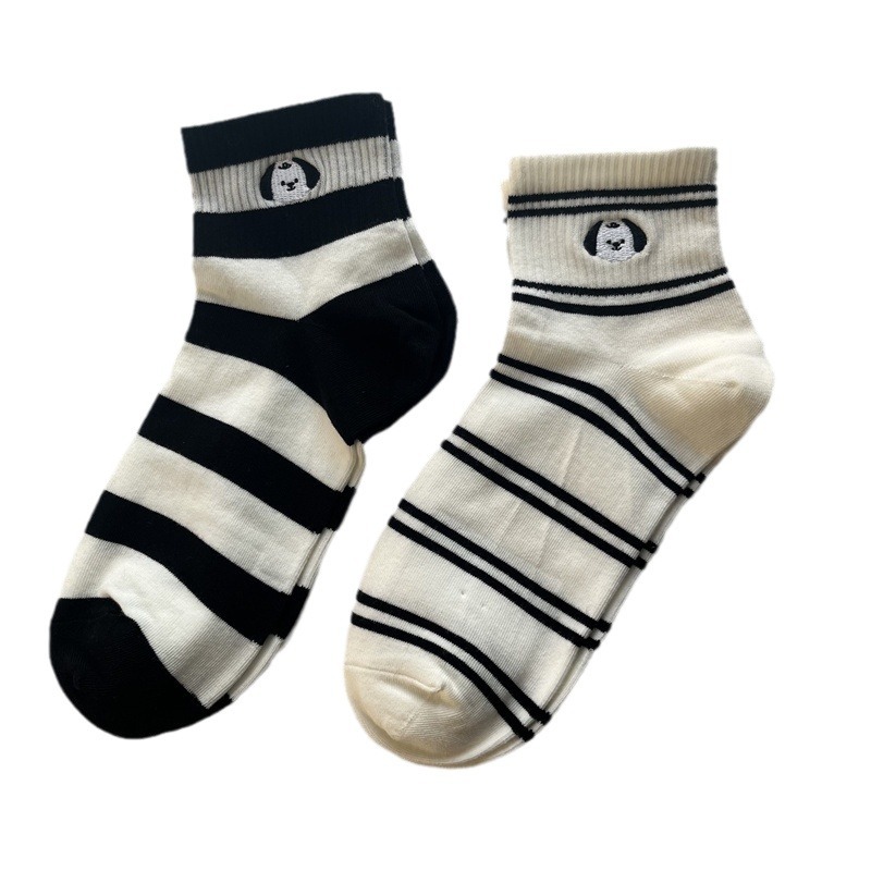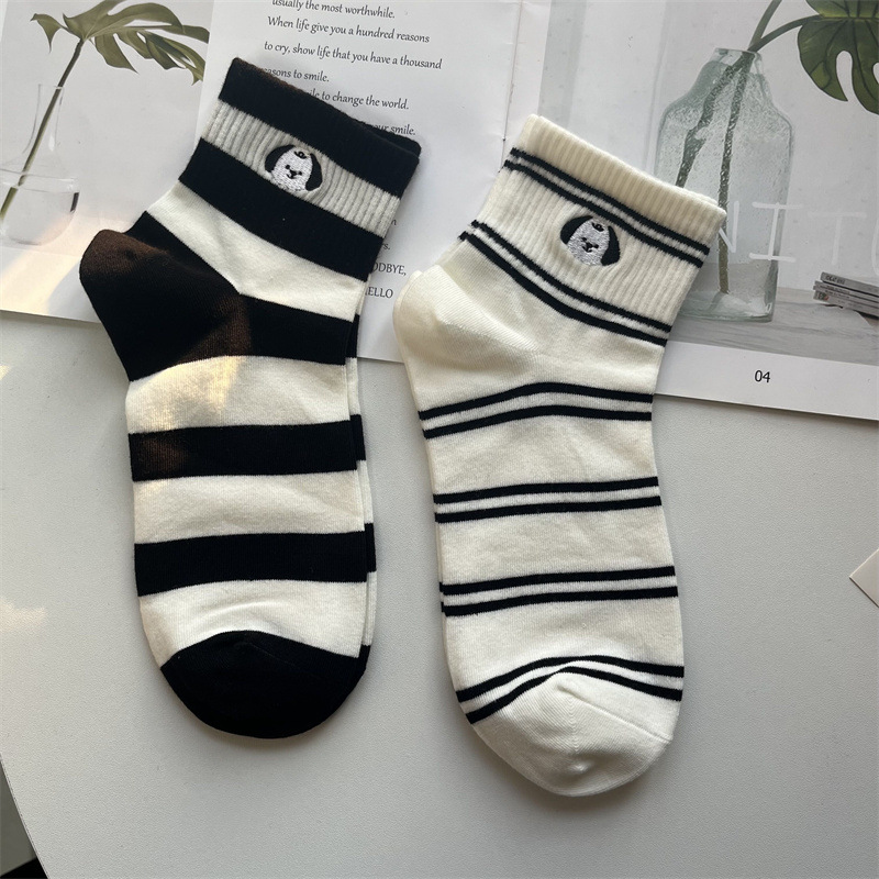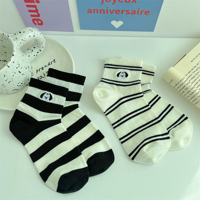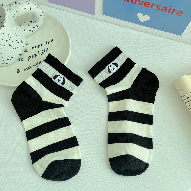 2024 봄 여름 신상 유럽풍 여성용 양말, 개성 넘치는 트렌디 양말, 컬러 블록 스트라이프 자수 강아지 면 양말, 짧은 양말, 얇은 스타일