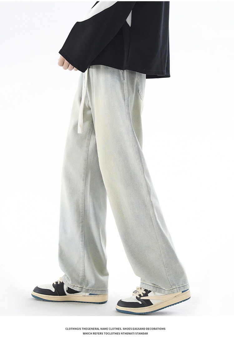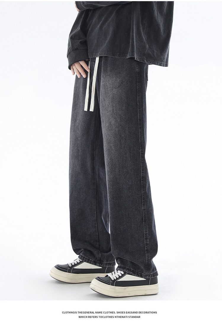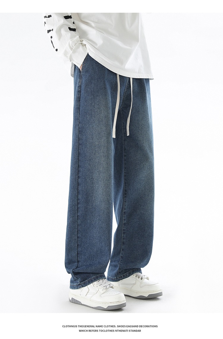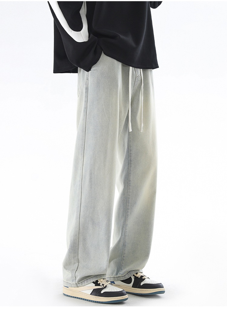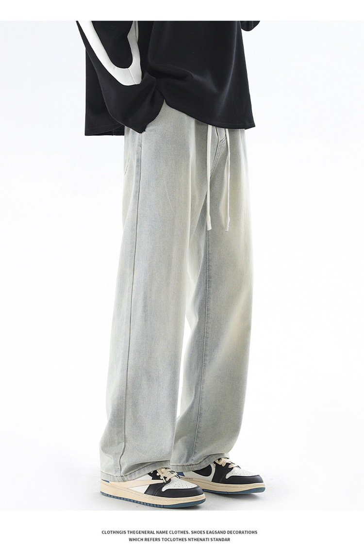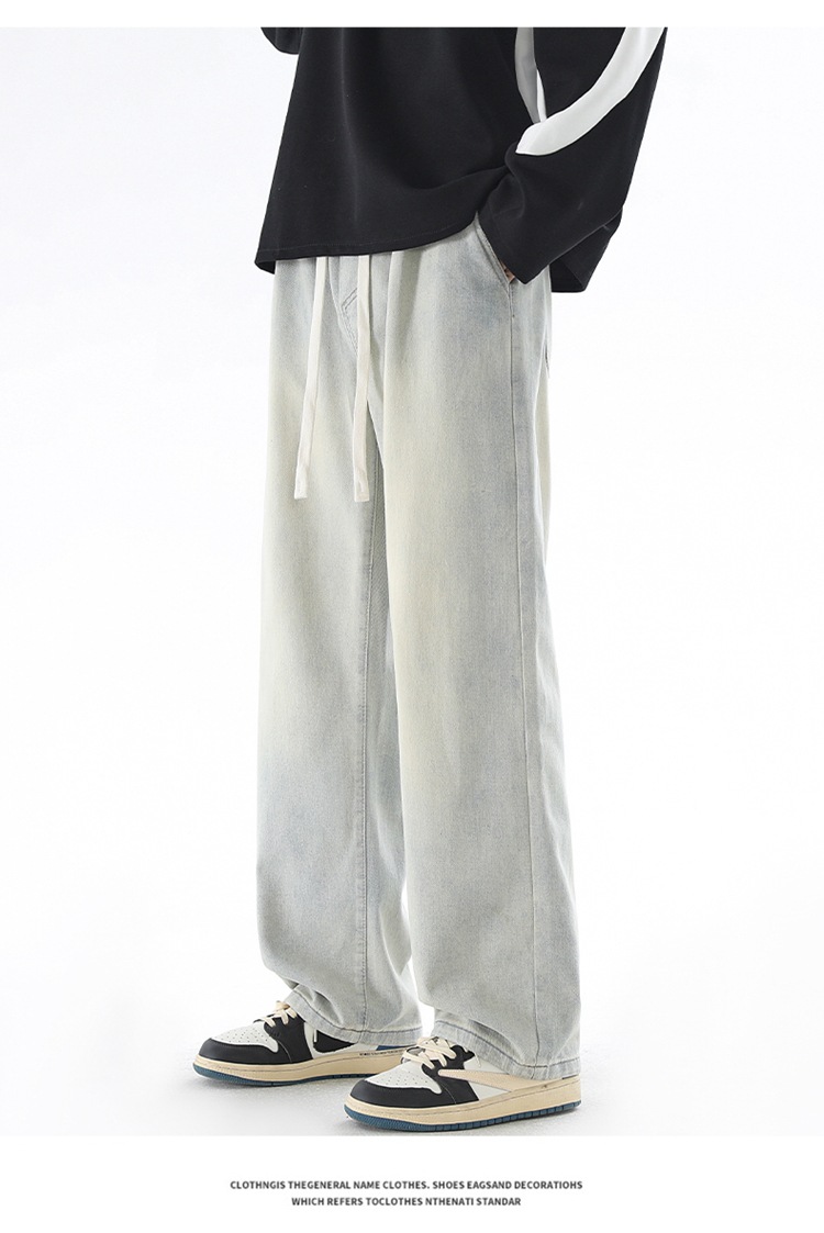 상하이 남자 탄성 레이스 업 스트레이트 청바지 남자 홍콩 스타일 올 매치가 긴 캐주얼 남자 와이드 레그 팬츠를 씻었습니다.스토어 가기
