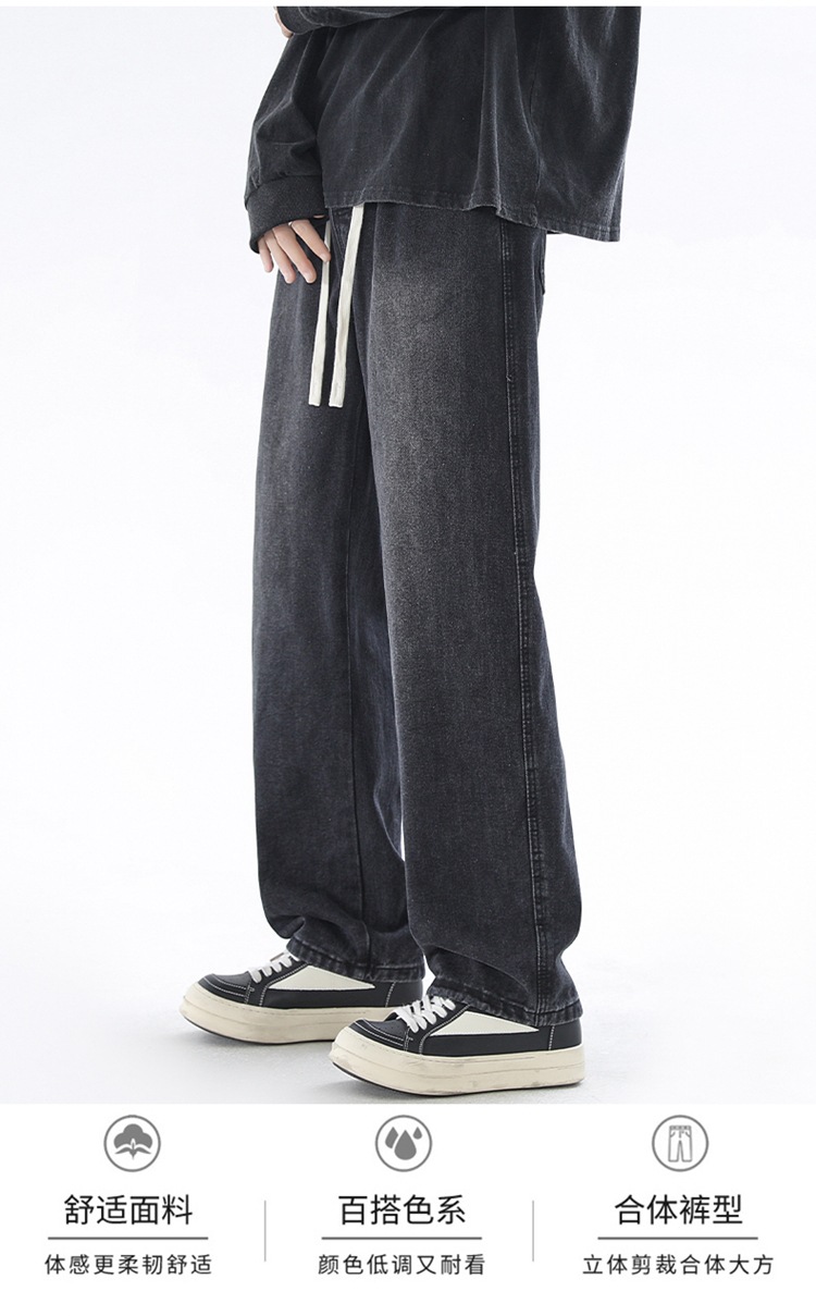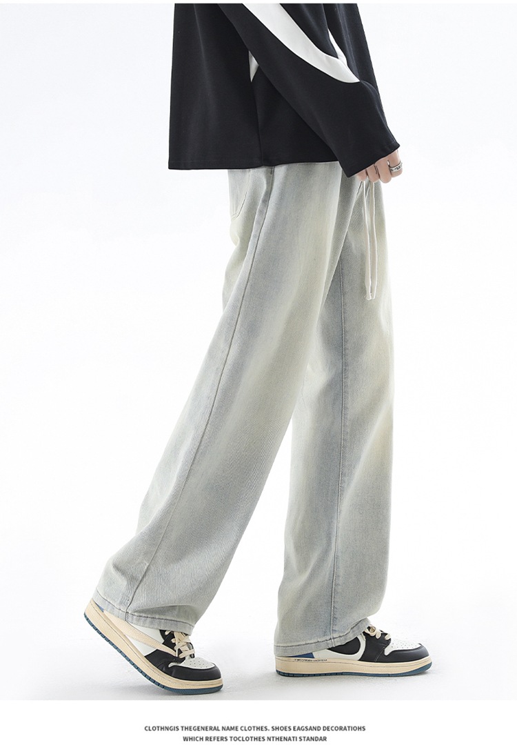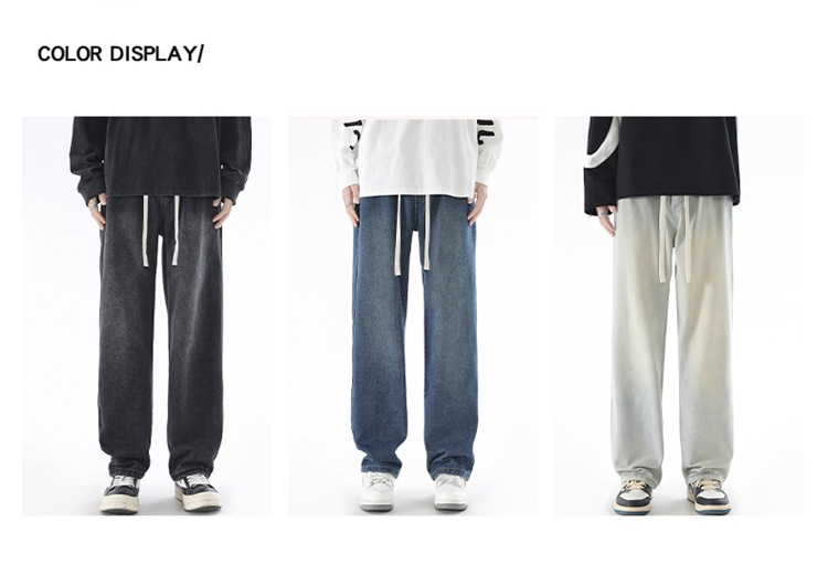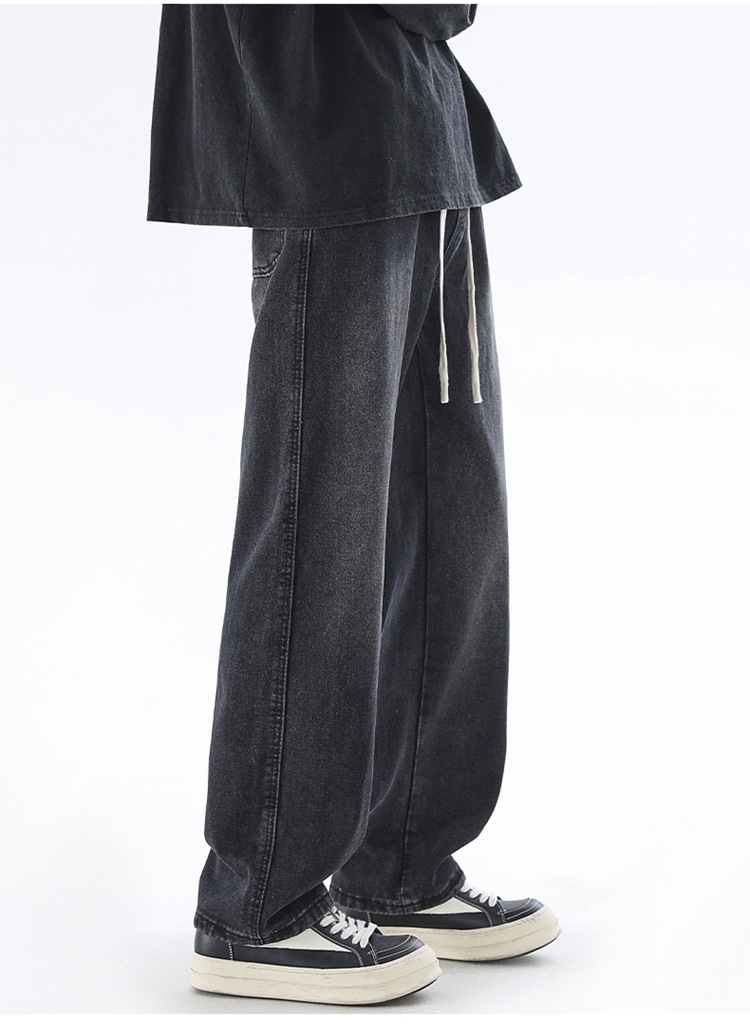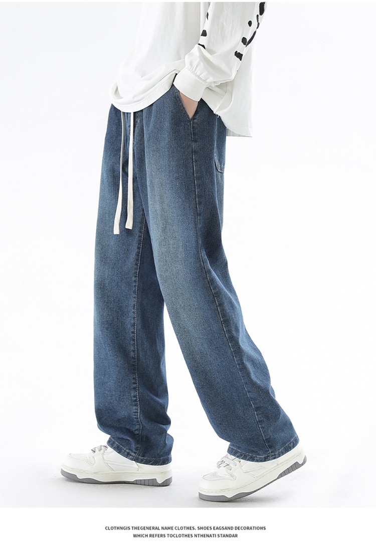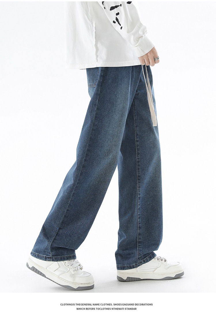 상하이 남자 탄성 레이스 업 스트레이트 청바지 남자 홍콩 스타일 올 매치가 긴 캐주얼 남자 와이드 레그 팬츠를 씻었습니다.스토어 가기
