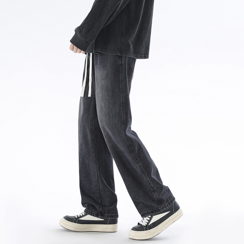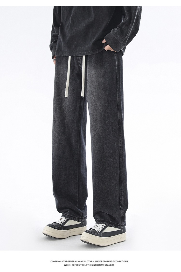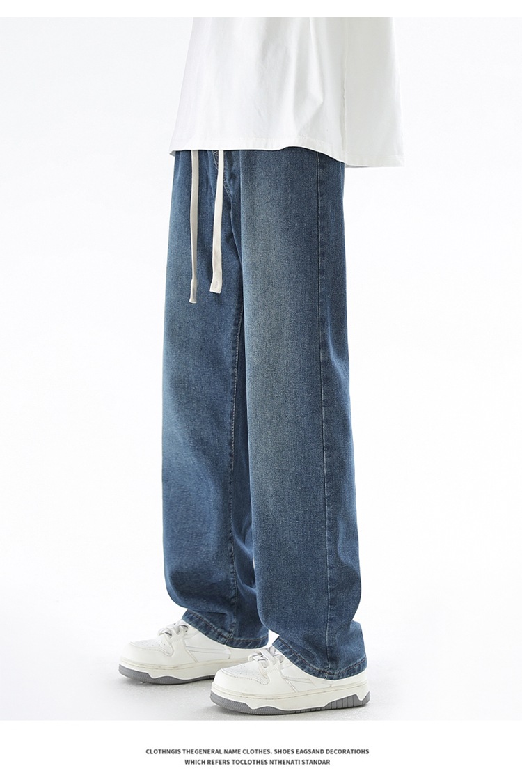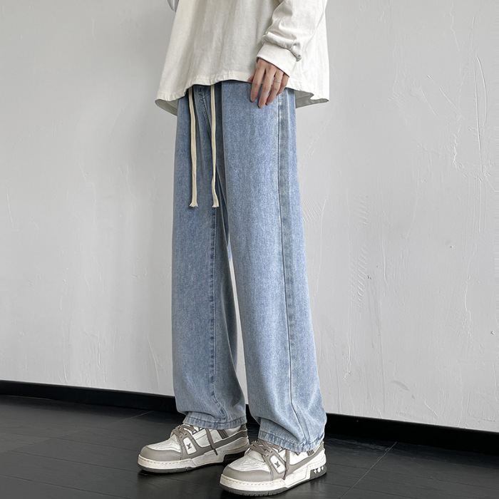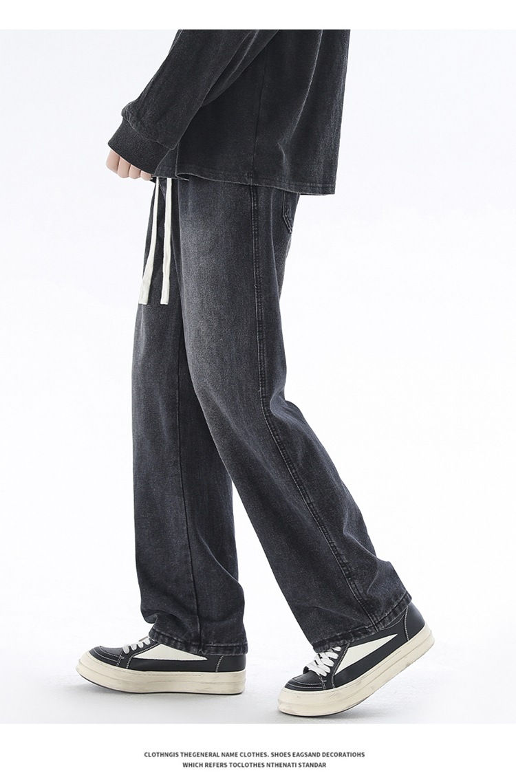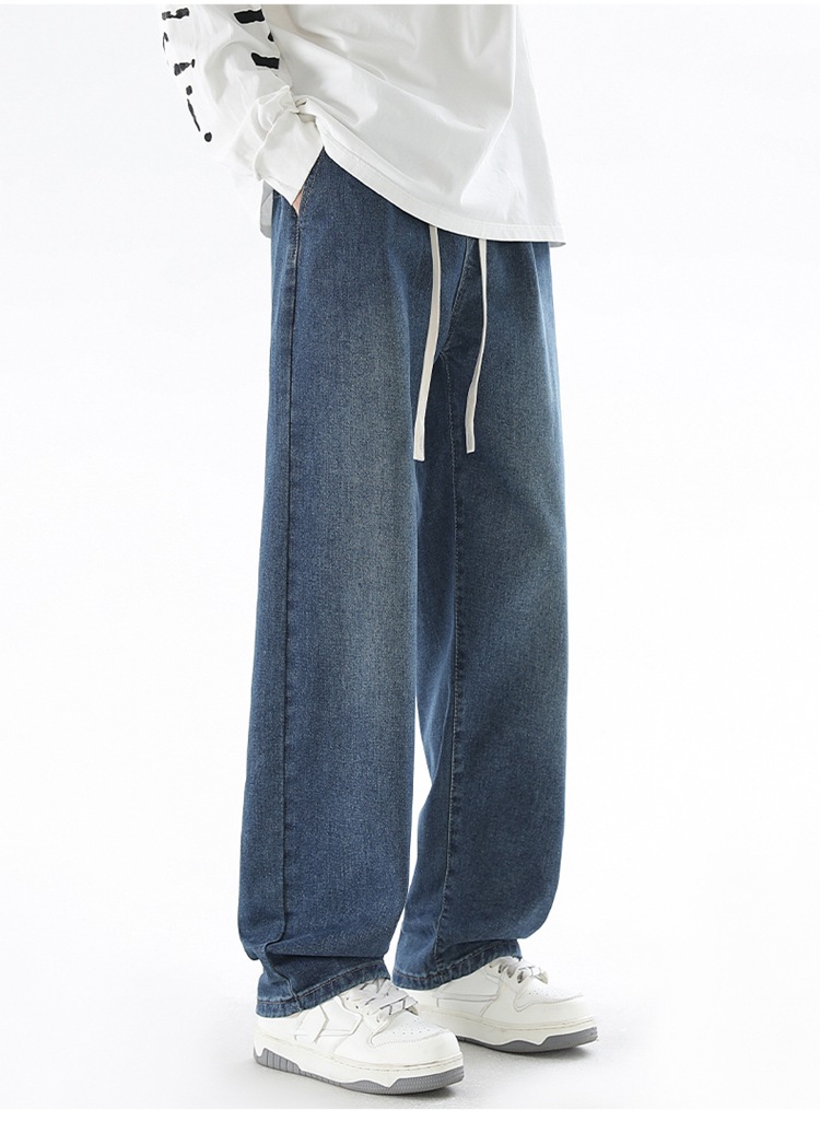 상하이 남자 탄성 레이스 업 스트레이트 청바지 남자 홍콩 스타일 올 매치가 긴 캐주얼 남자 와이드 레그 팬츠를 씻었습니다.