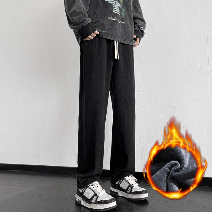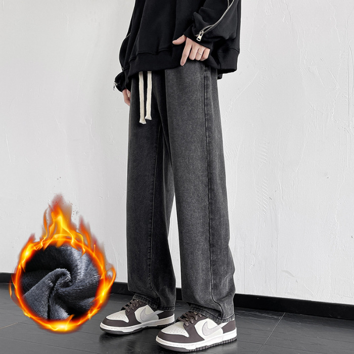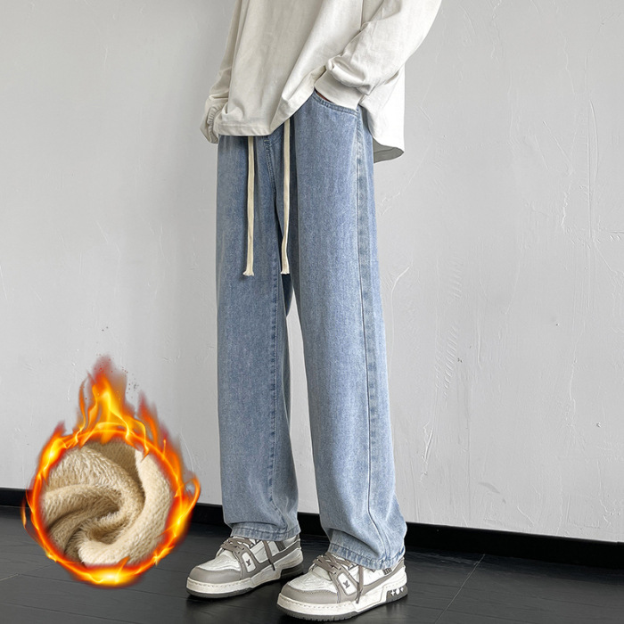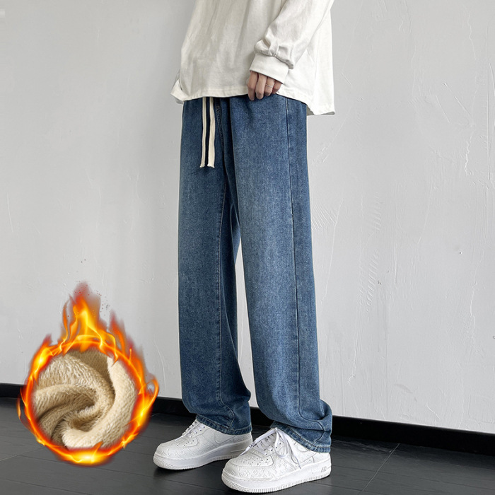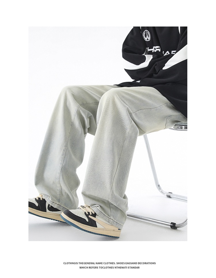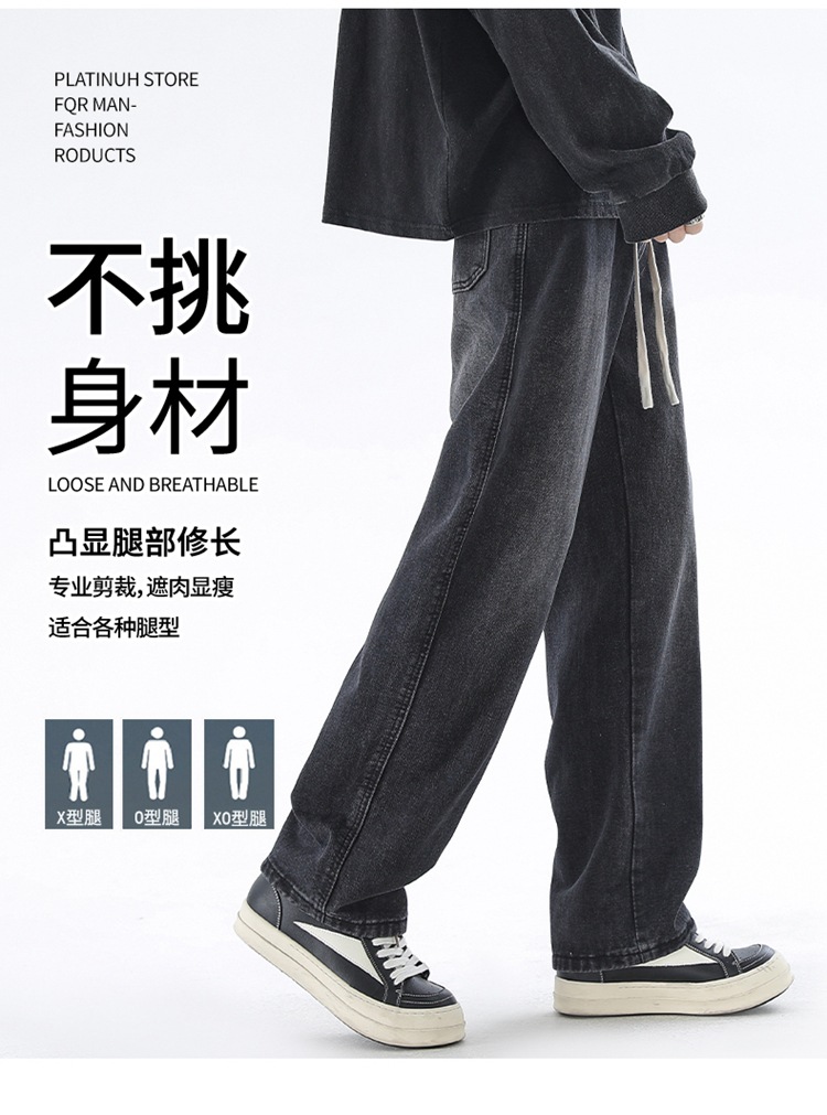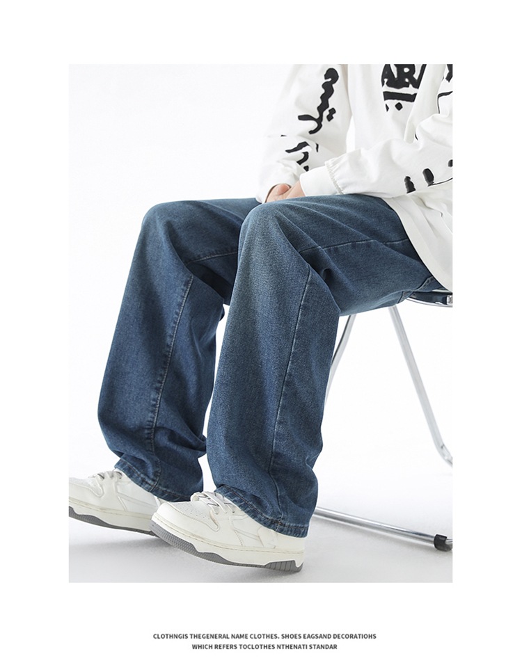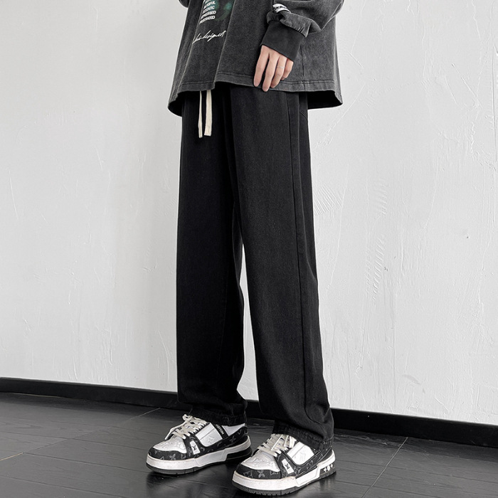 상하이 남자 탄성 레이스 업 스트레이트 청바지 남자 홍콩 스타일 올 매치가 긴 캐주얼 남자 와이드 레그 팬츠를 씻었습니다.