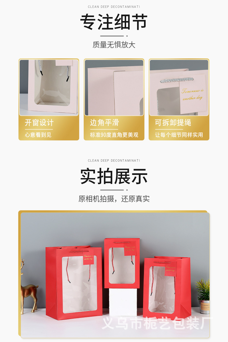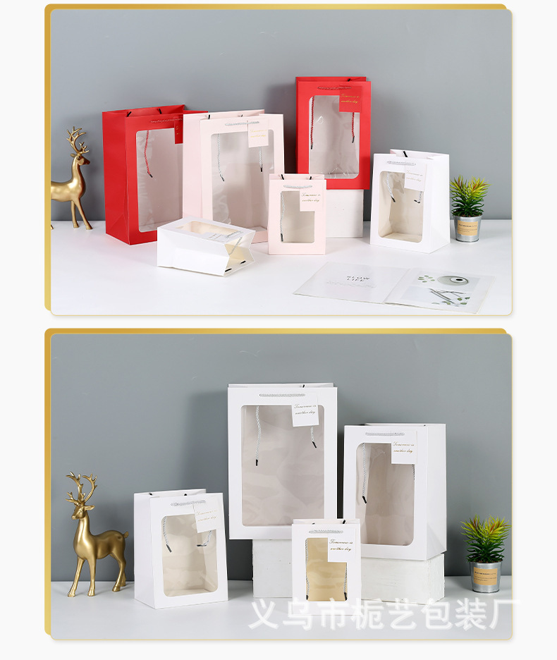 태그가 달린 투명한 핸드백, 꽃다발, 인형, 선물, 기념품, 창문이 있는 선물 가방, 미니멀리스트 스타일 맞춤 제작