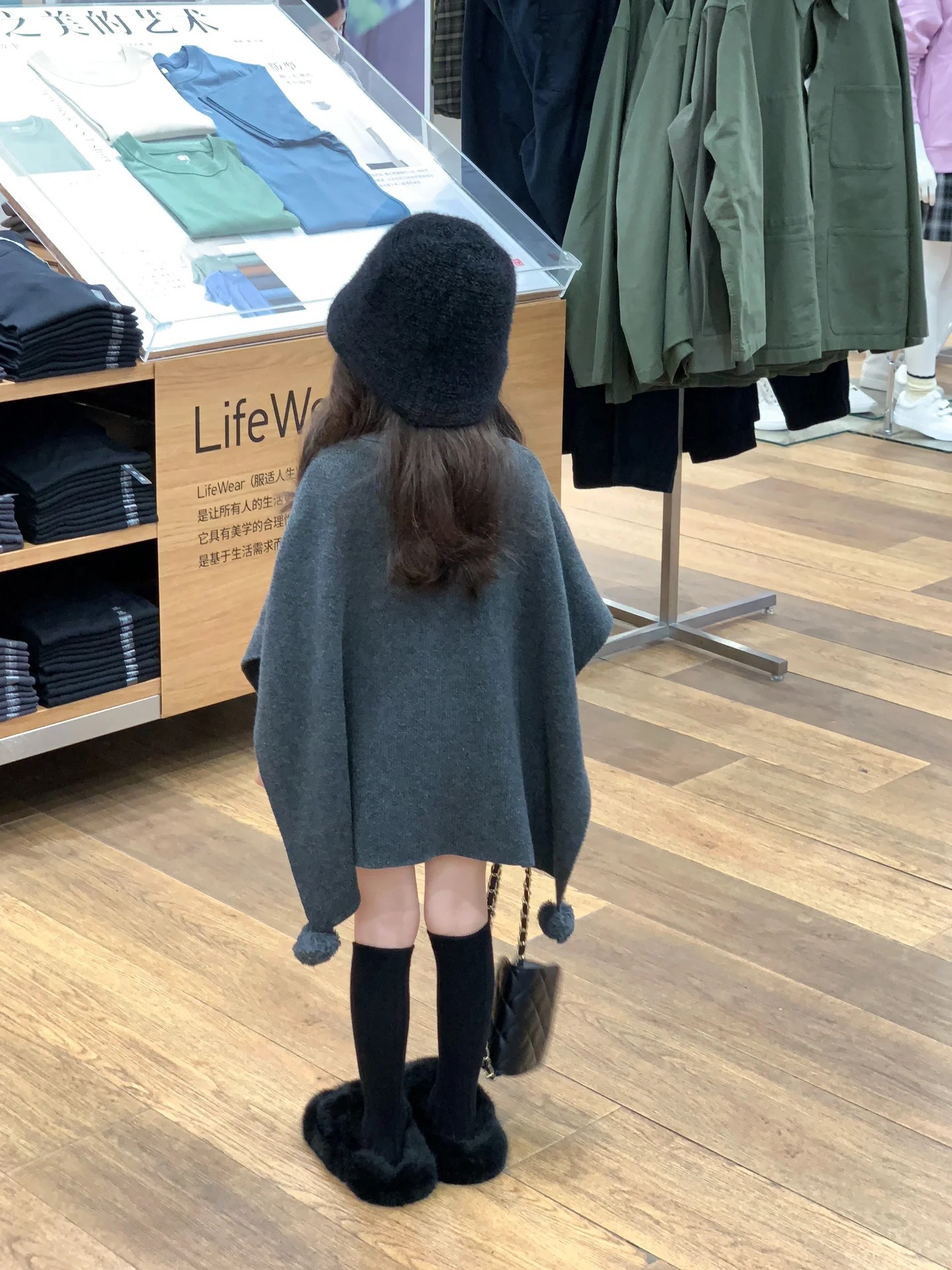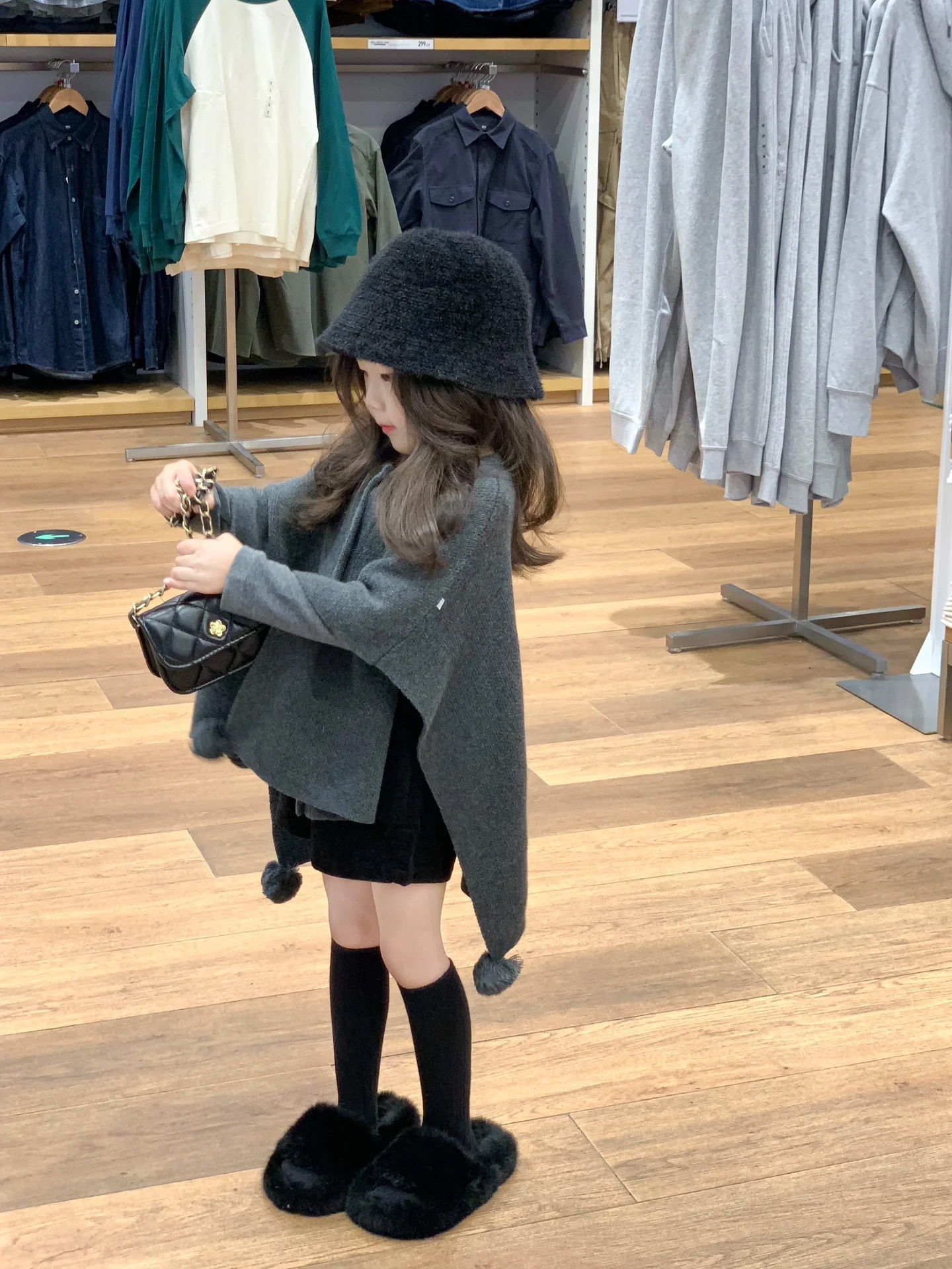 소녀의 봄 원피스 그레이 유행 니트 모피 볼 판초 느슨한 목도리 스웨터 블랙 반바지 분할 샷