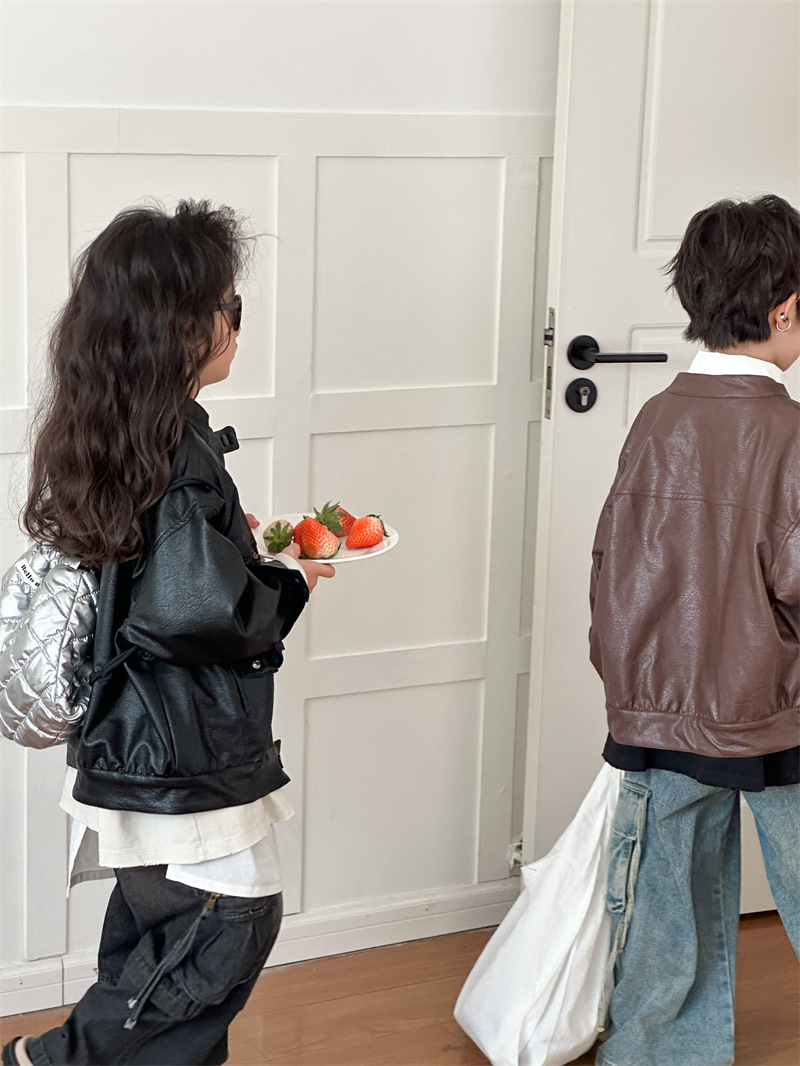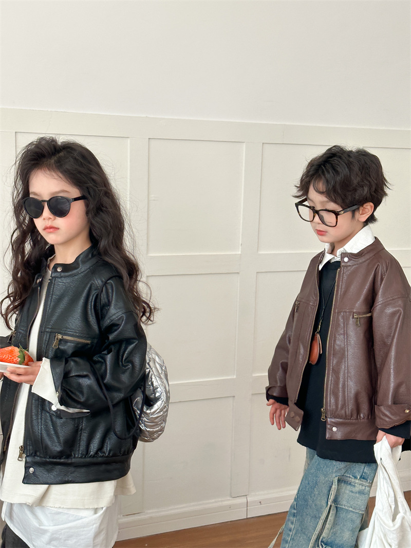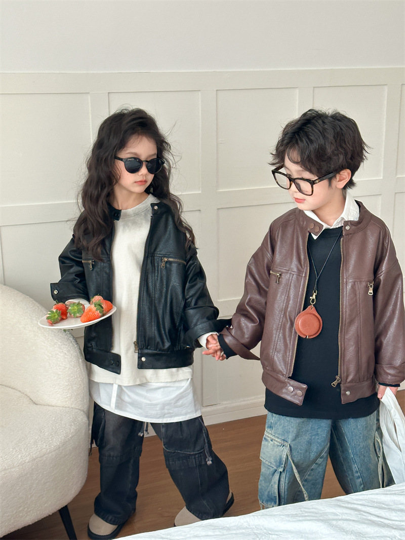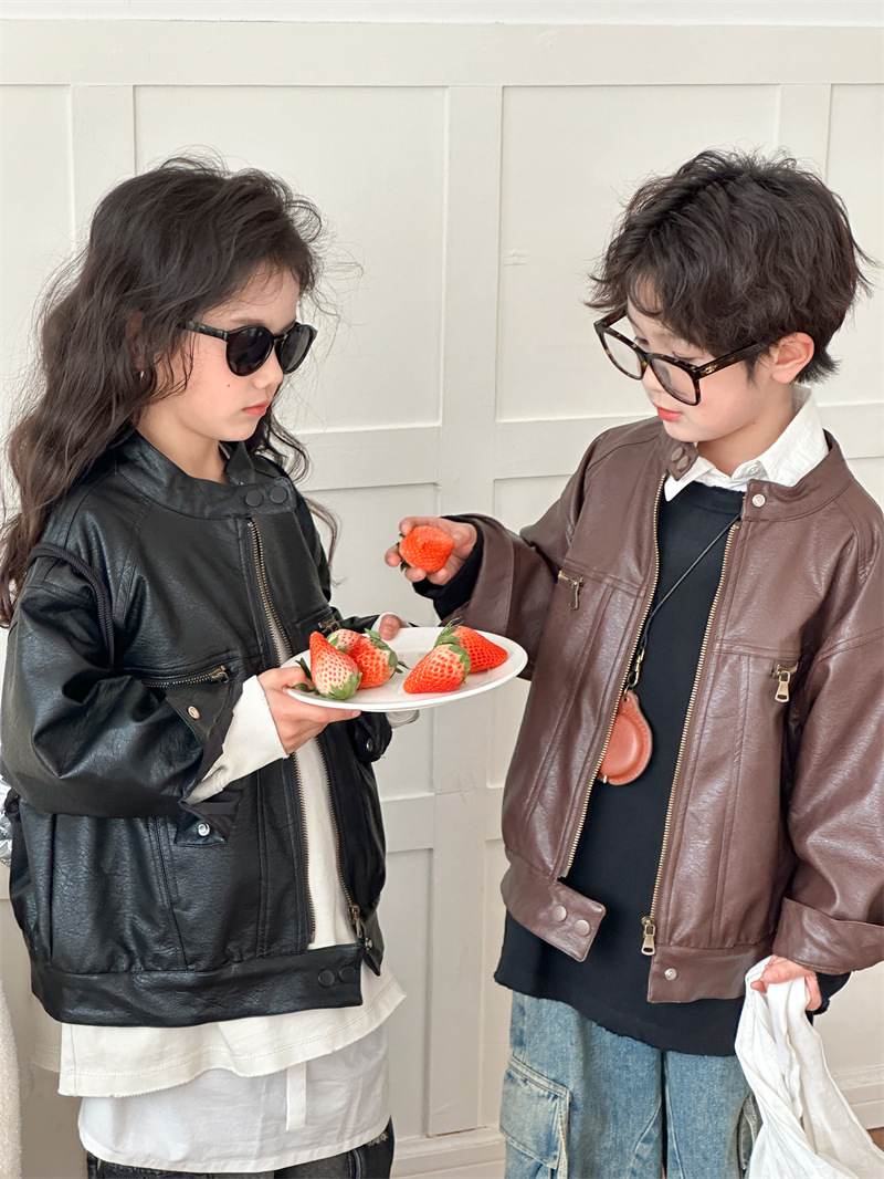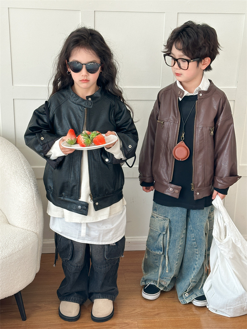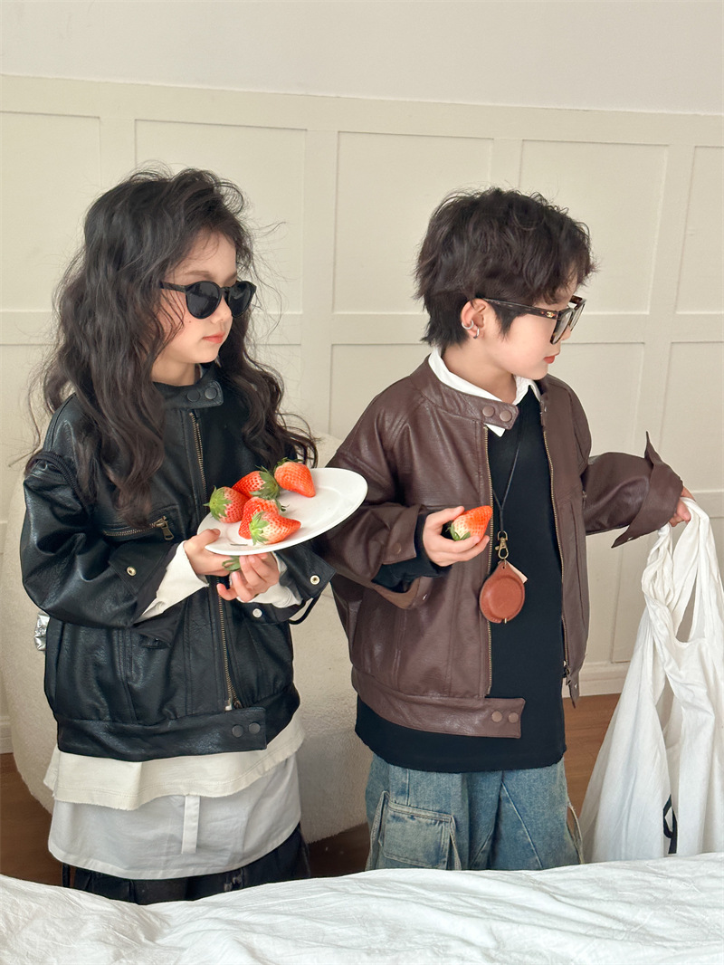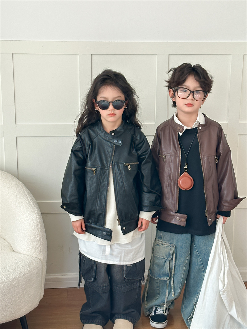 2024 봄 새로운 어린이 오토바이 가죽 코트 한국식 소년 소녀 스탠드 칼라 무거운 작업 재킷 디자인 가죽 코트스토어 가기