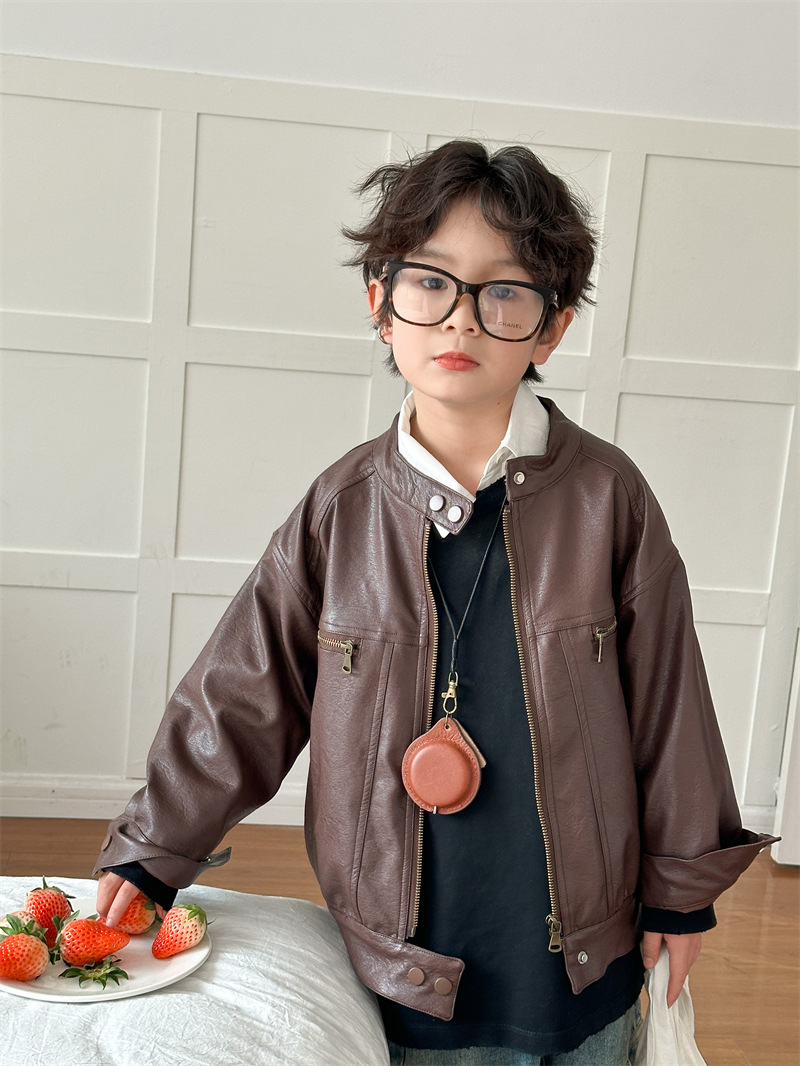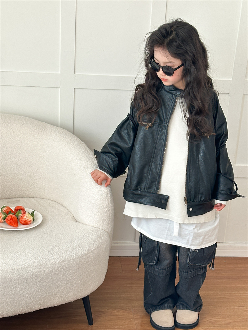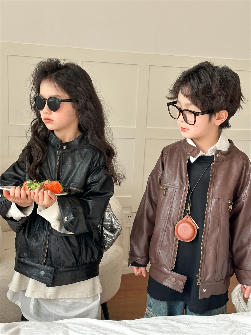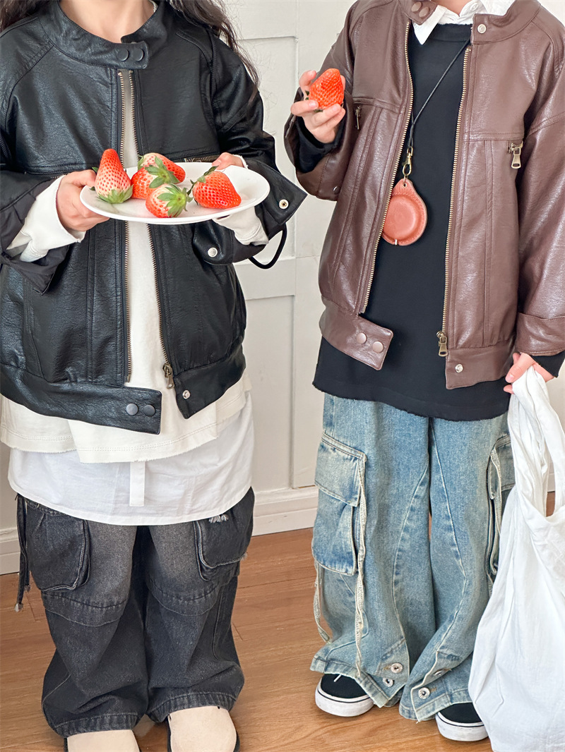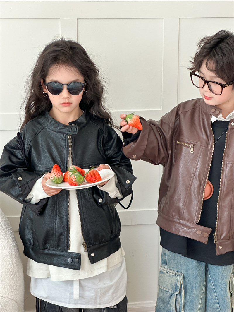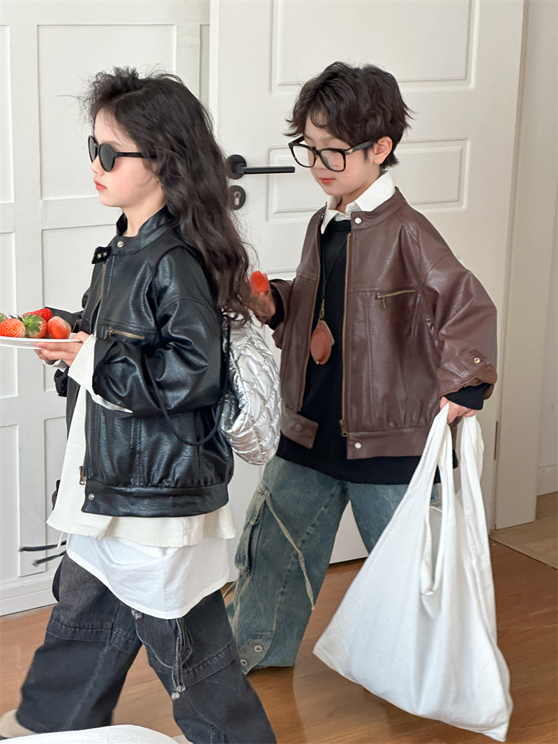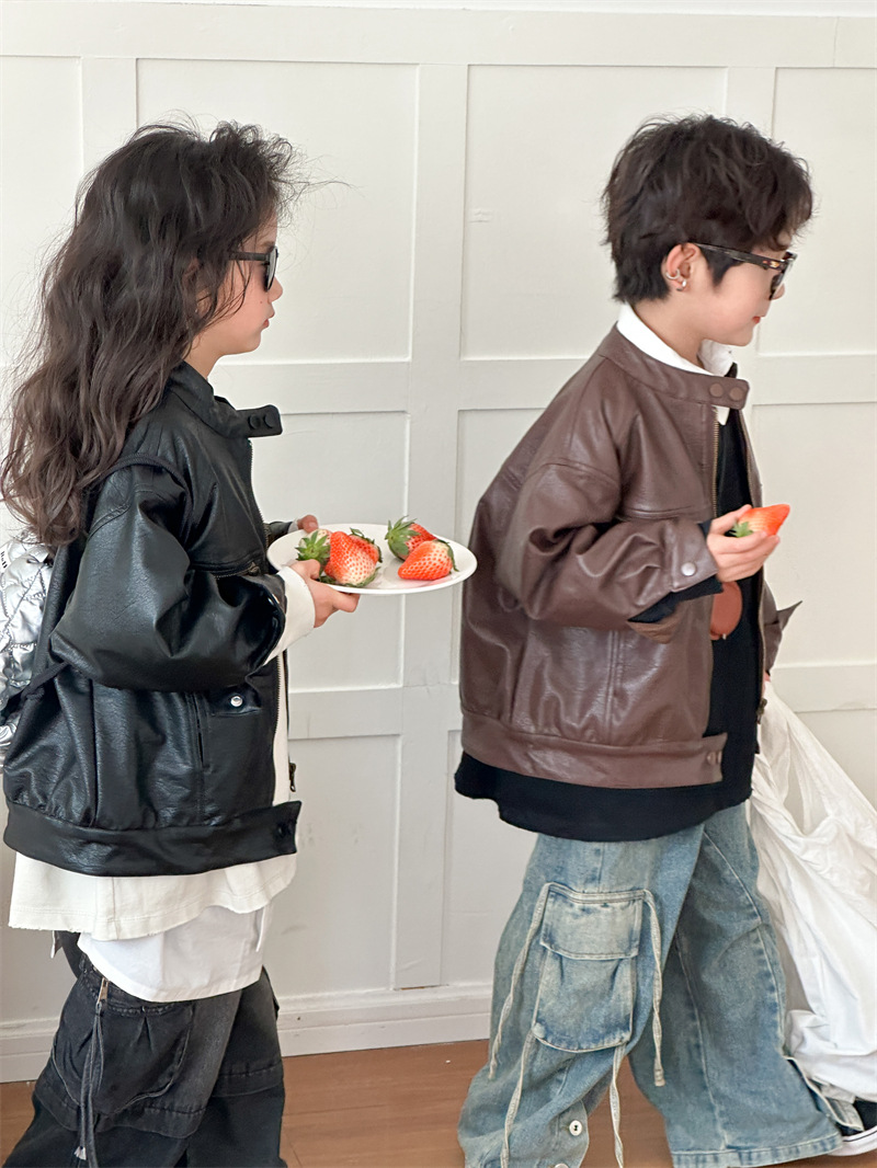 2024 봄 새로운 어린이 오토바이 가죽 코트 한국식 소년 소녀 스탠드 칼라 무거운 작업 재킷 디자인 가죽 코트스토어 가기