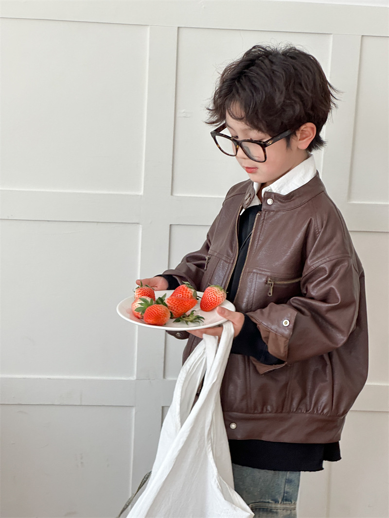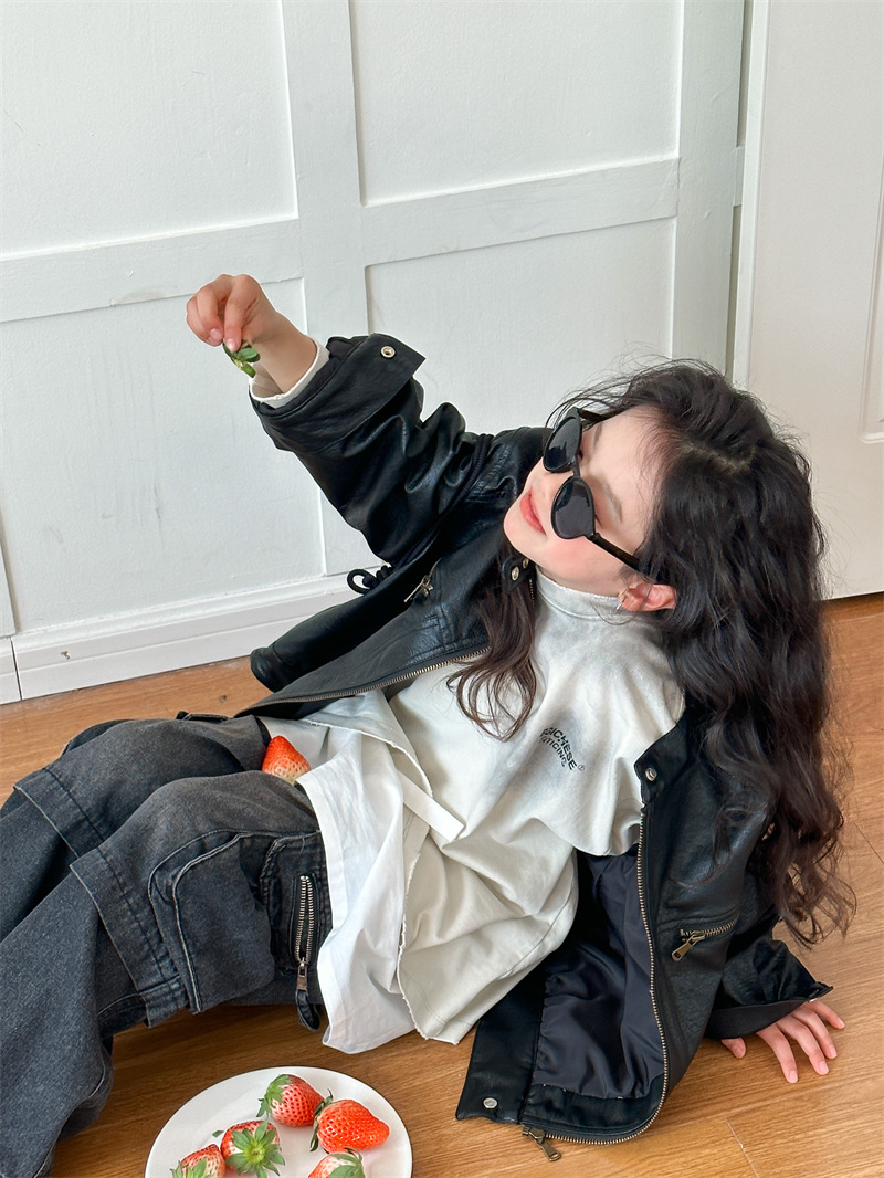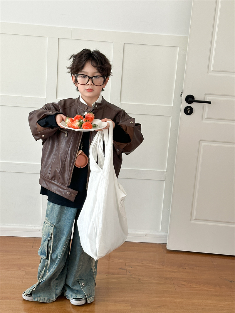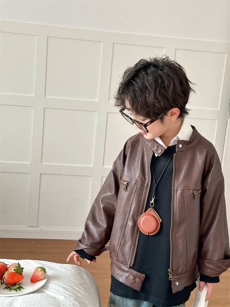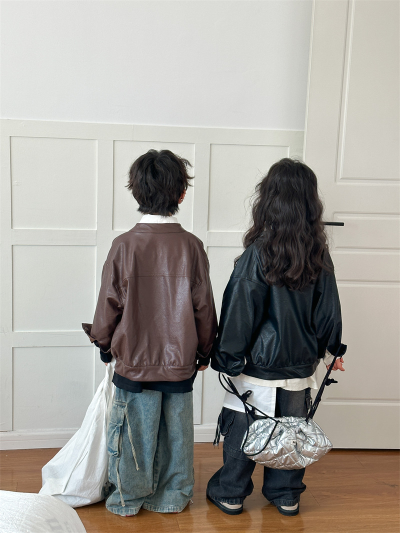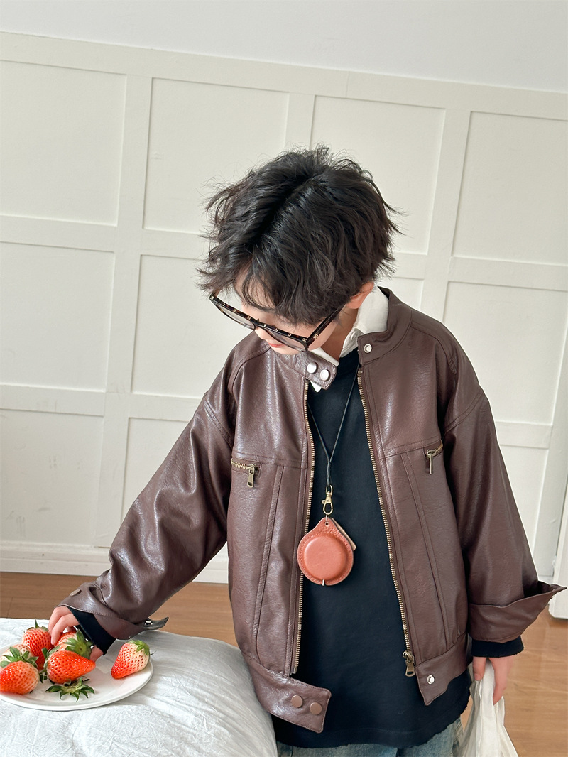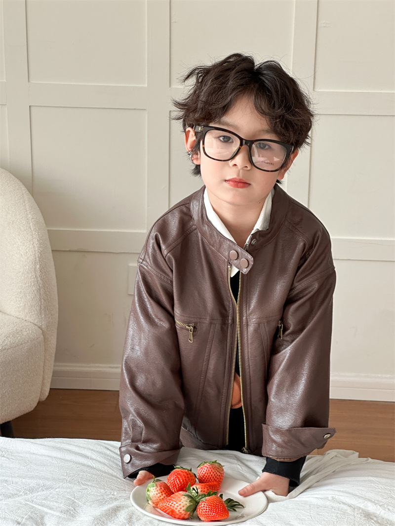 2024 봄 새로운 어린이 오토바이 가죽 코트 한국식 소년 소녀 스탠드 칼라 무거운 작업 재킷 디자인 가죽 코트스토어 가기