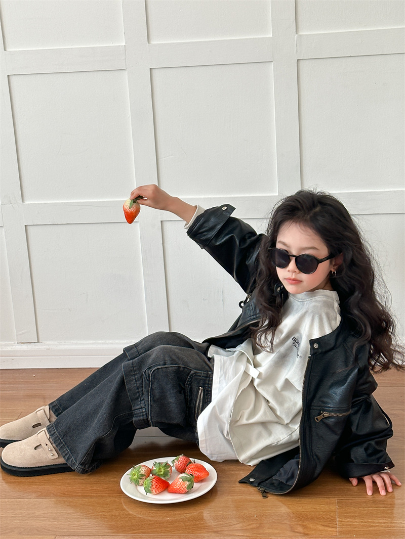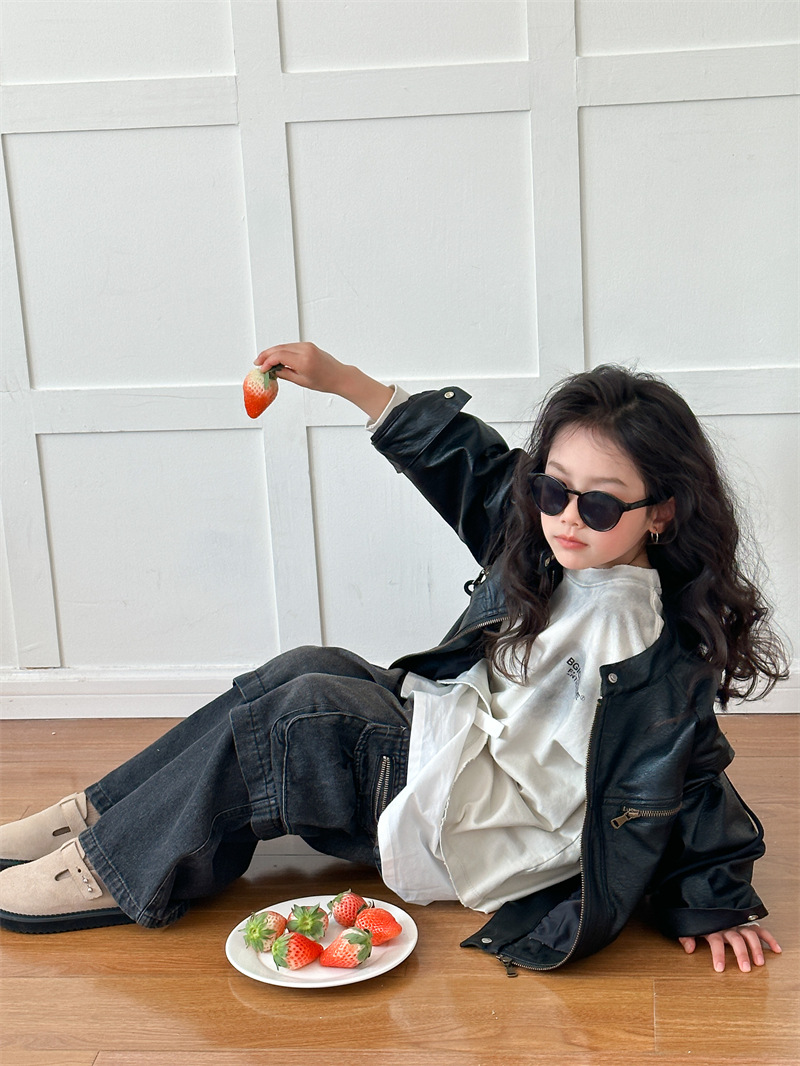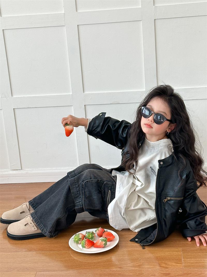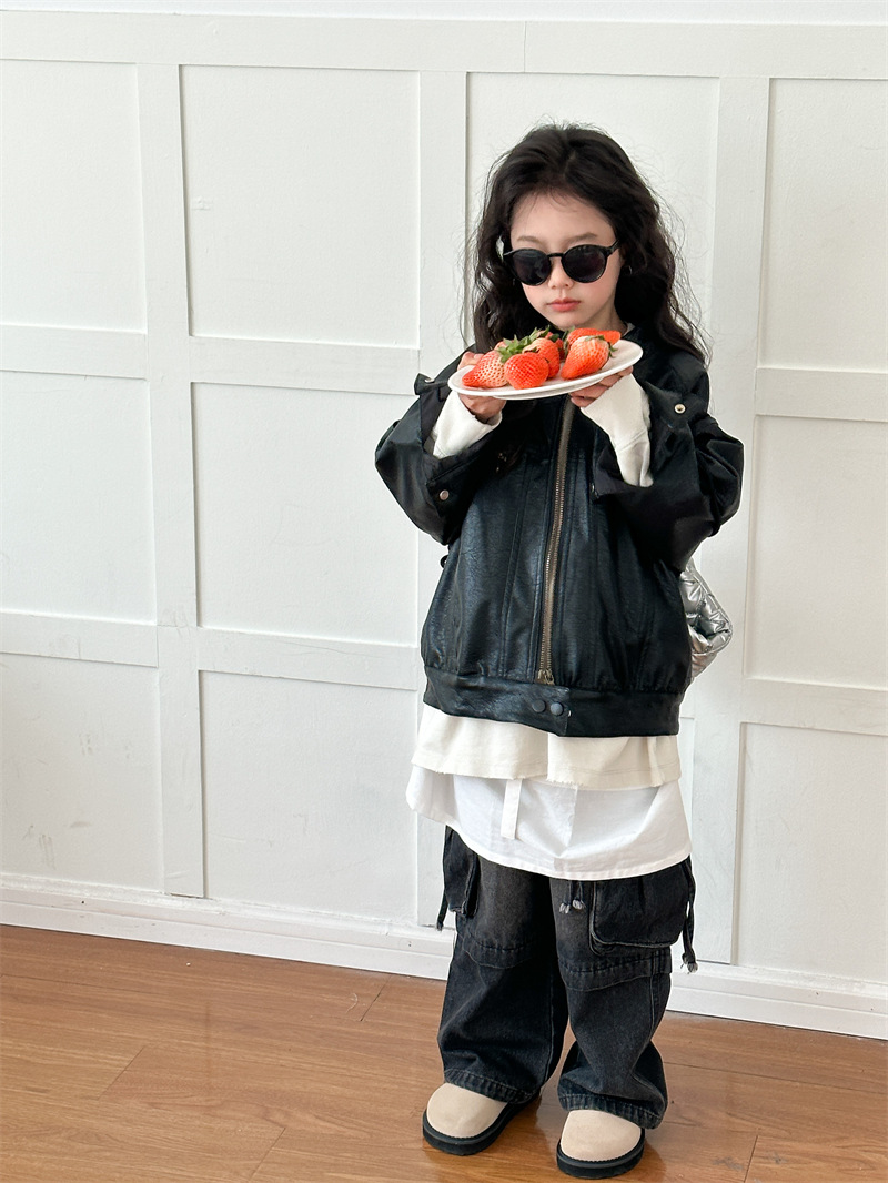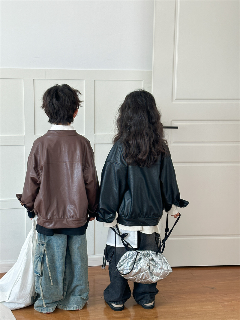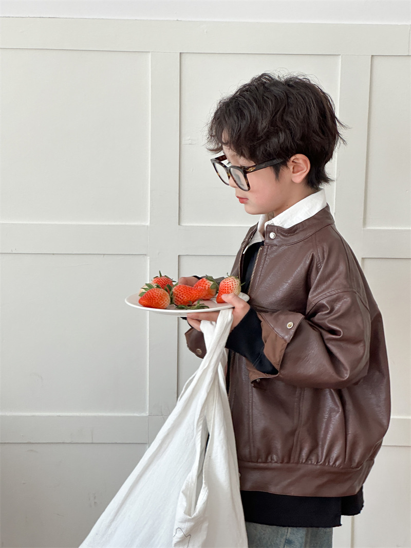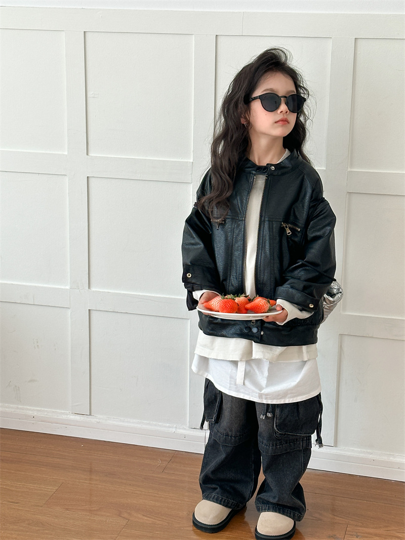 2024 봄 새로운 어린이 오토바이 가죽 코트 한국식 소년 소녀 스탠드 칼라 무거운 작업 재킷 디자인 가죽 코트스토어 가기