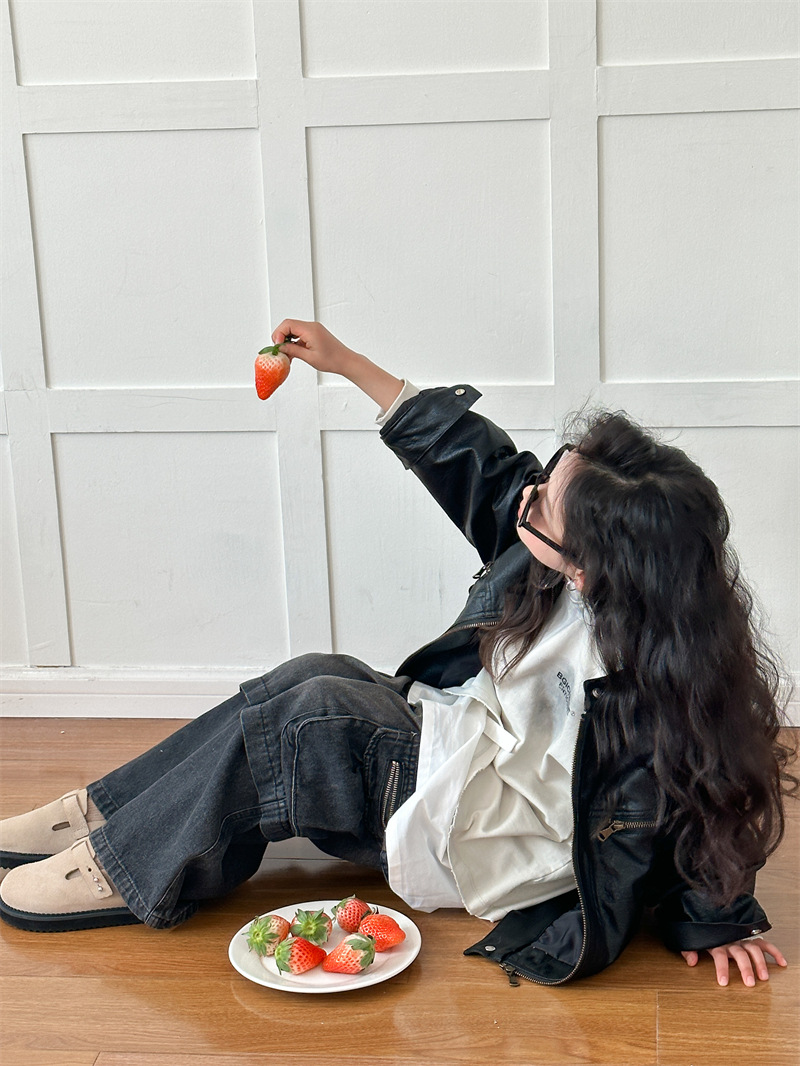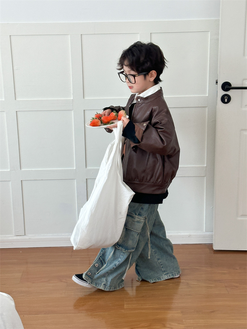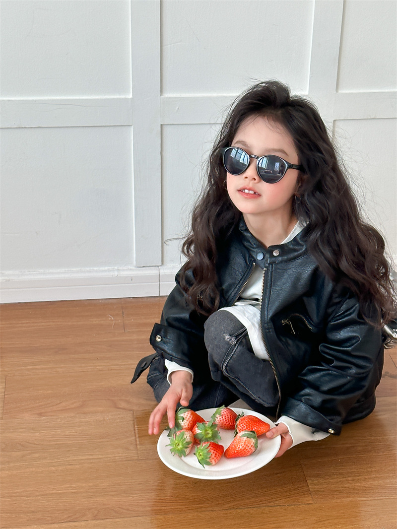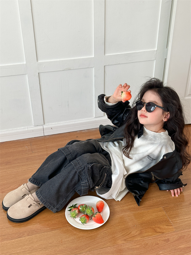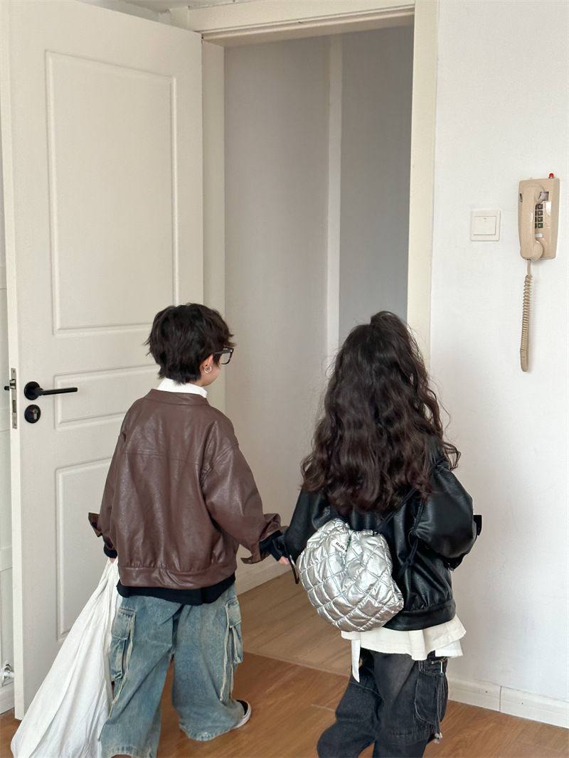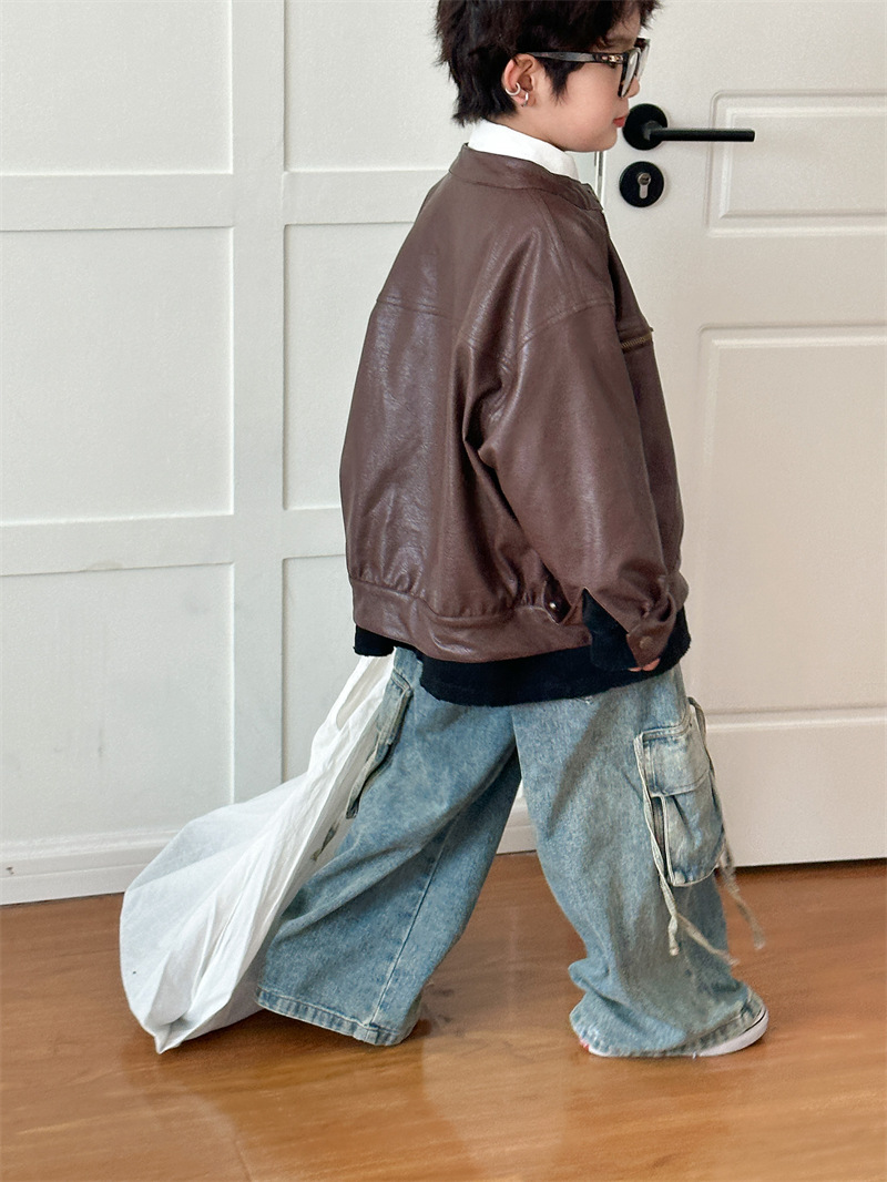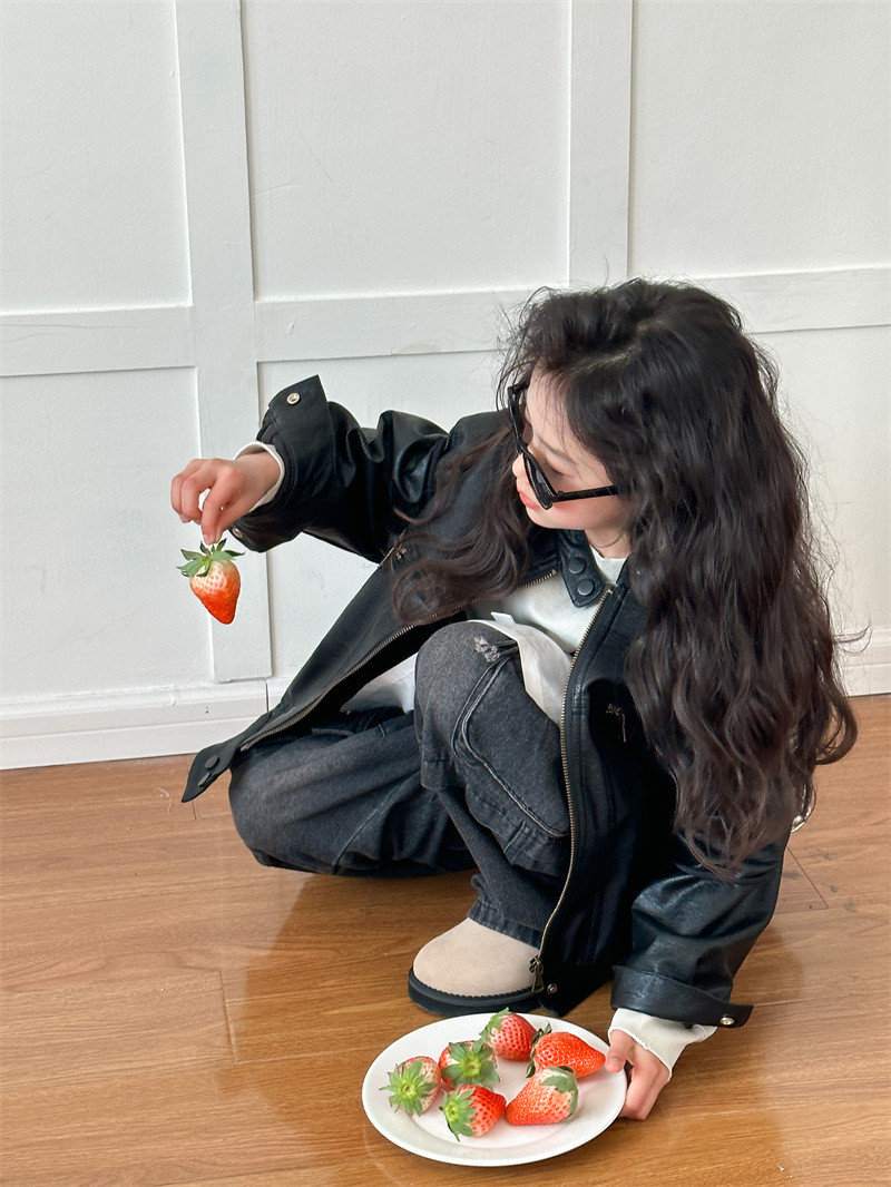 2024 봄 새로운 어린이 오토바이 가죽 코트 한국식 소년 소녀 스탠드 칼라 무거운 작업 재킷 디자인 가죽 코트스토어 가기