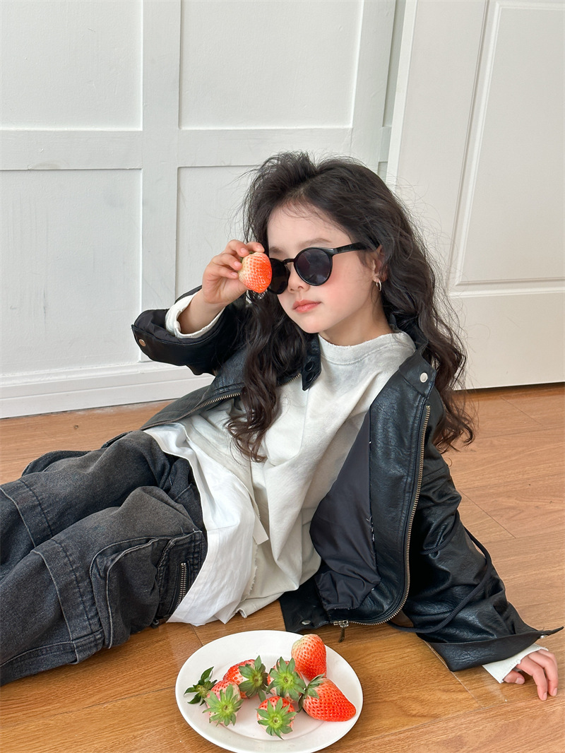 2024 봄 새로운 어린이 오토바이 가죽 코트 한국식 소년 소녀 스탠드 칼라 무거운 작업 재킷 디자인 가죽 코트