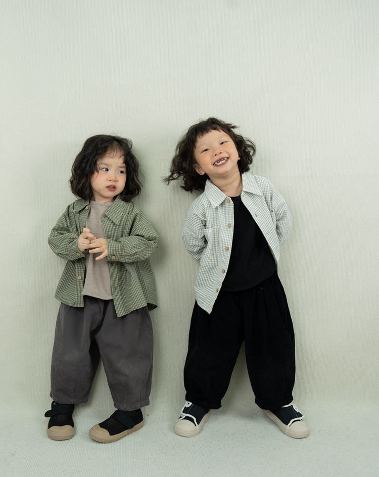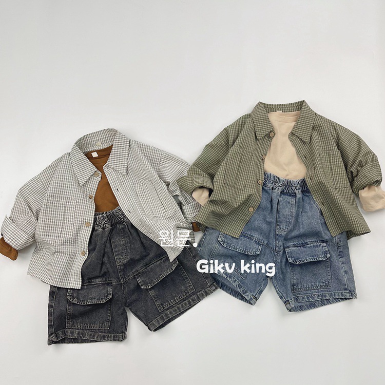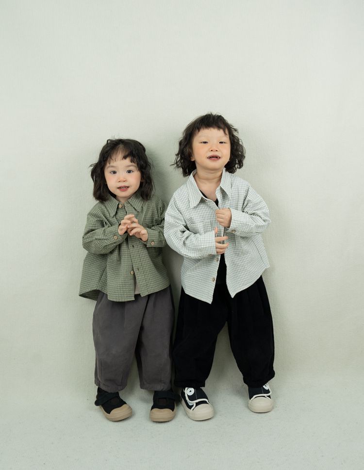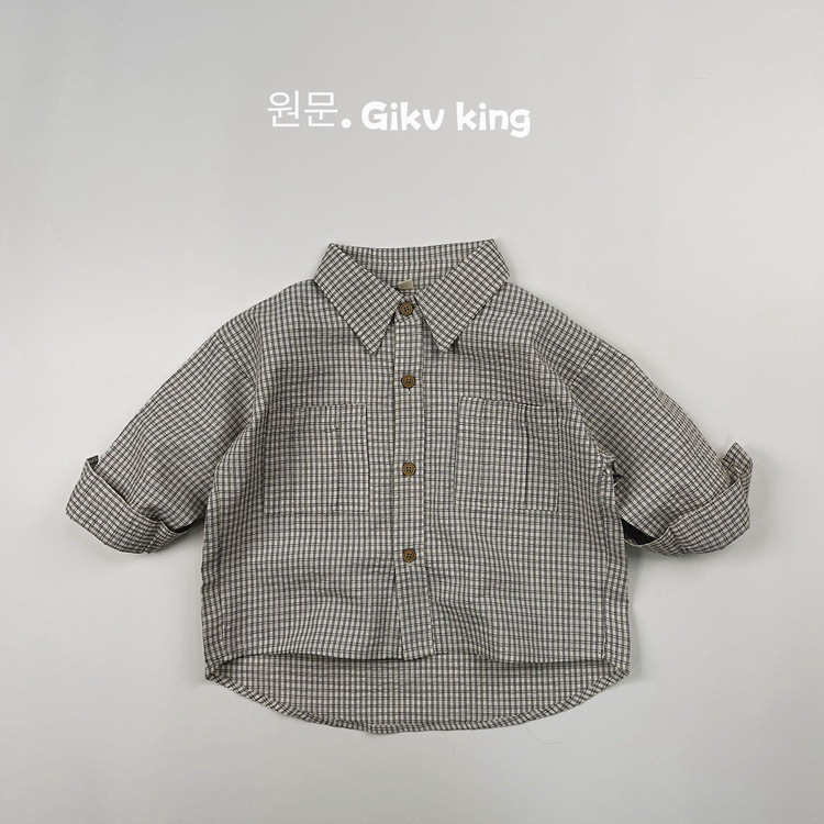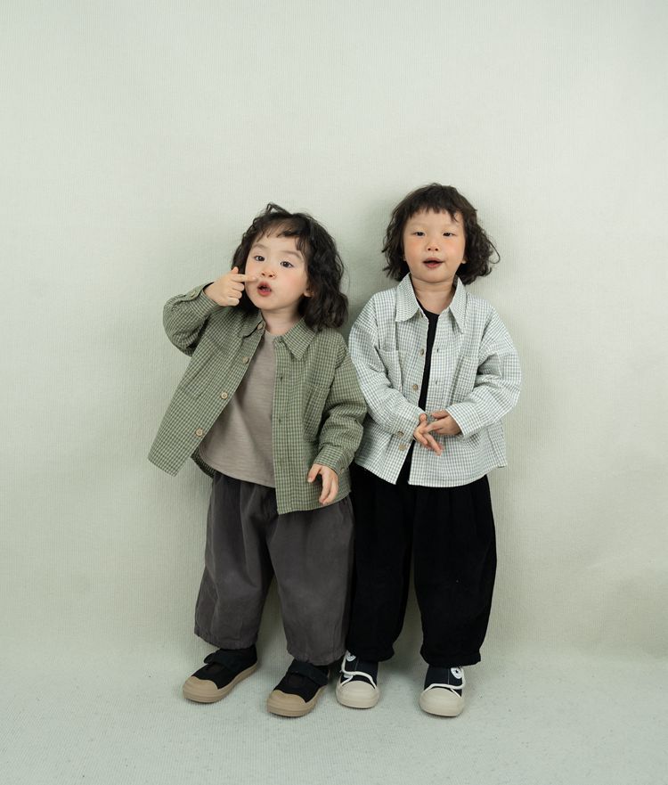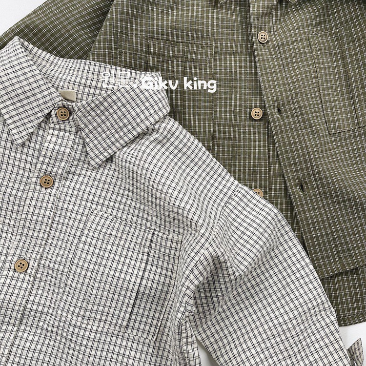 레트로 신선한 작은 옷깃 한국 스타일 어린이 격자 무늬 셔츠 24 봄 새 소년과 소녀 대칭 포켓 캐주얼 셔츠스토어 가기