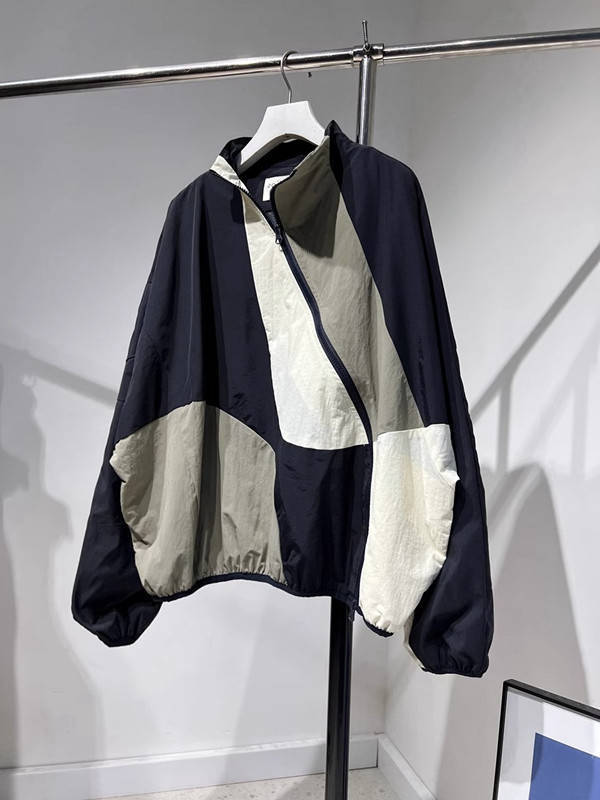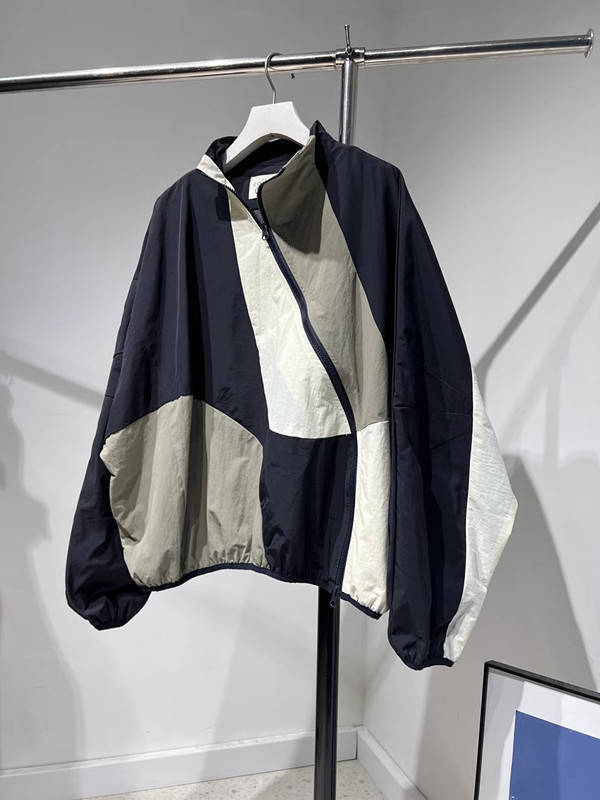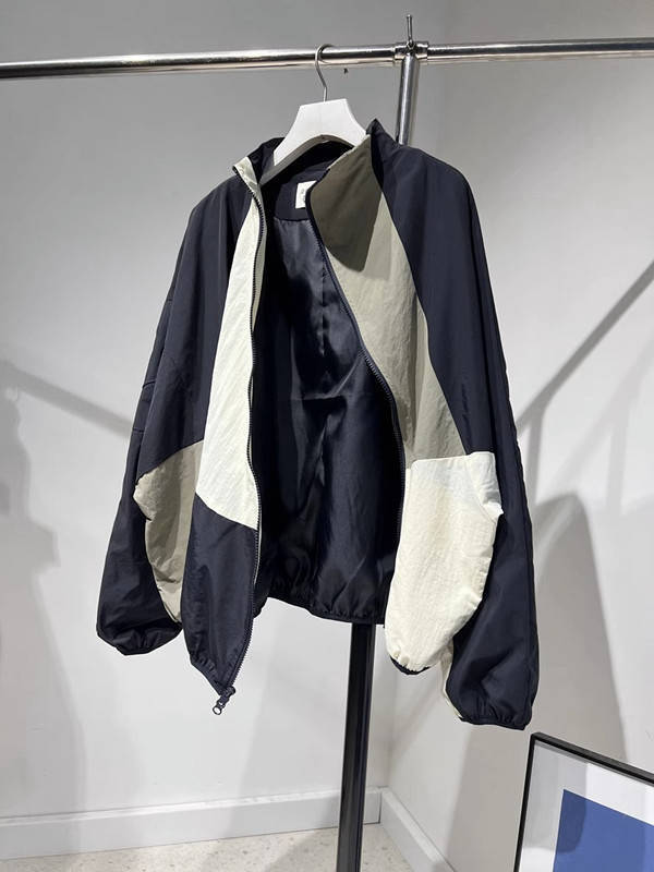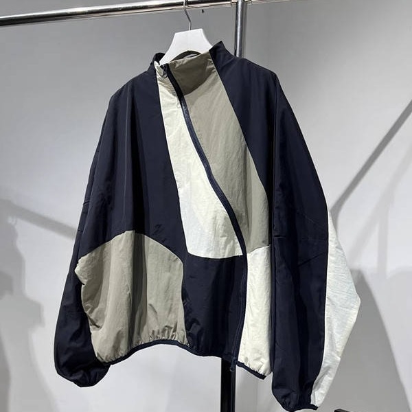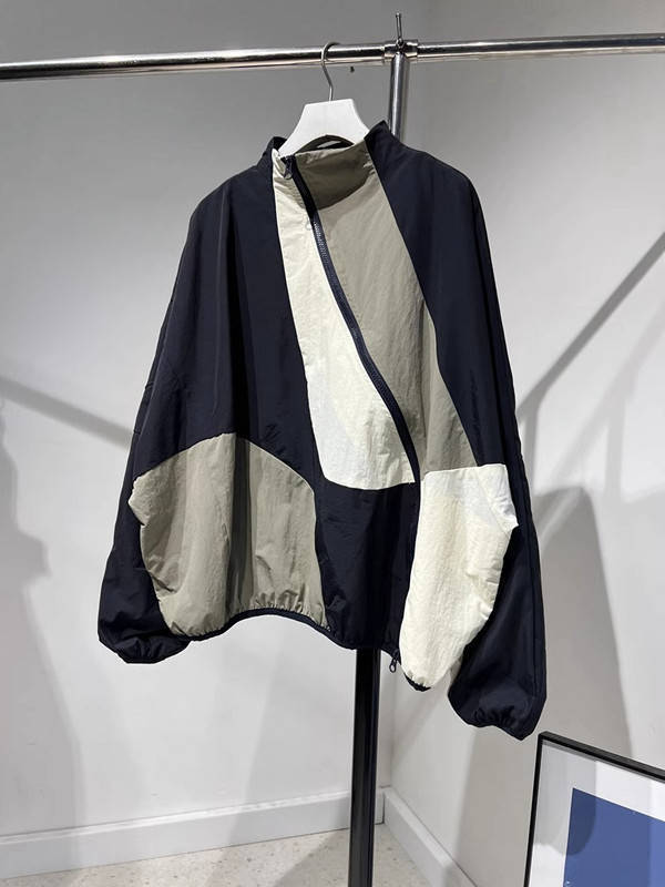 유럽 상품 대비 색상 스티칭 독특한 세련된 오비큐 플래켓 재킷 여성의 느슨한 짧은 스탠딩 칼라 코트 재킷 가을스토어 가기