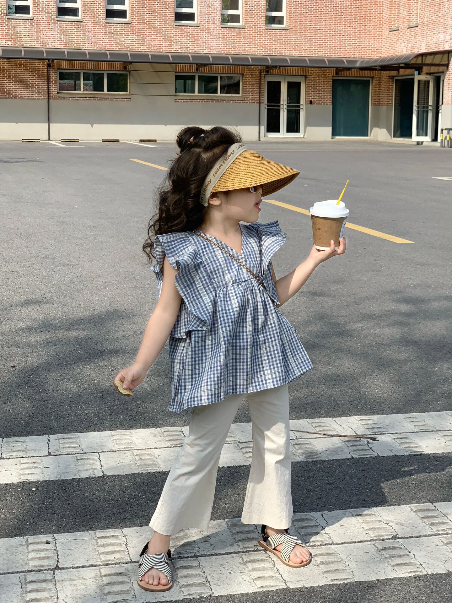 어린이 의류 여름 소녀 Xiaoqing 새로운 격자 무늬 비행 소매 인형 셔츠 유행 최고 달콤한 조끼 셔츠 대외 무역