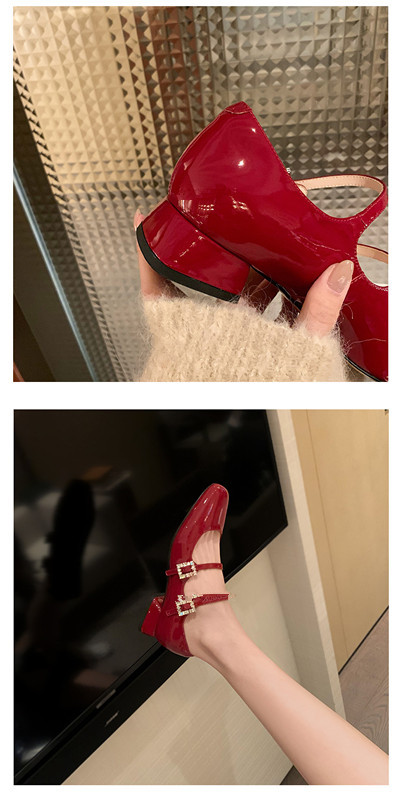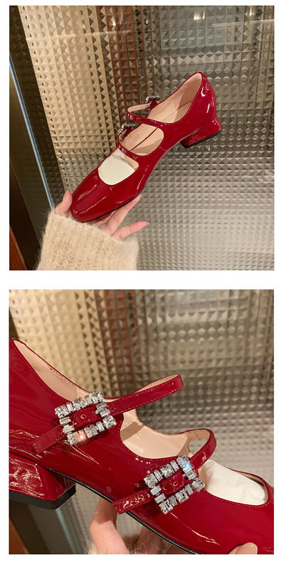 프렌치 스타일 메리제인 슈즈, 봄철 원스트랩, 라인스톤 스퀘어토 하이힐, 두꺼운 굽 가죽 슈즈, 레트로
