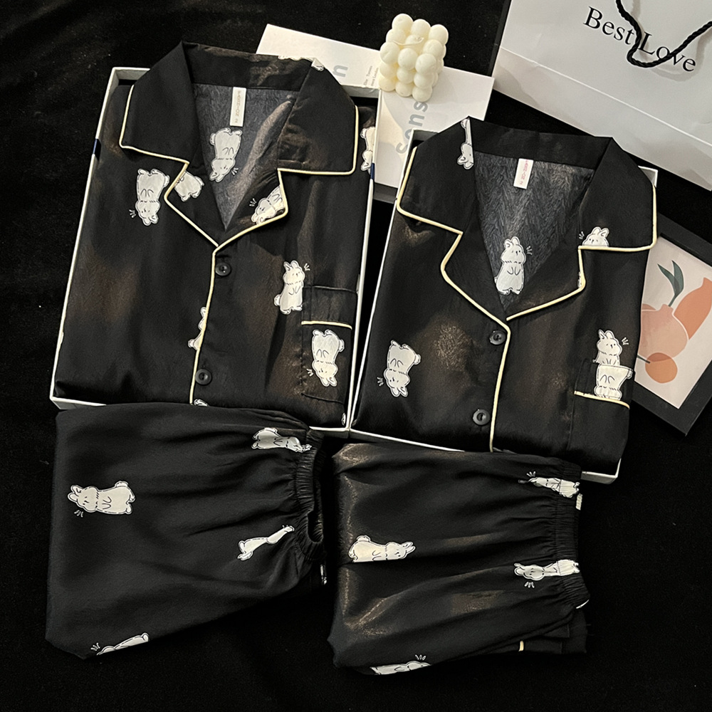 커플 잠옷 여성의 봄과 가을 얼음 실크 긴 소매 귀여운 만화 토끼 진짜 실크 남성 플러스 사이즈 홈 착용 여름과 겨울
