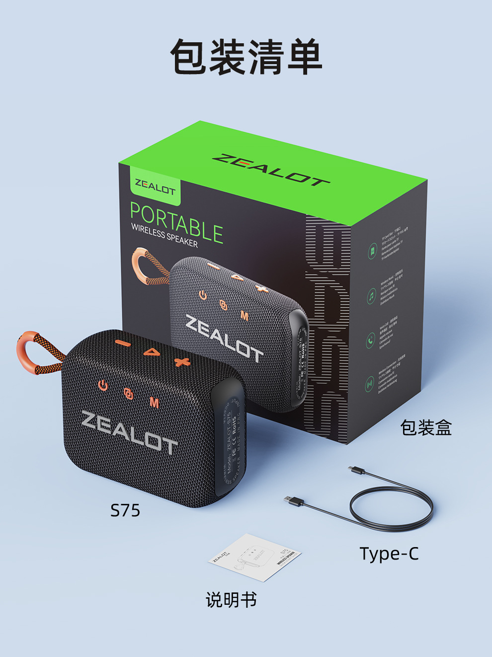 产品配件:音箱+充电线+说明书