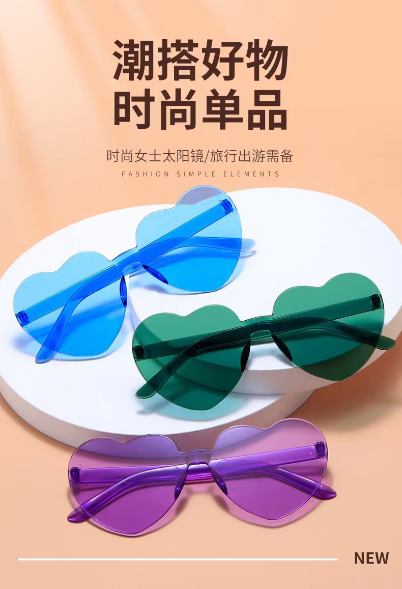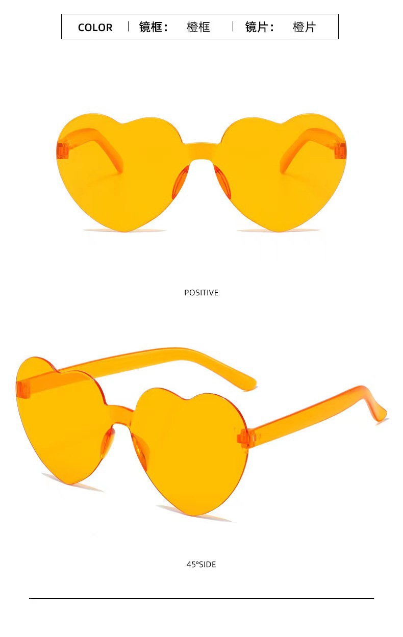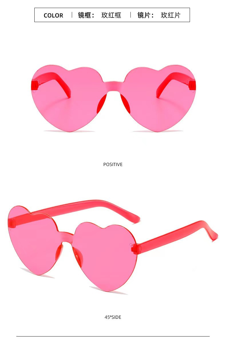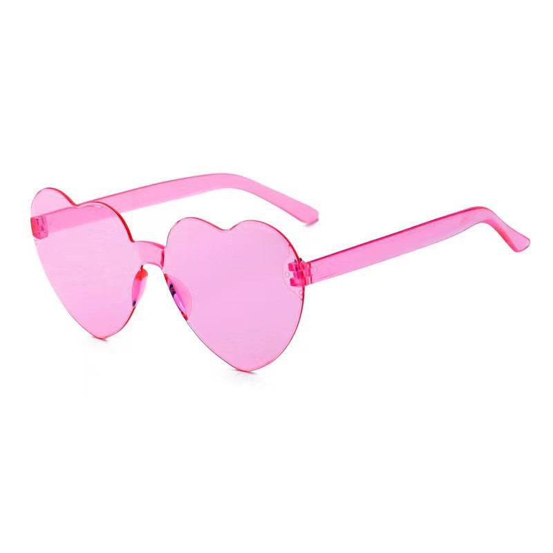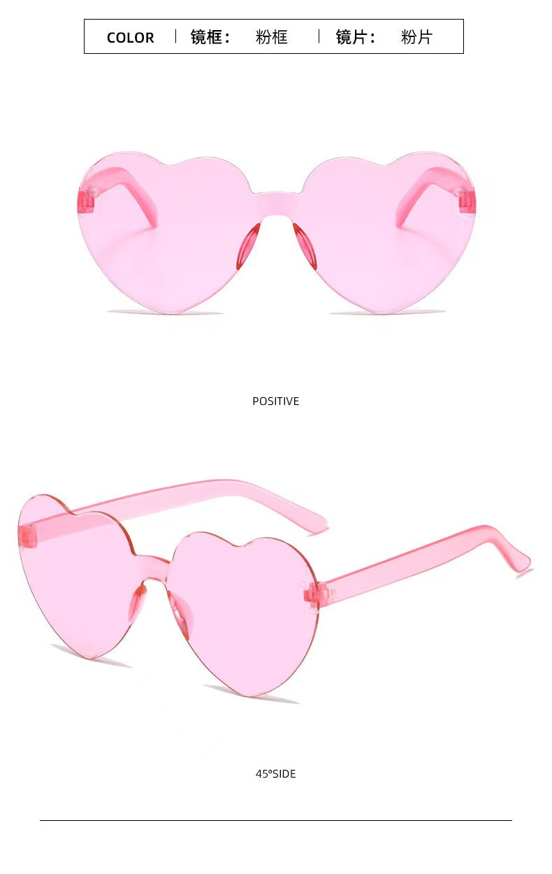 새로운 투명 젤리 컬러 복숭아 심장 선글라스 유럽과 미국 패션 프레임리스 원피스 오션 선글라스 사랑 하트 모양의 안경