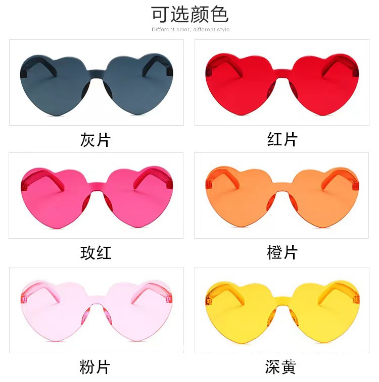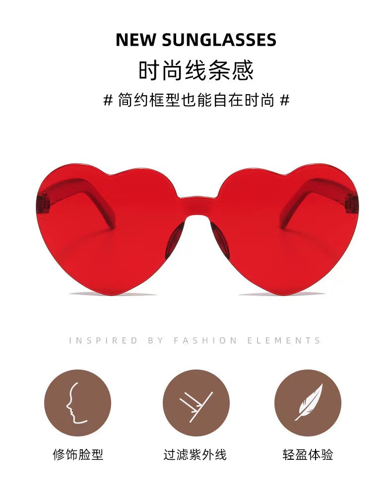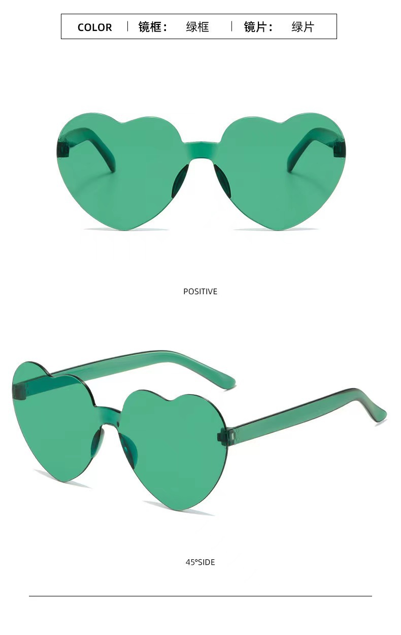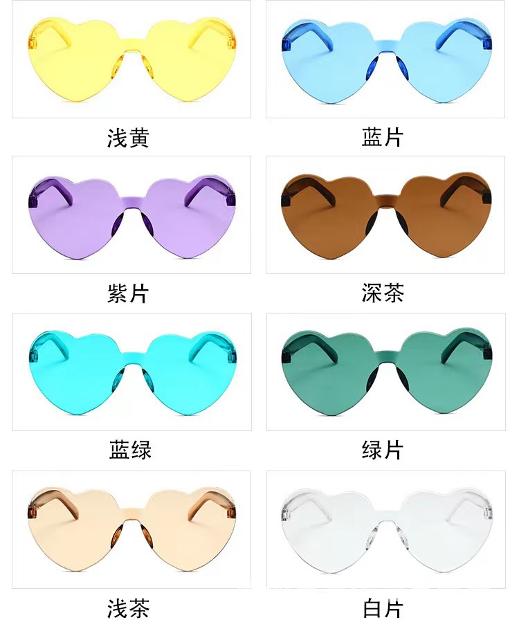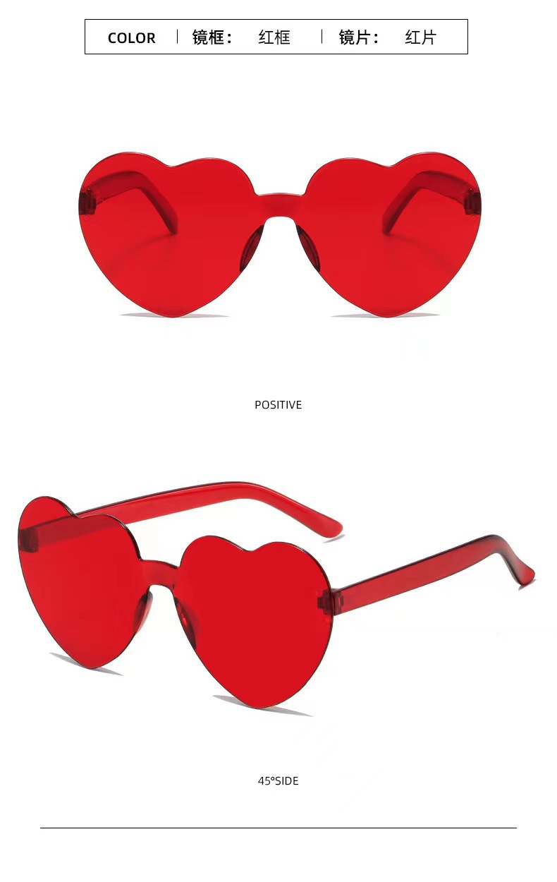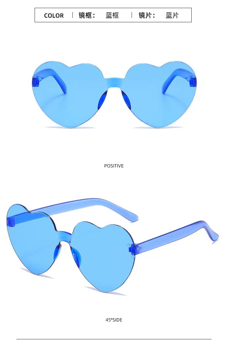 새로운 투명 젤리 컬러 복숭아 심장 선글라스 유럽과 미국 패션 프레임리스 원피스 오션 선글라스 사랑 하트 모양의 안경