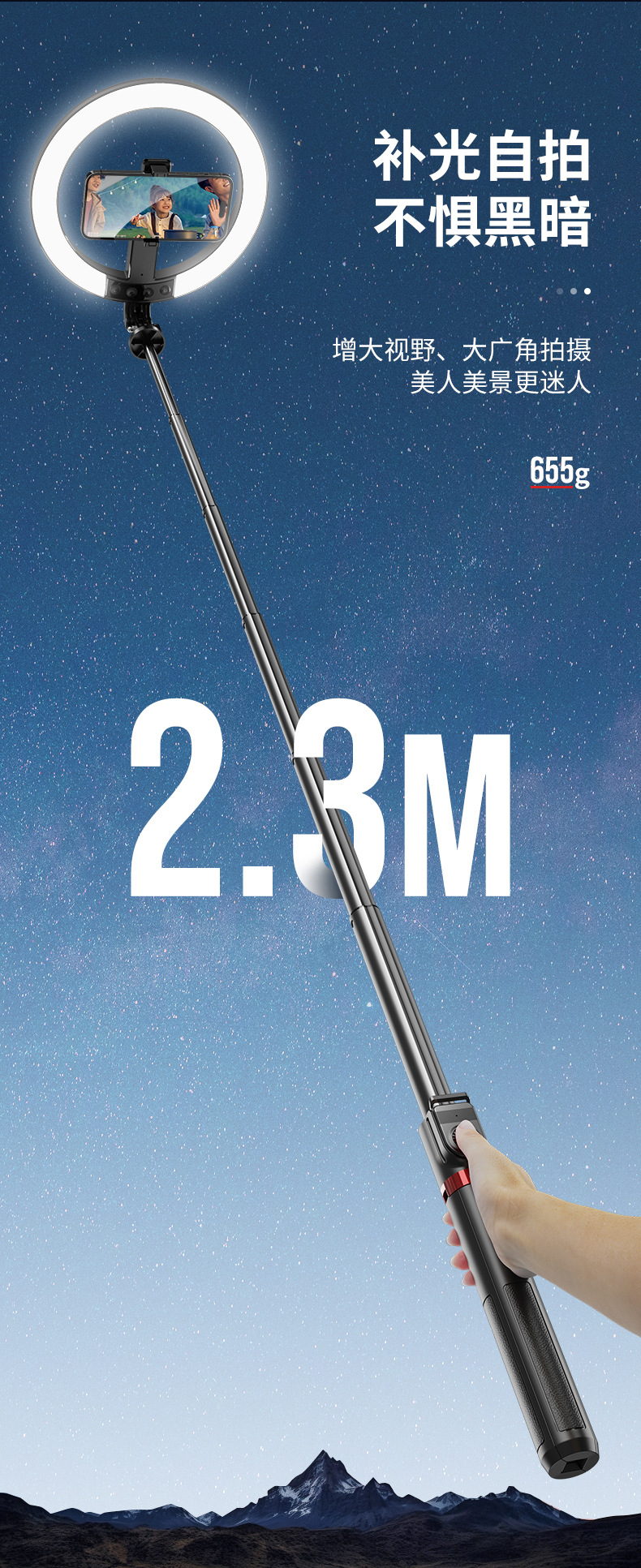 새로운 2.3m 범용 휴대 전화 셀카 스틱 라이브 방송 바닥 채우기 빛 야외 휴대 전화 셀카 앵커 라이브 방송 브래킷