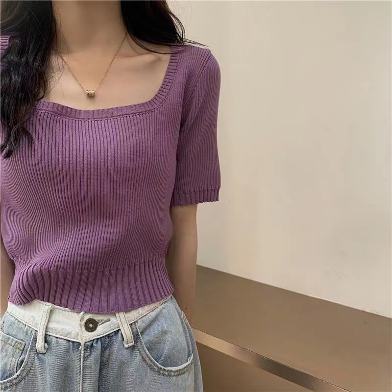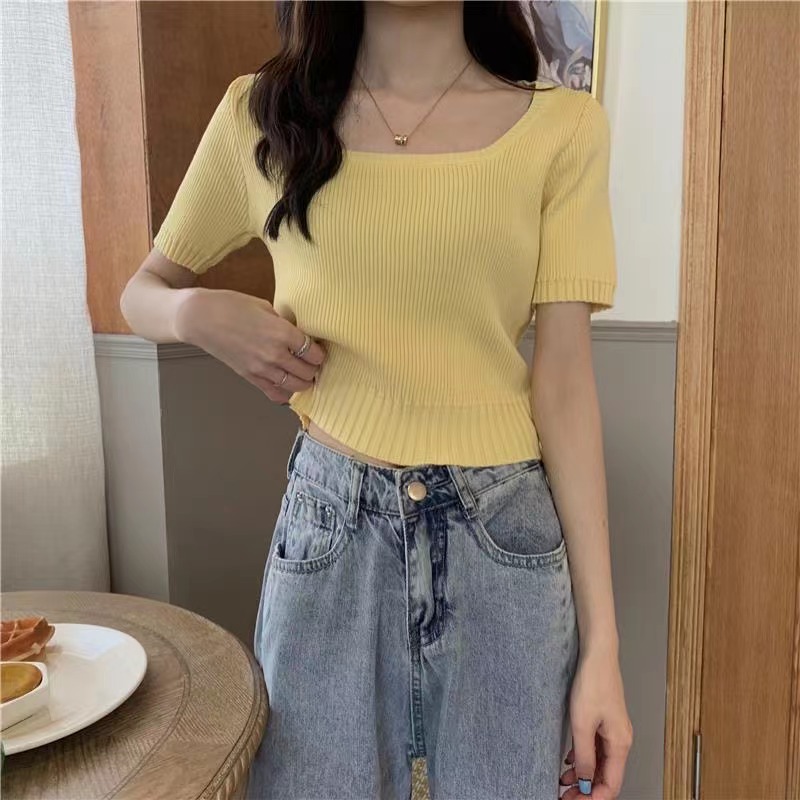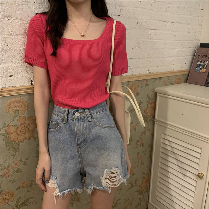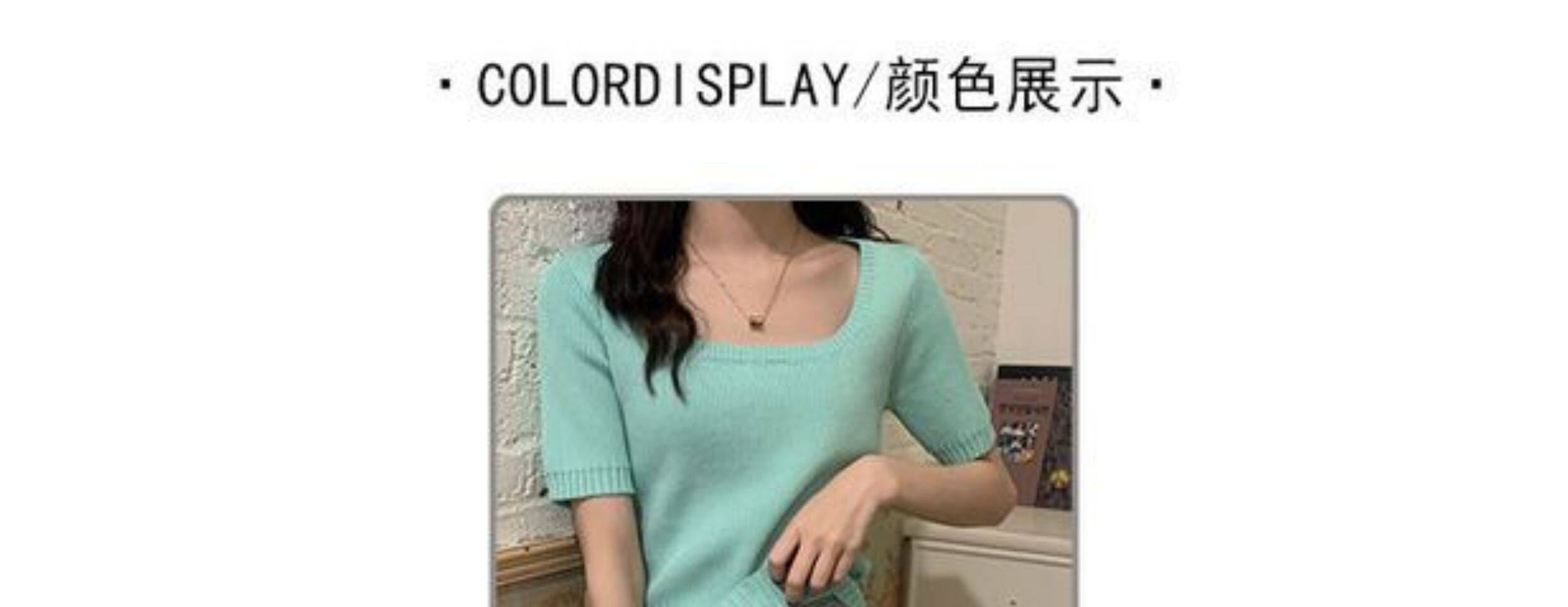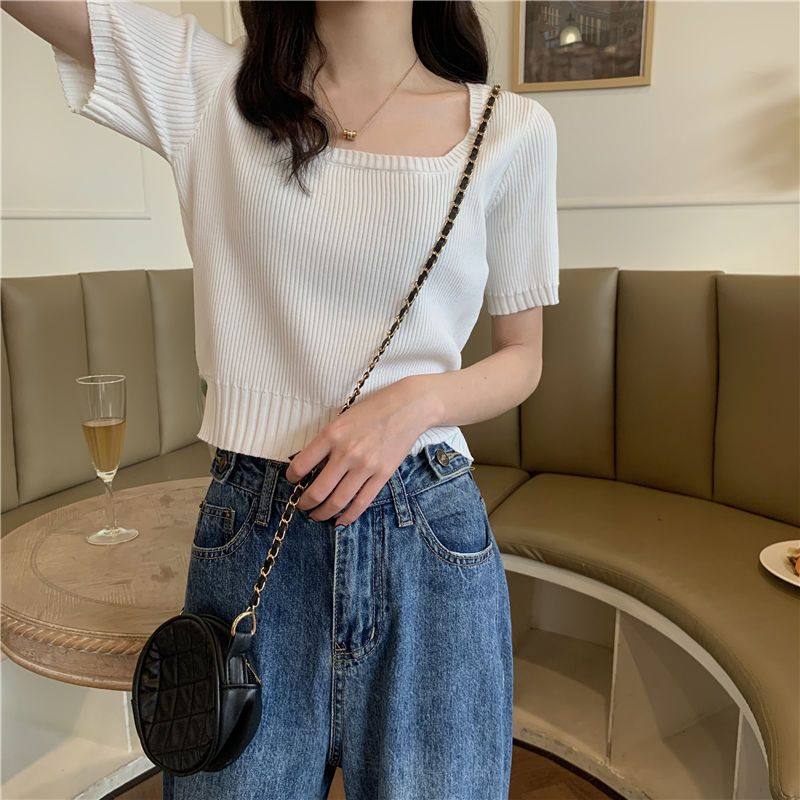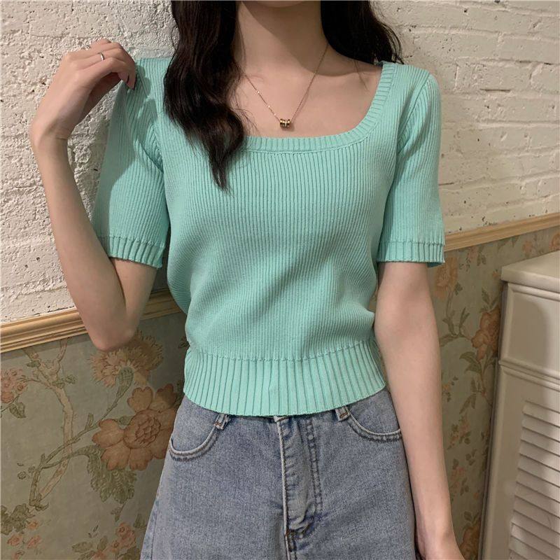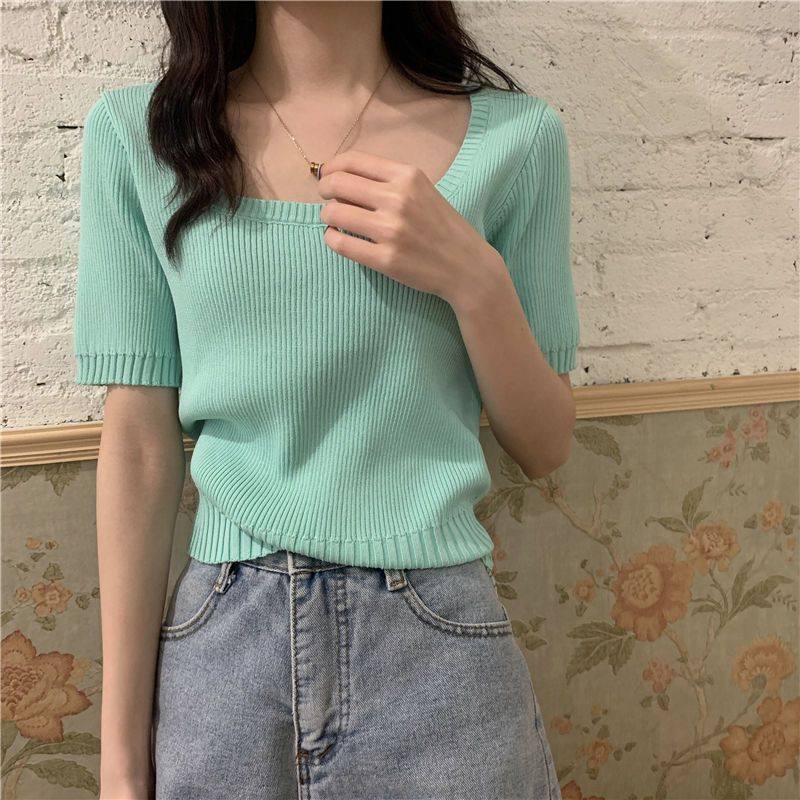 반팔 스퀘어 칼라 탑 의류 여성의 2023 새로운 봄과 여름 아이스 실크 니트웨어 얇은 슬림 핏 슬리밍 인즈 트렌디스토어 가기