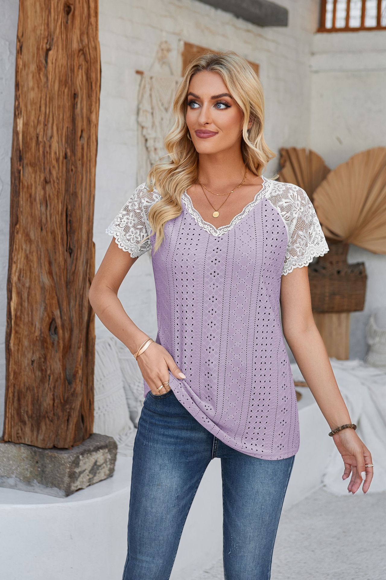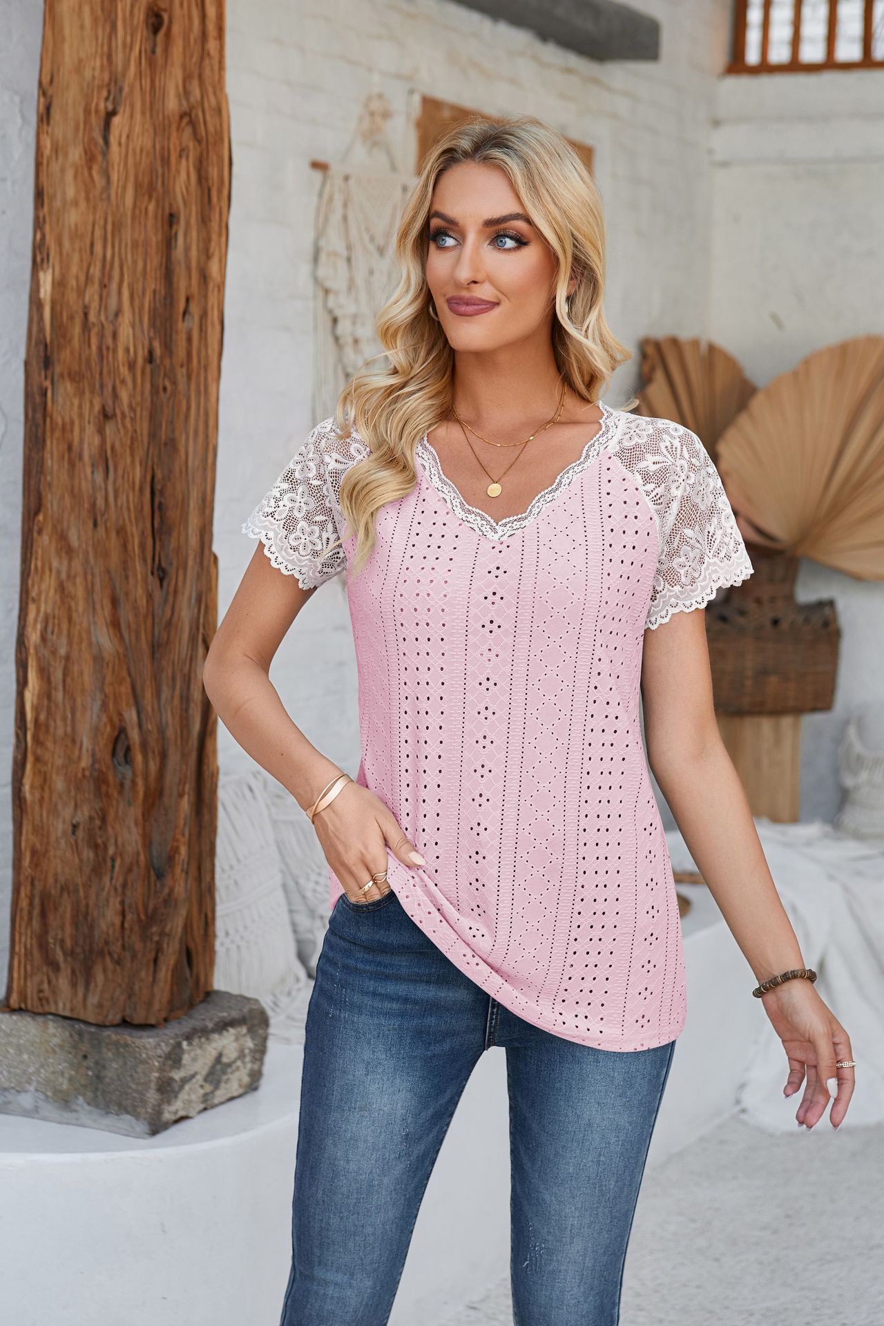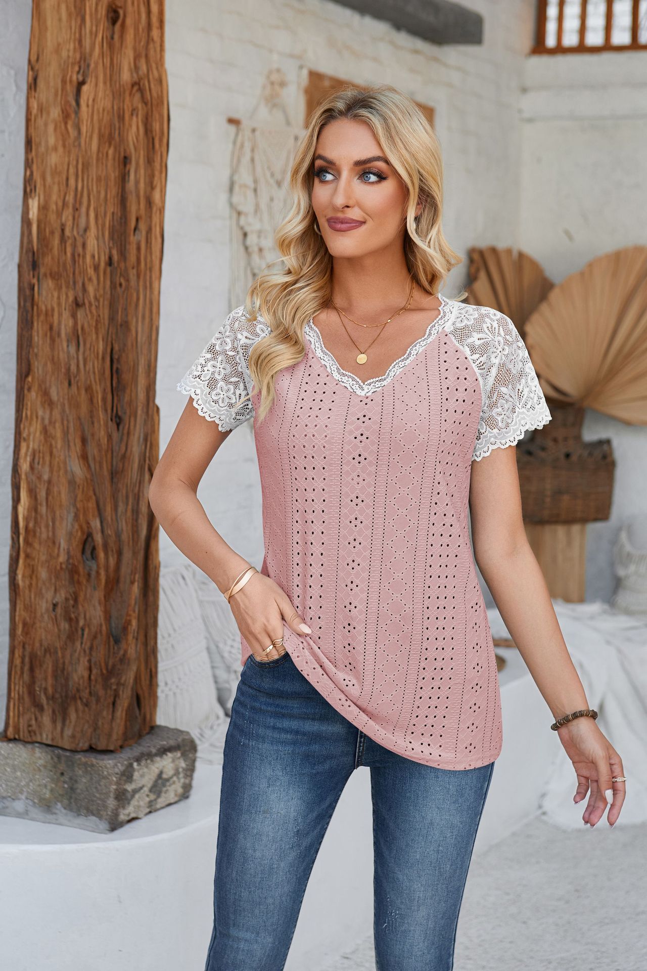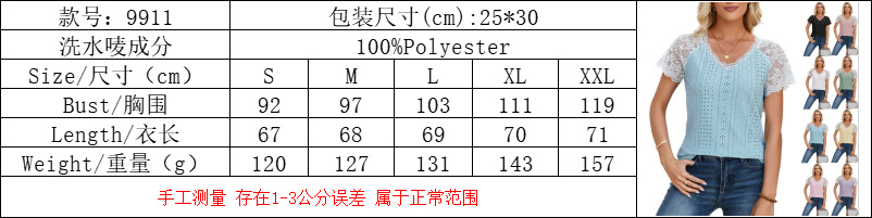 유럽과 미국 국경 대외 무역 여성의 2024 아마존 봄과 여름 새로운 V-넥 레이스 스티칭 느슨한 캐주얼 아일렛 티셔츠