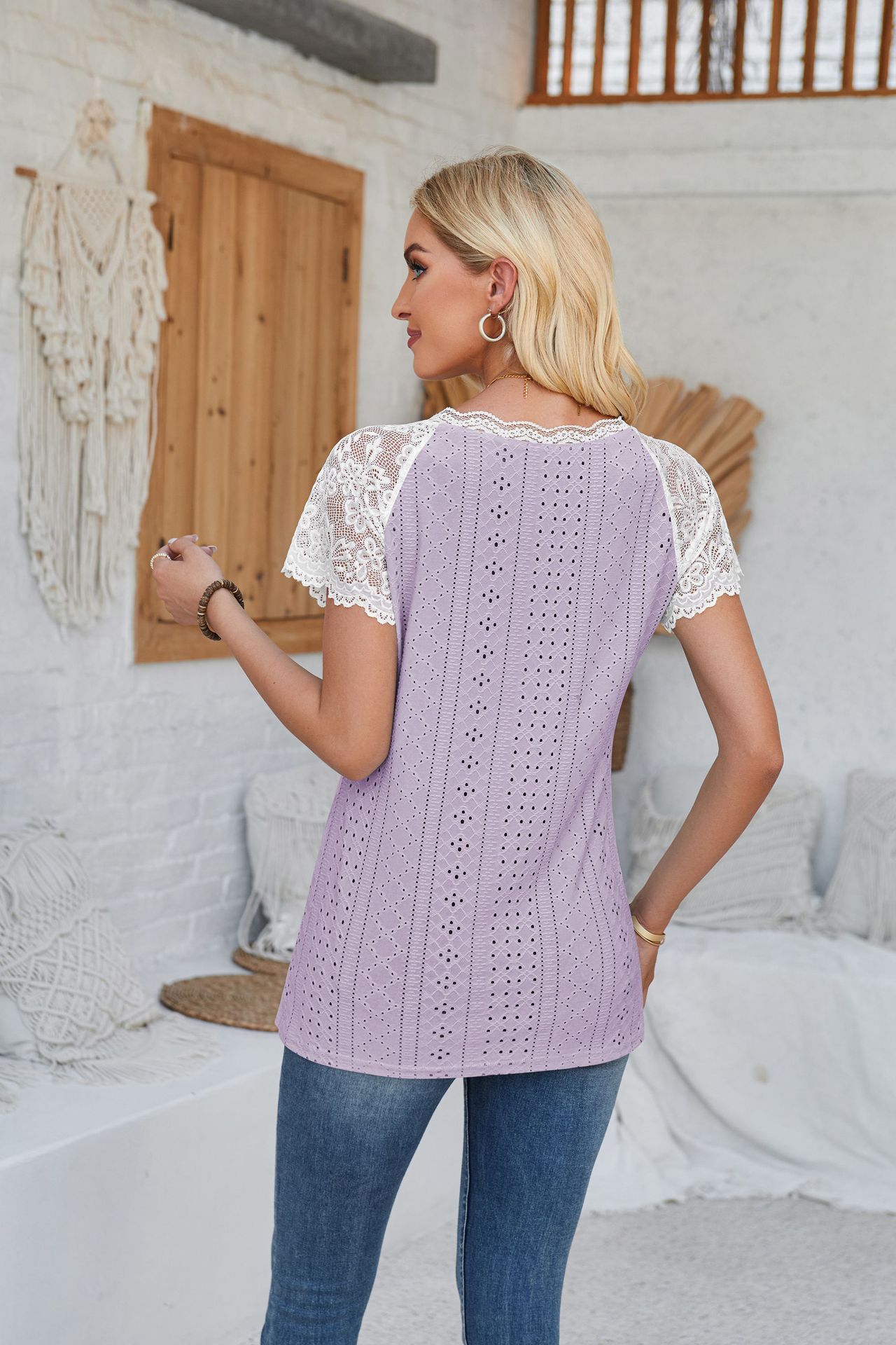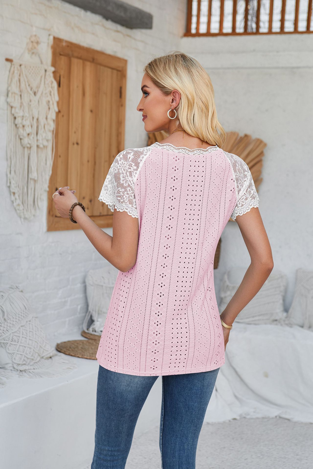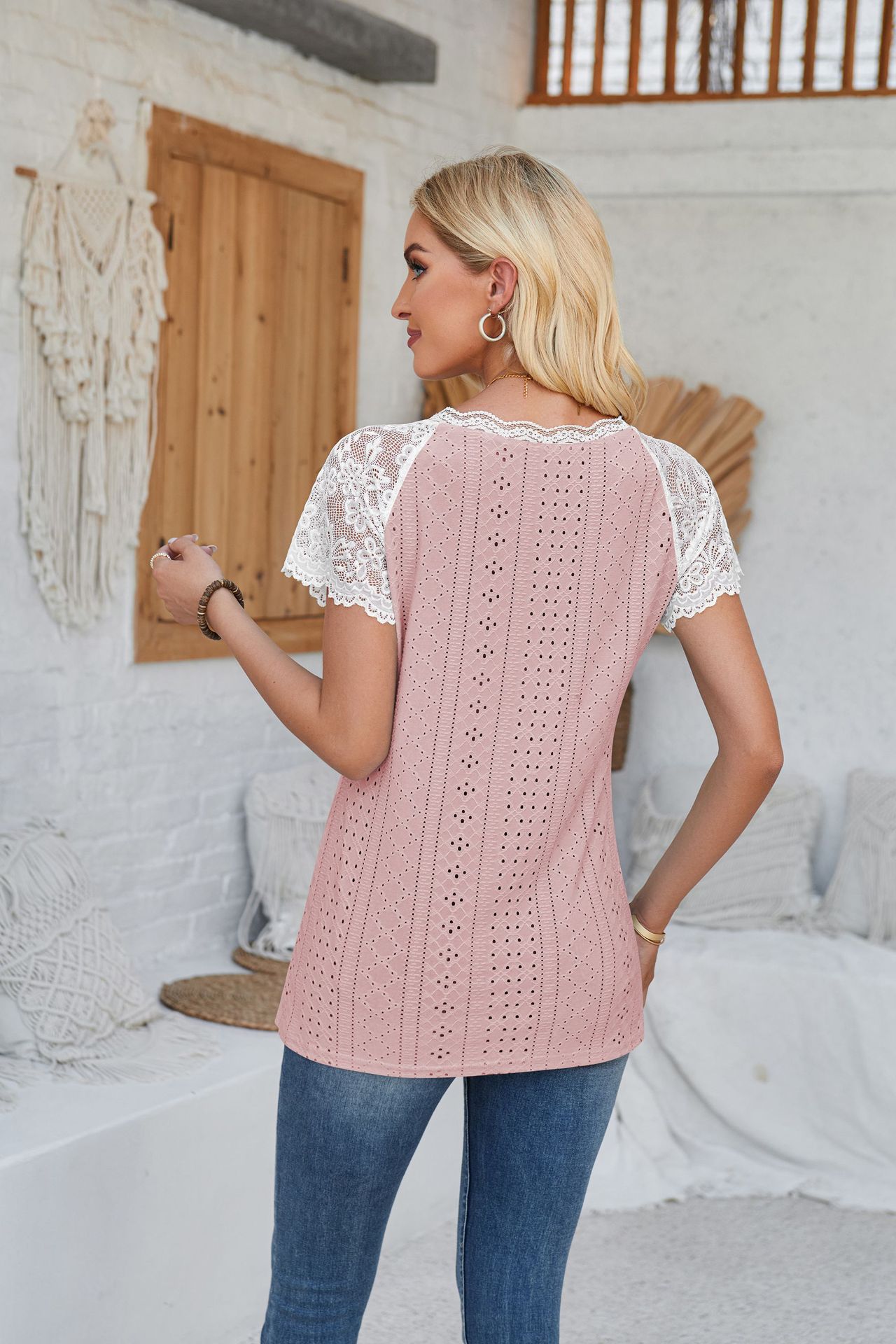 유럽과 미국 국경 대외 무역 여성의 2024 아마존 봄과 여름 새로운 V-넥 레이스 스티칭 느슨한 캐주얼 아일렛 티셔츠