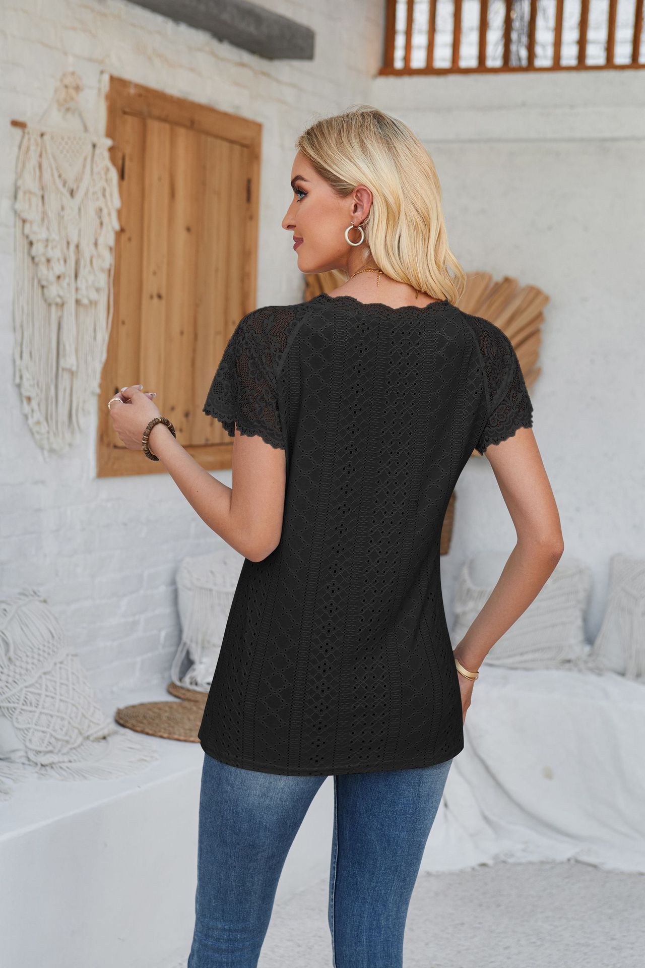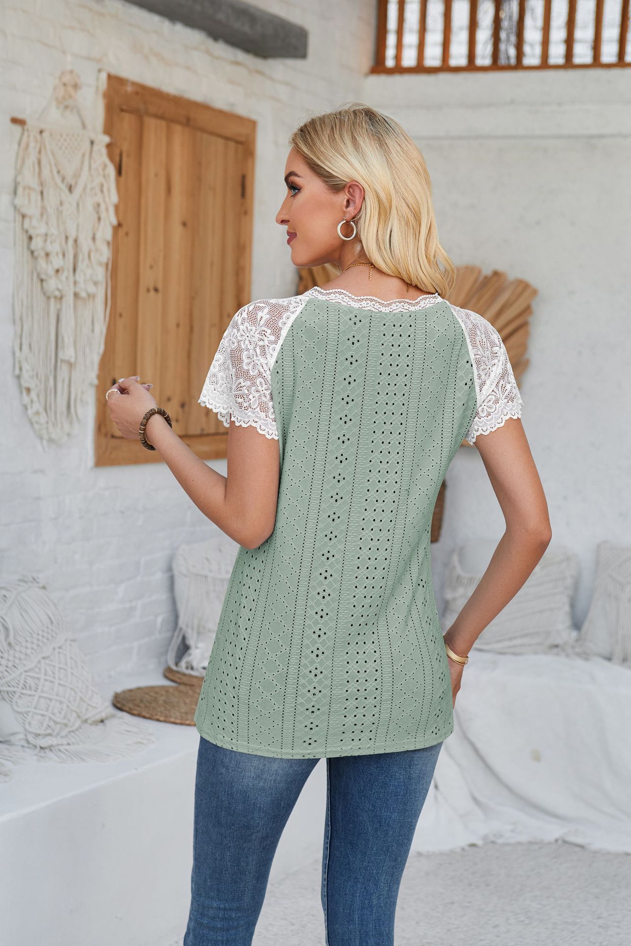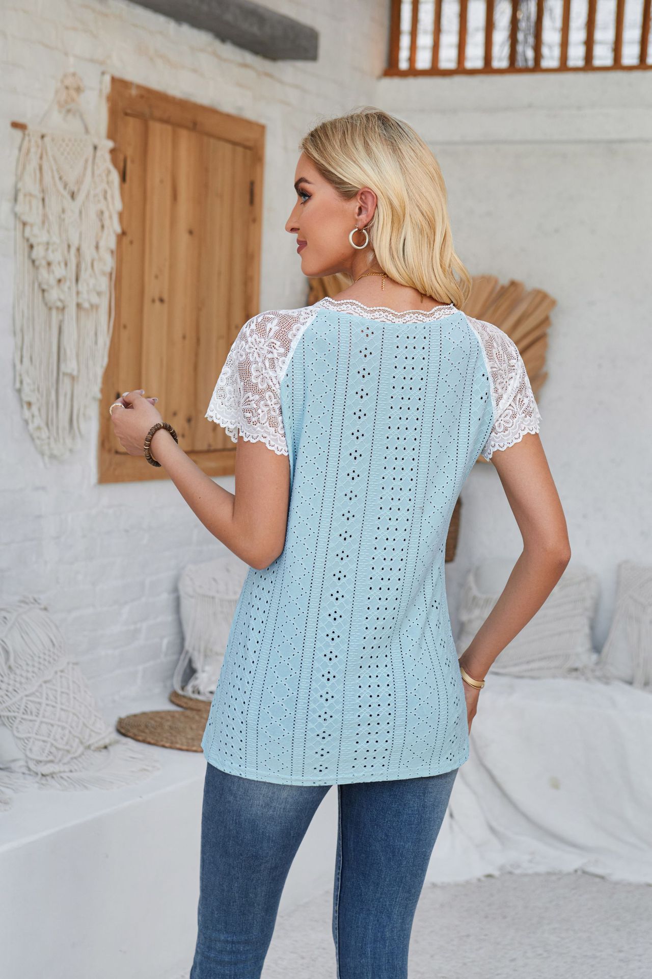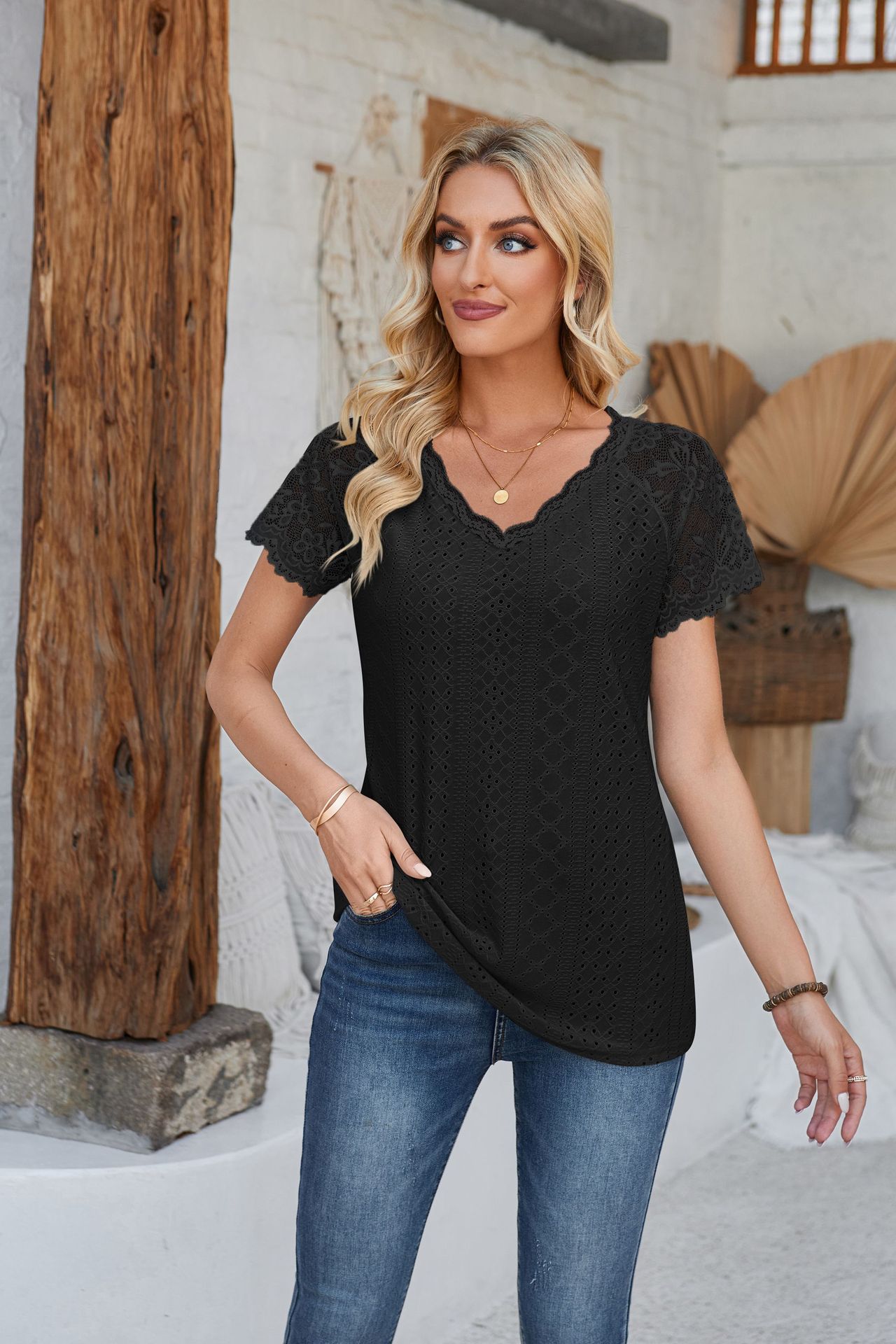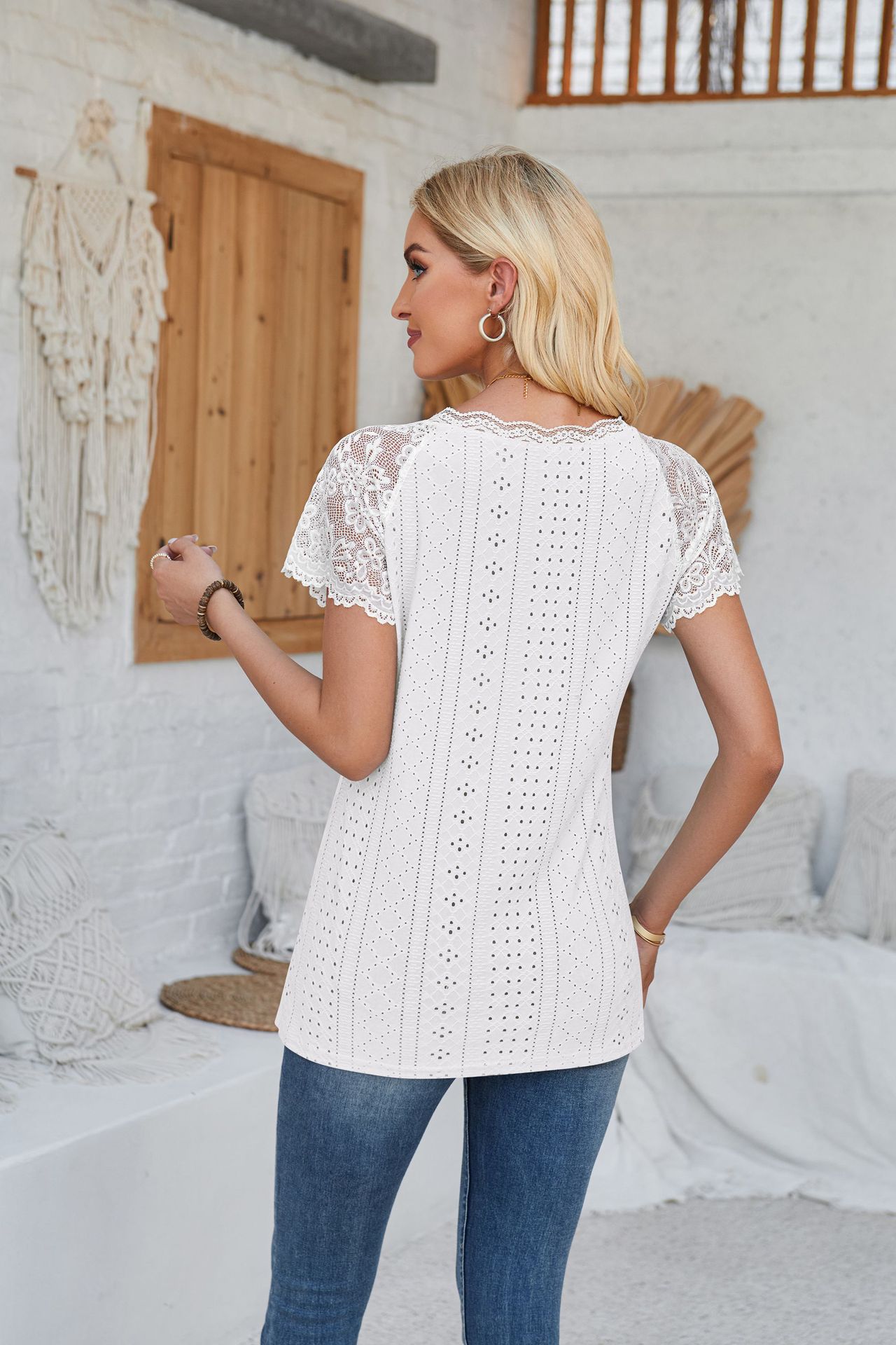 유럽과 미국 국경 대외 무역 여성의 2024 아마존 봄과 여름 새로운 V-넥 레이스 스티칭 느슨한 캐주얼 아일렛 티셔츠스토어 가기