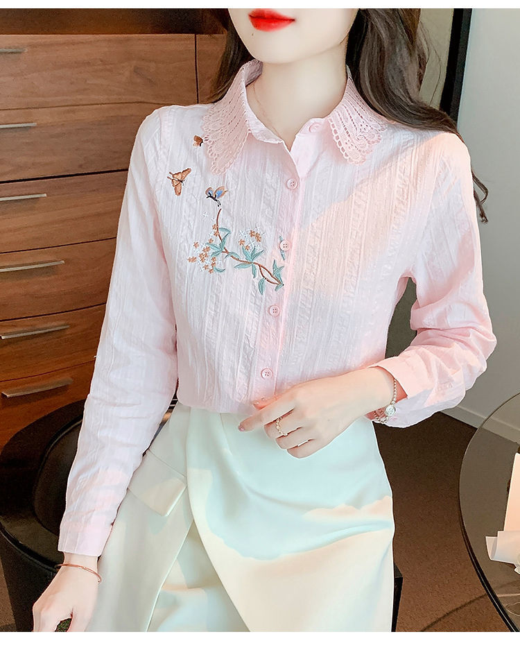 2025년 봄 가을 신상 패션 자수 순면 플리스 셔츠 여성 긴팔 면 셔츠 여성용 세련된 상의