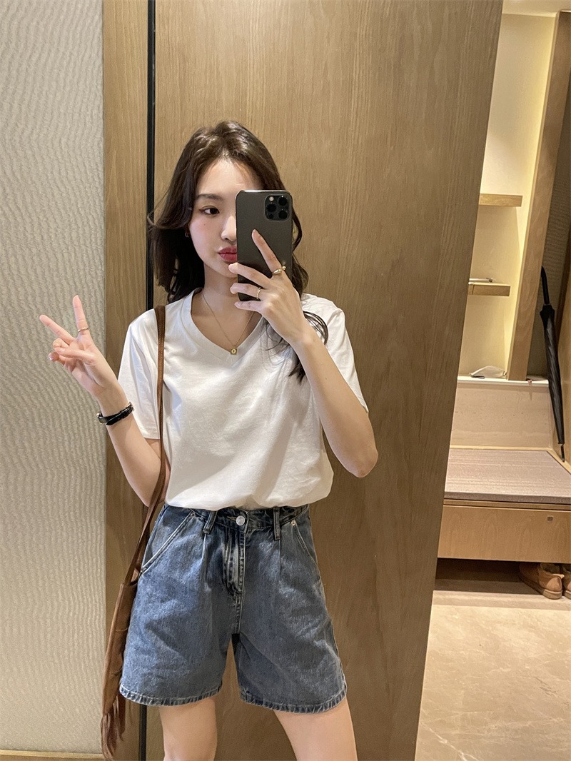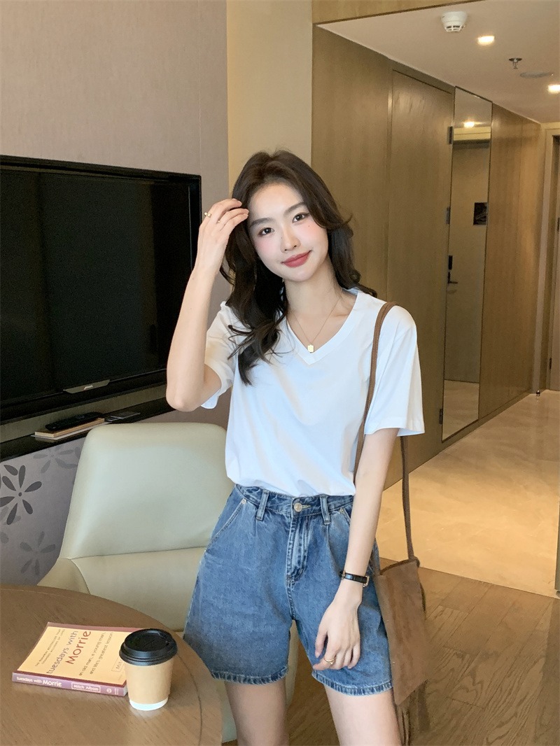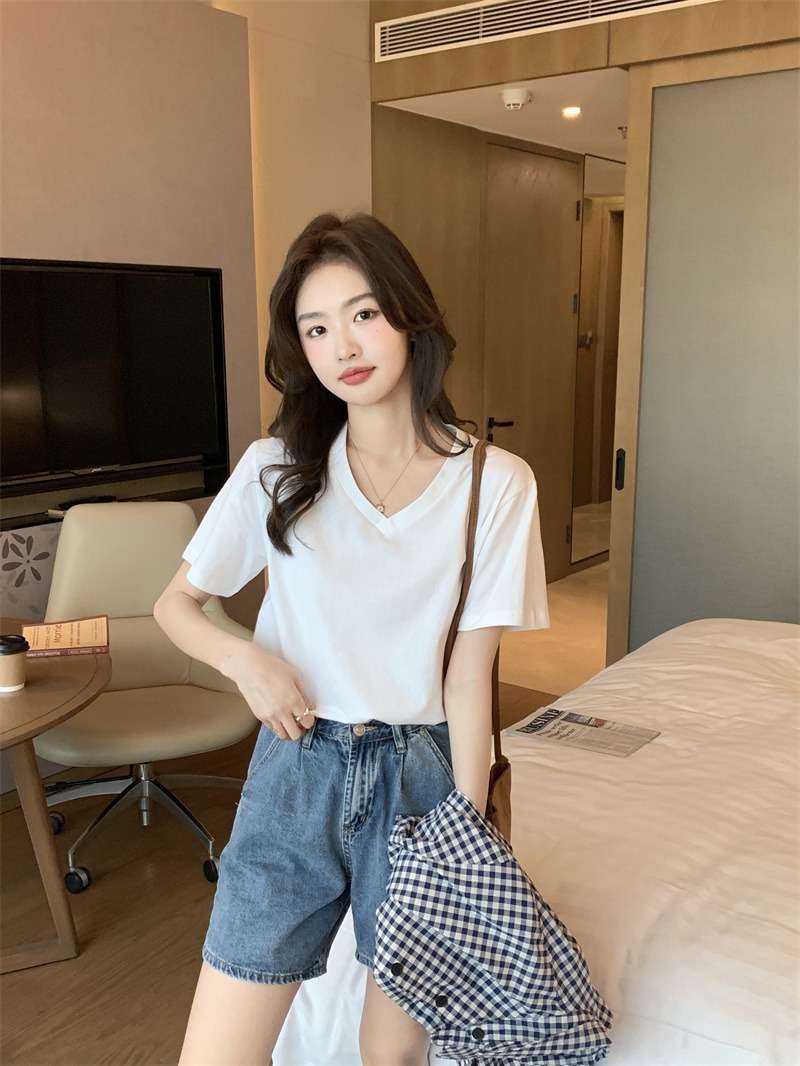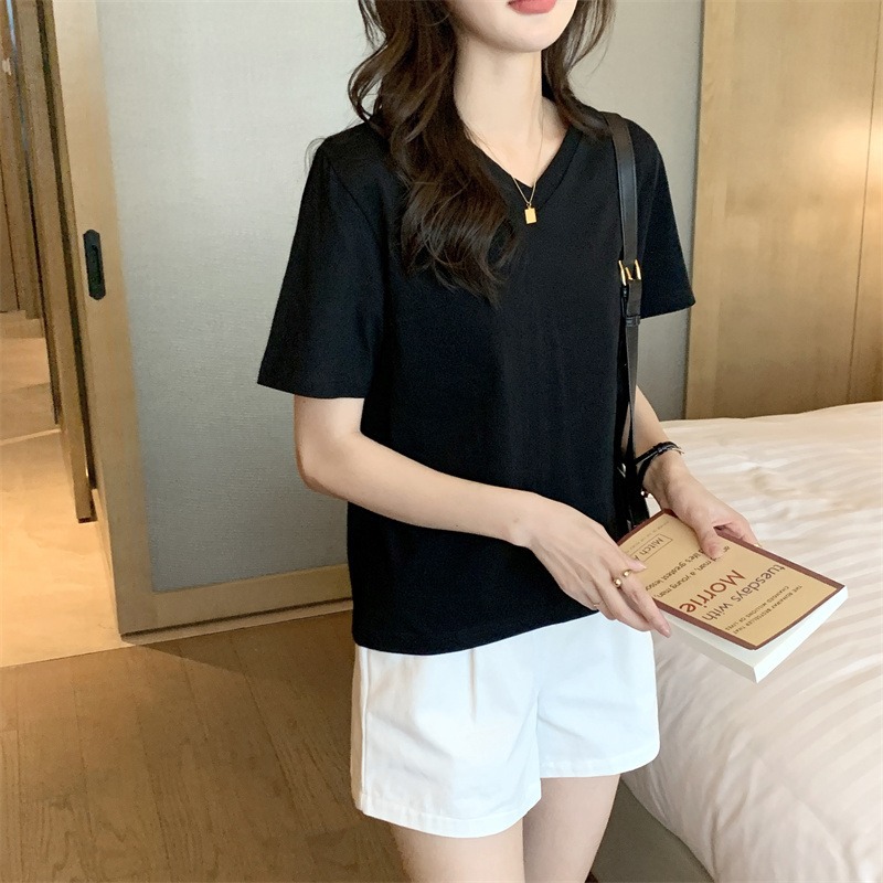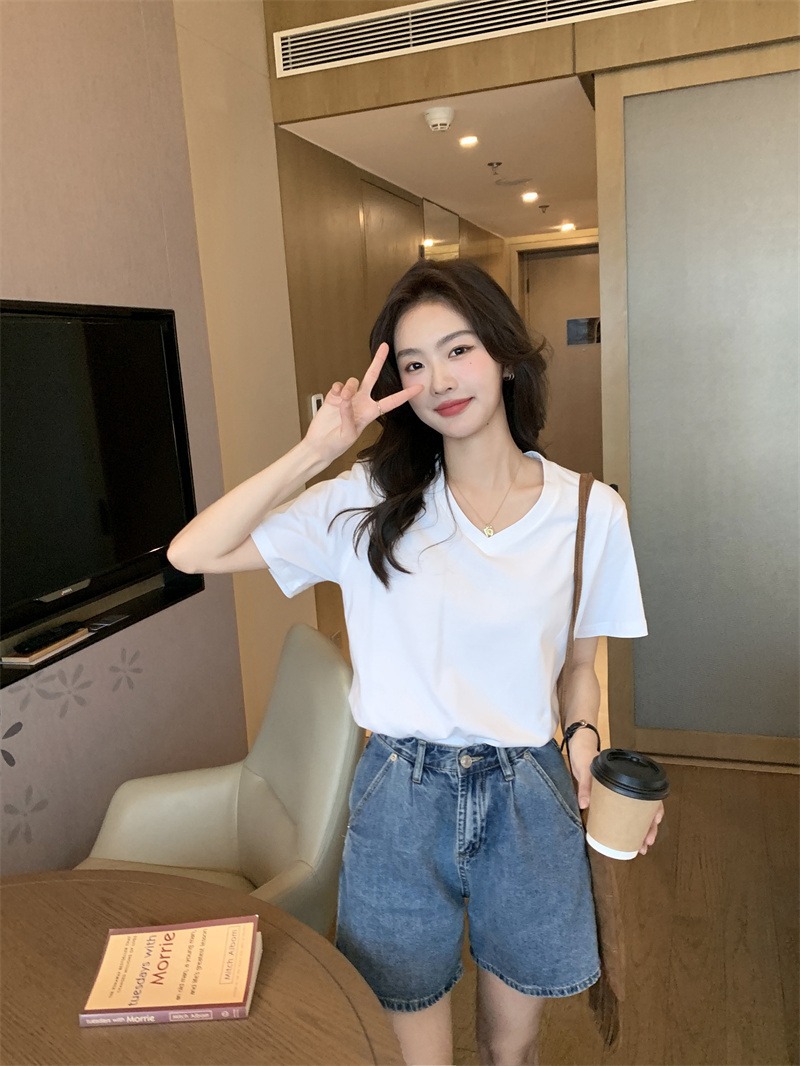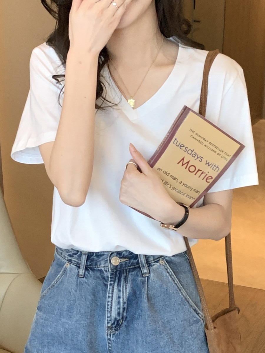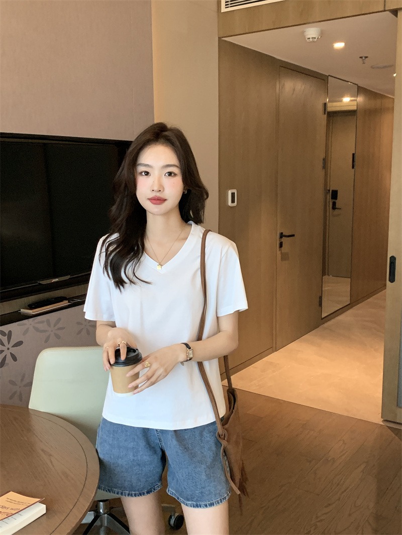 V 넥 티셔츠 여성 반팔 흰색 느슨한 슬리밍 2025 여름 신작 순수 코튼 오른쪽 어깨 연인 칼라 솔리드 컬러 탑스토어 가기