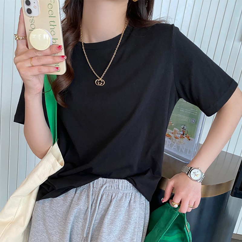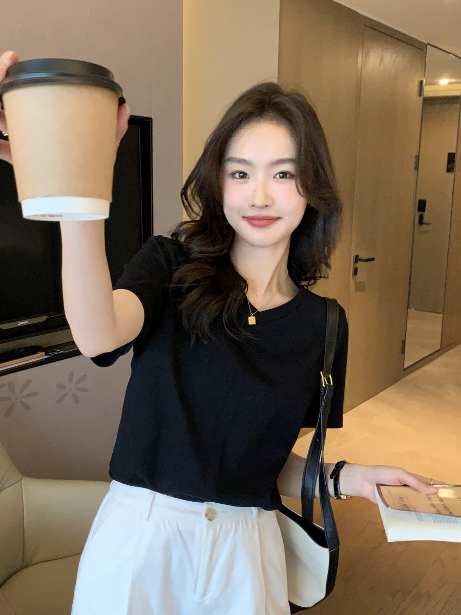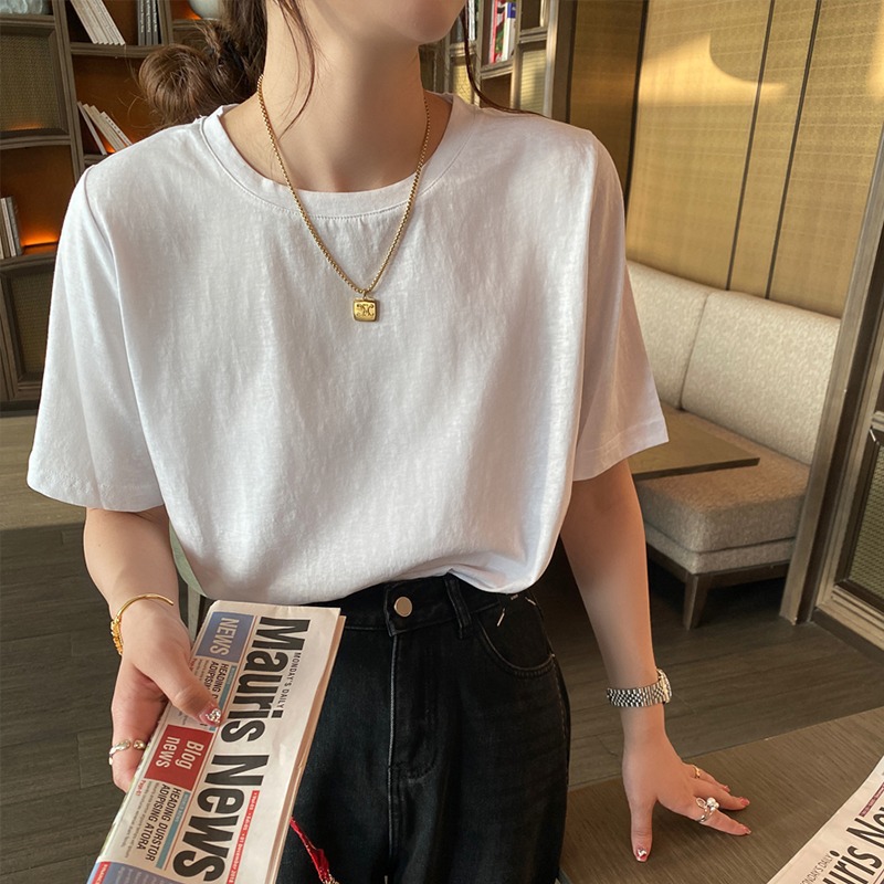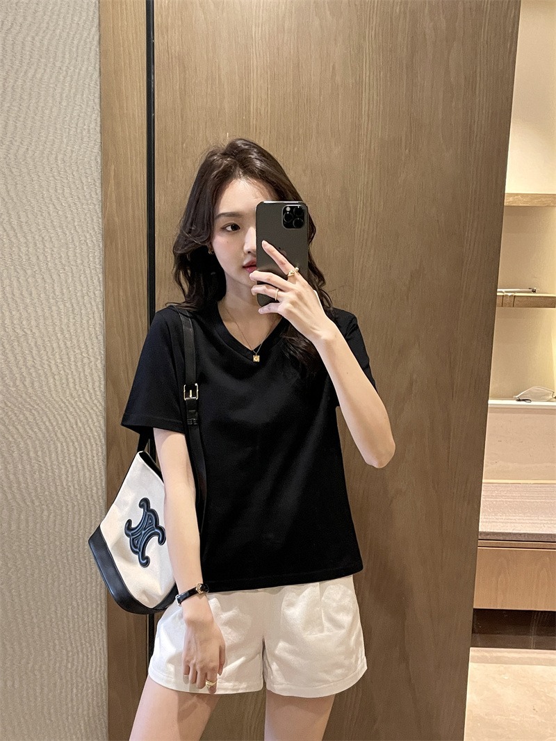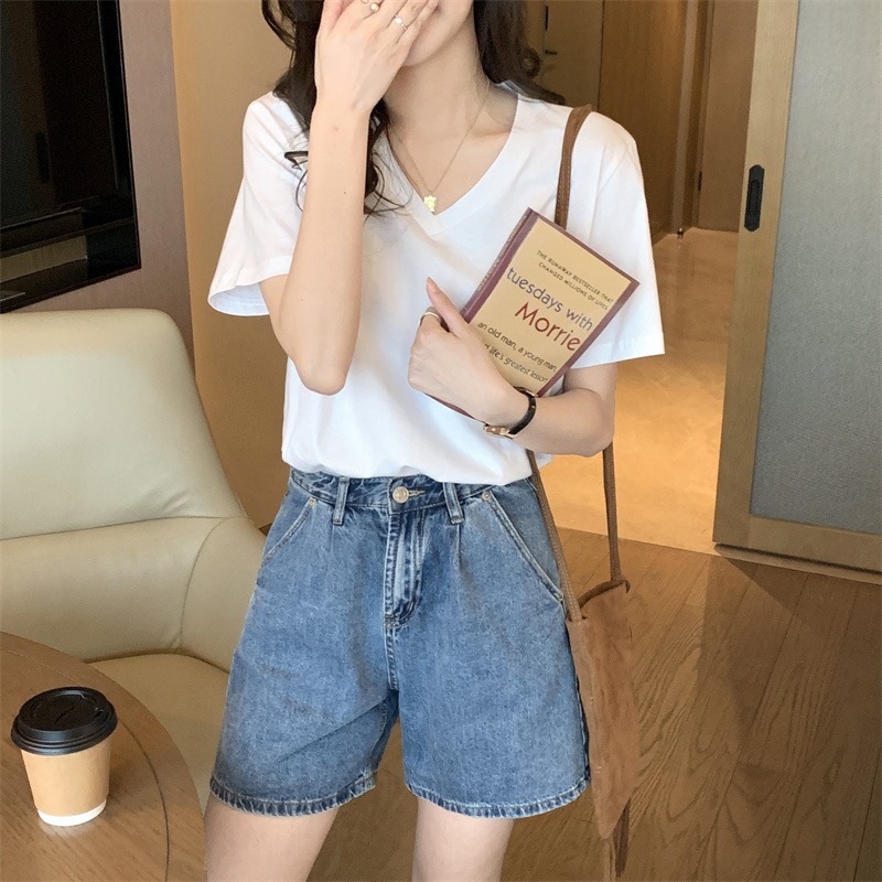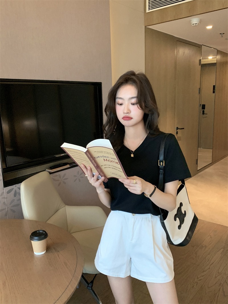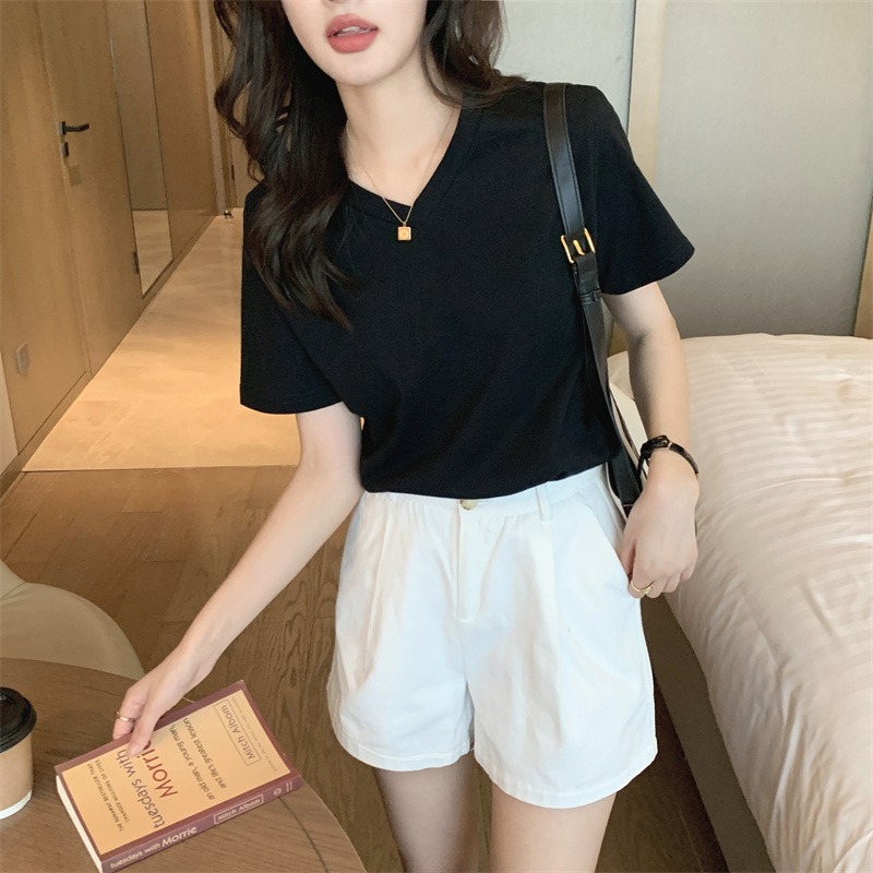 V 넥 티셔츠 여성 반팔 흰색 느슨한 슬리밍 2025 여름 신작 순수 코튼 오른쪽 어깨 연인 칼라 솔리드 컬러 탑스토어 가기