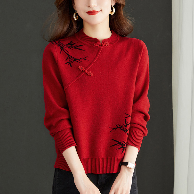 새로운 가을과 겨울 중국 스타일 버클 드래곤 2024 여성을위한 새로운 중국 스타일의 빨간 스웨터 새해 내부 바닥 스웨터