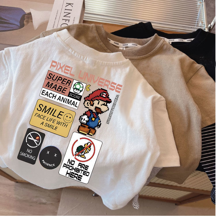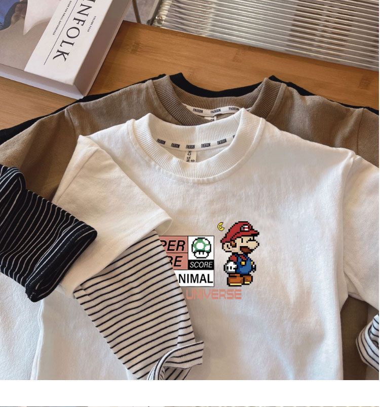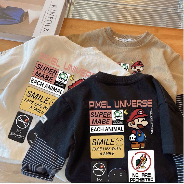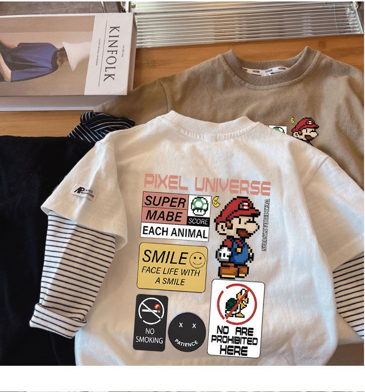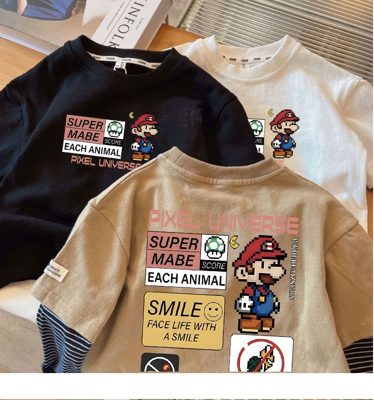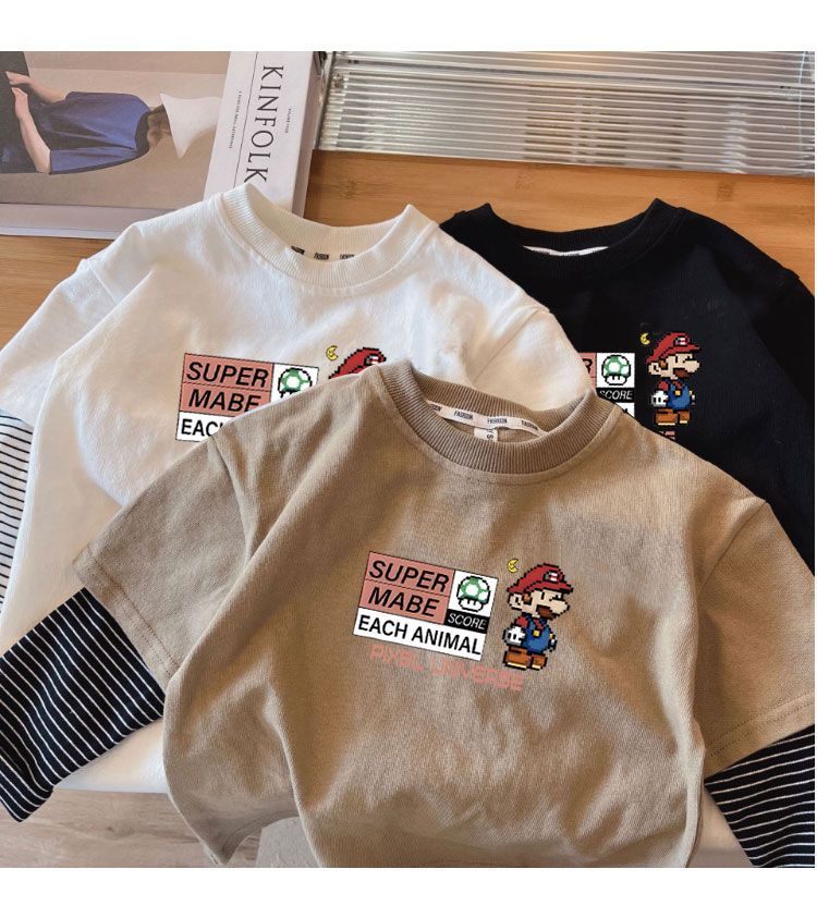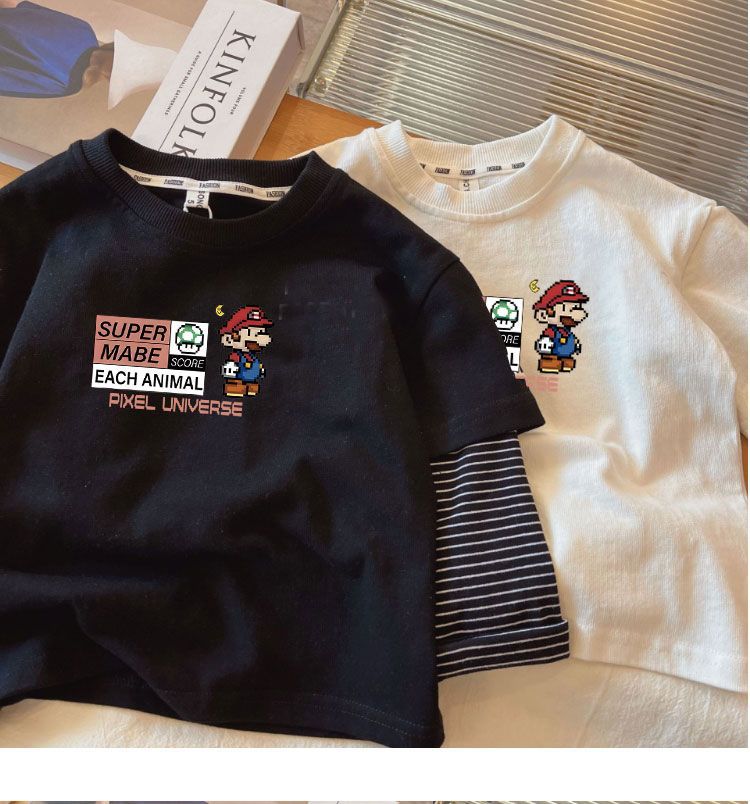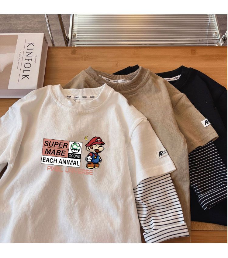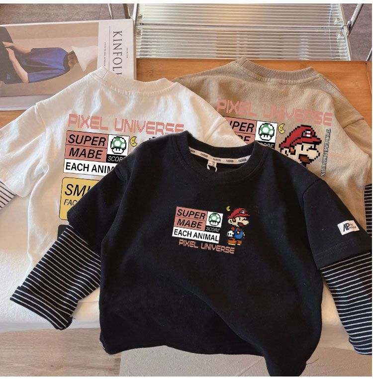 코튼 보이즈 긴팔 티셔츠 어린이 가짜 투피스 2024 새로운 봄과 가을베이스 셔츠 유행 서양식 아동복 탑 T스토어 가기