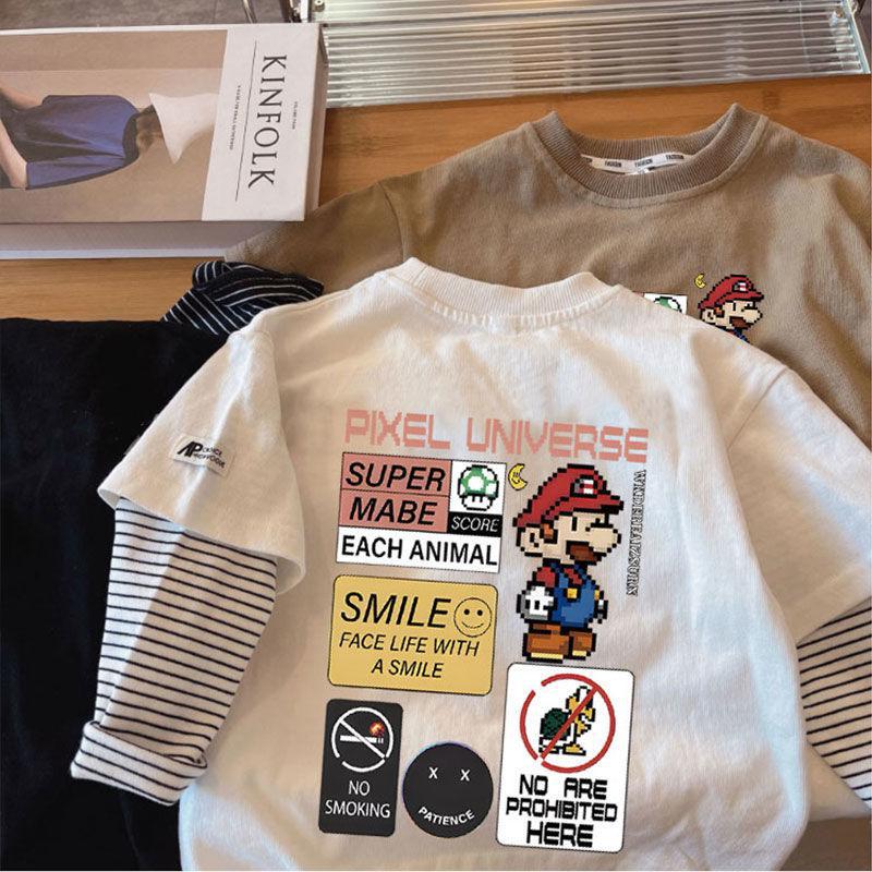 코튼 보이즈 긴팔 티셔츠 어린이 가짜 투피스 2024 새로운 봄과 가을베이스 셔츠 유행 서양식 아동복 탑 T