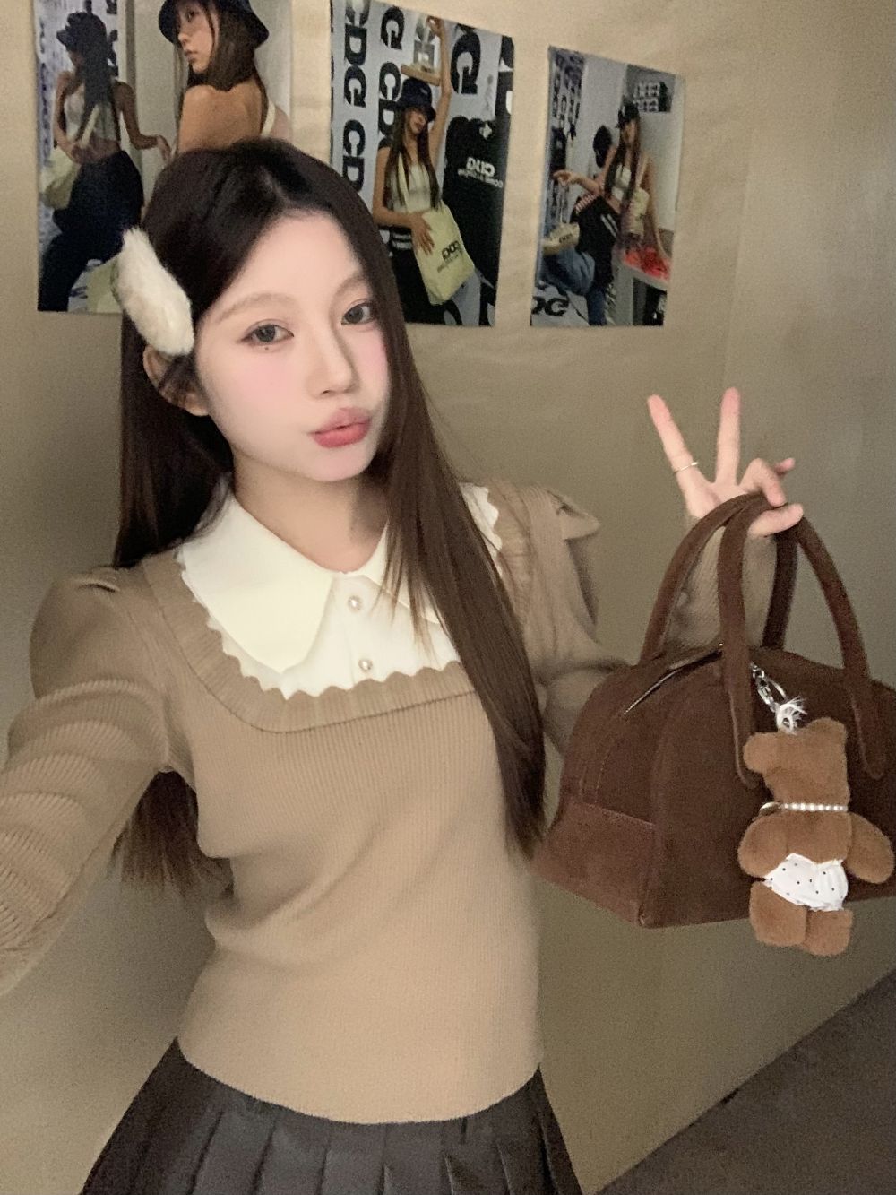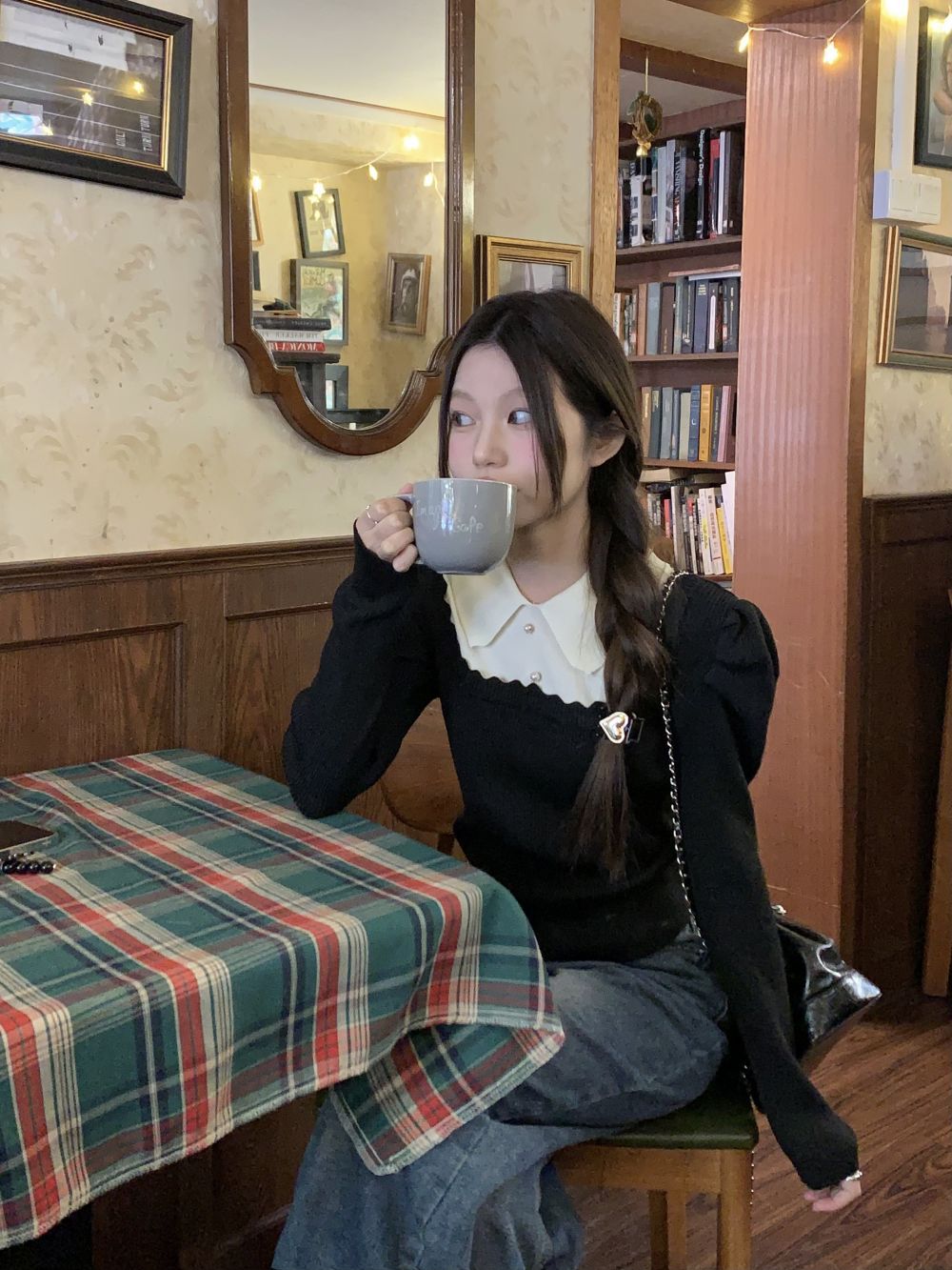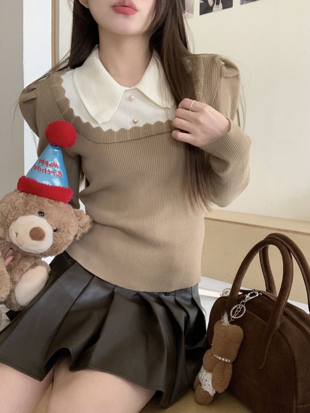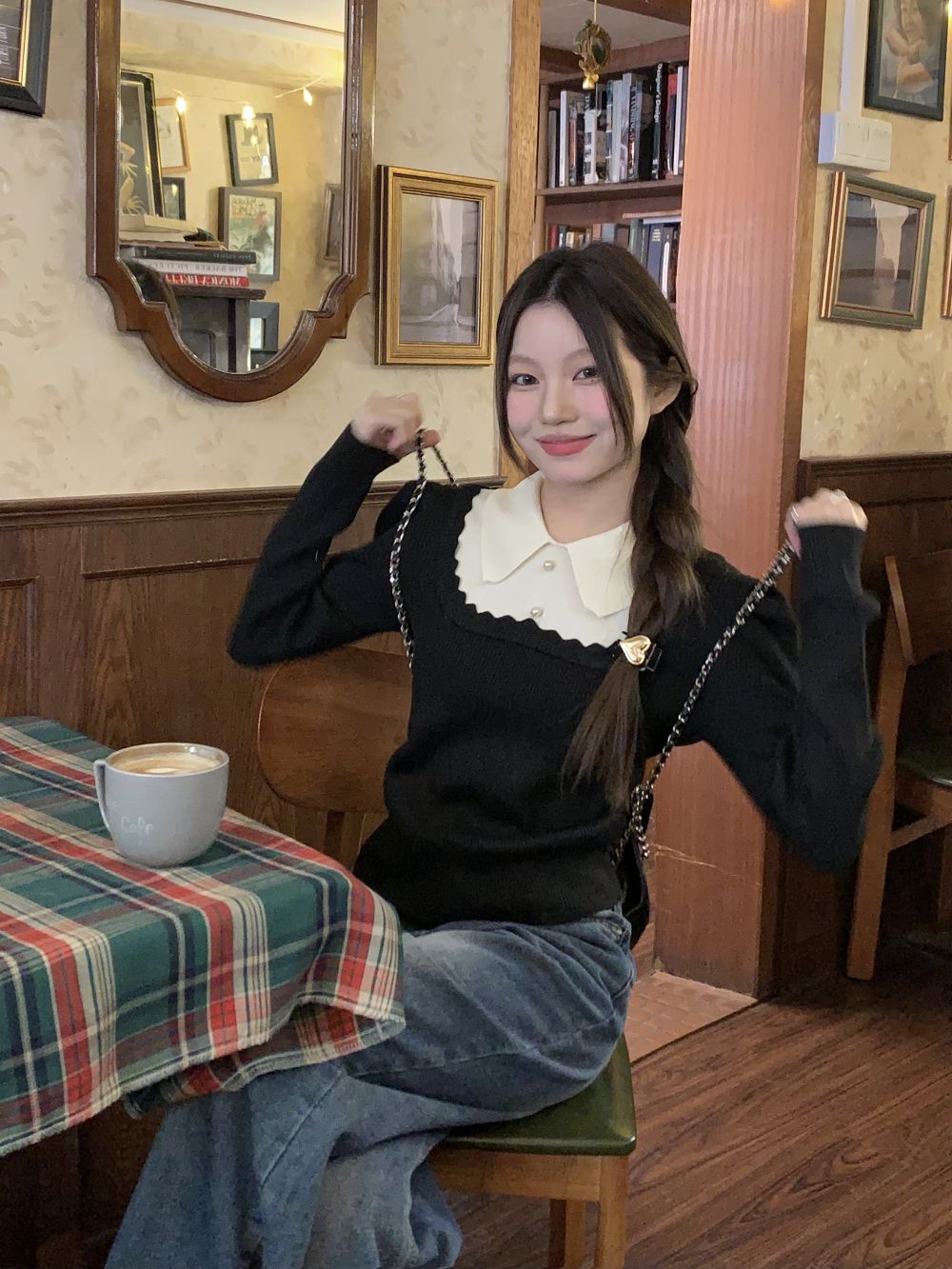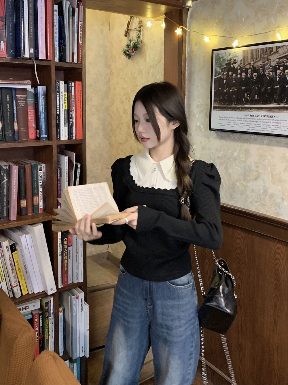 프랑스 스타일 샤넬 칼라 니트 바닥 셔츠 여성 내복 가을과 겨울 가짜 투피스 퍼프 소매 탑 사교계 스웨터스토어 가기