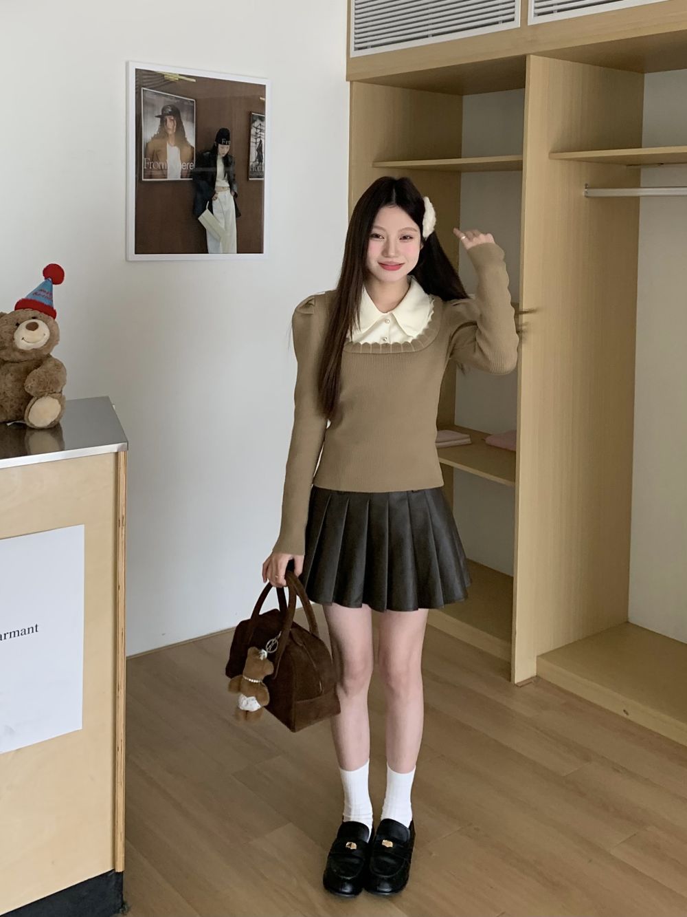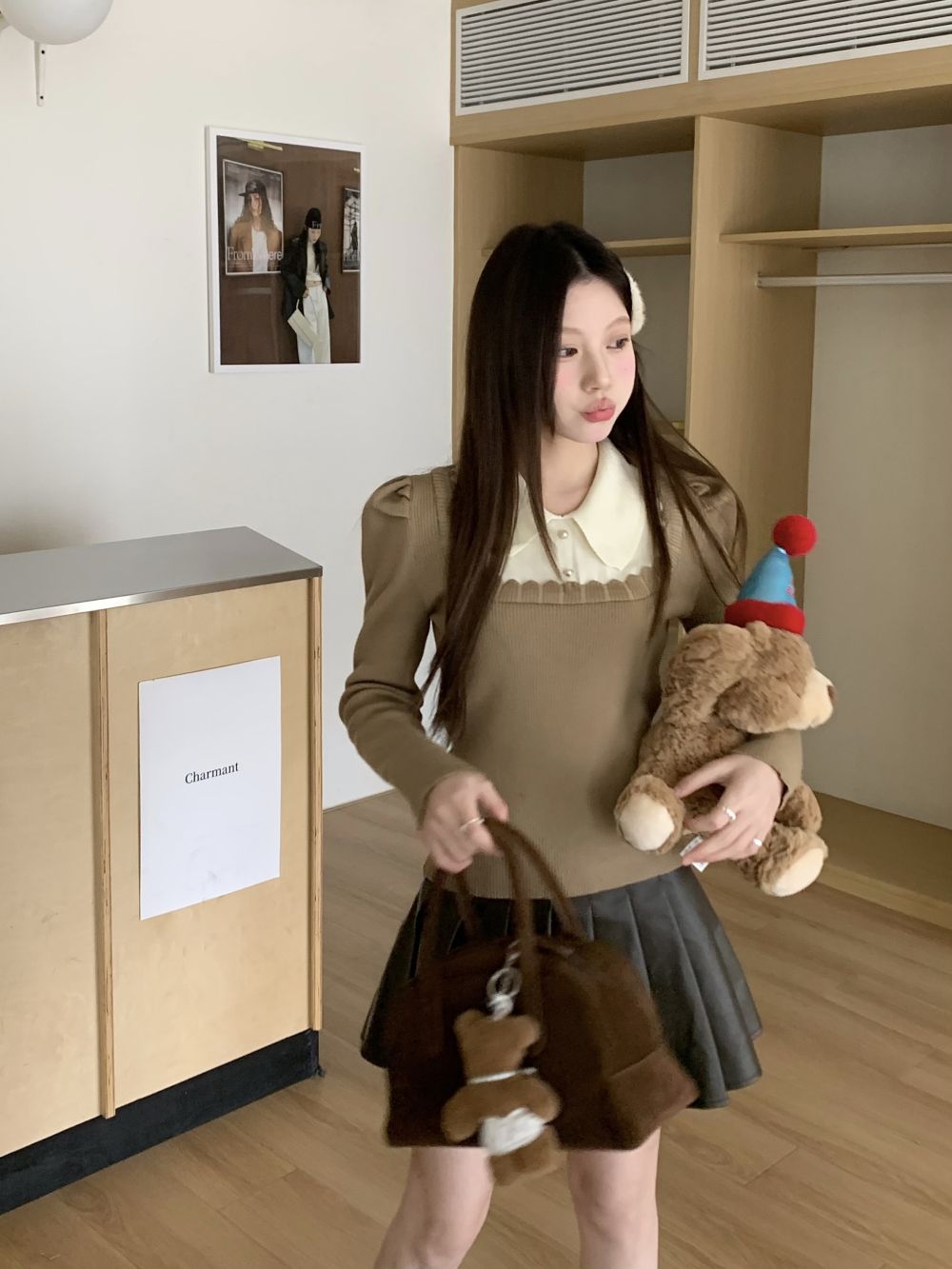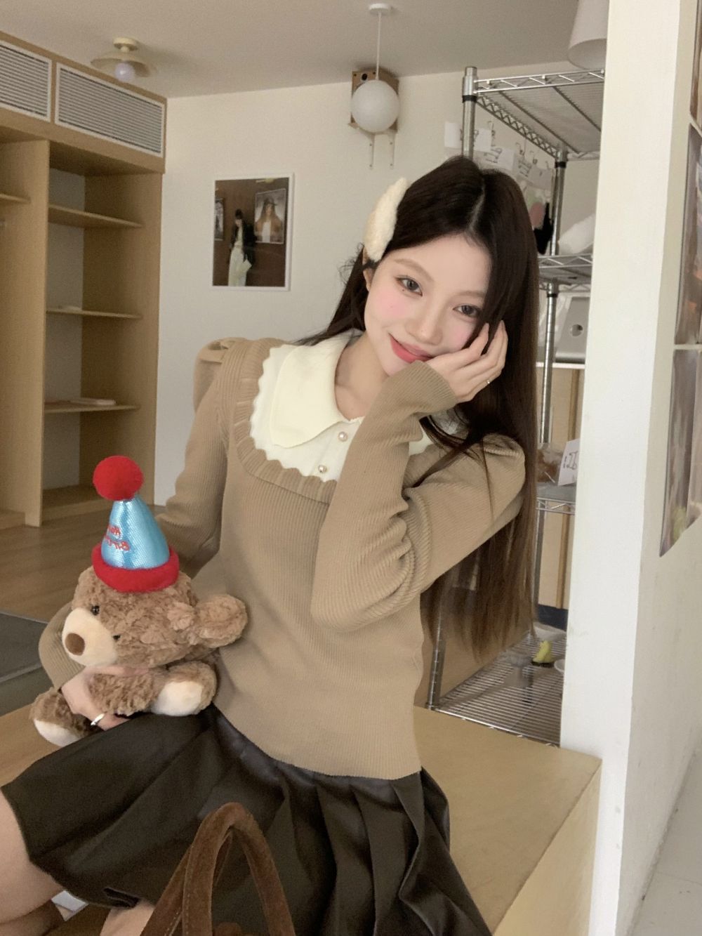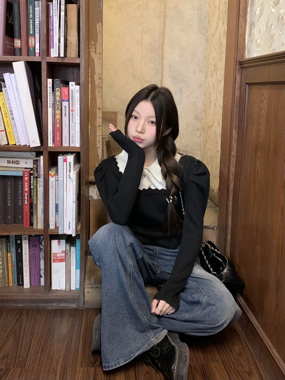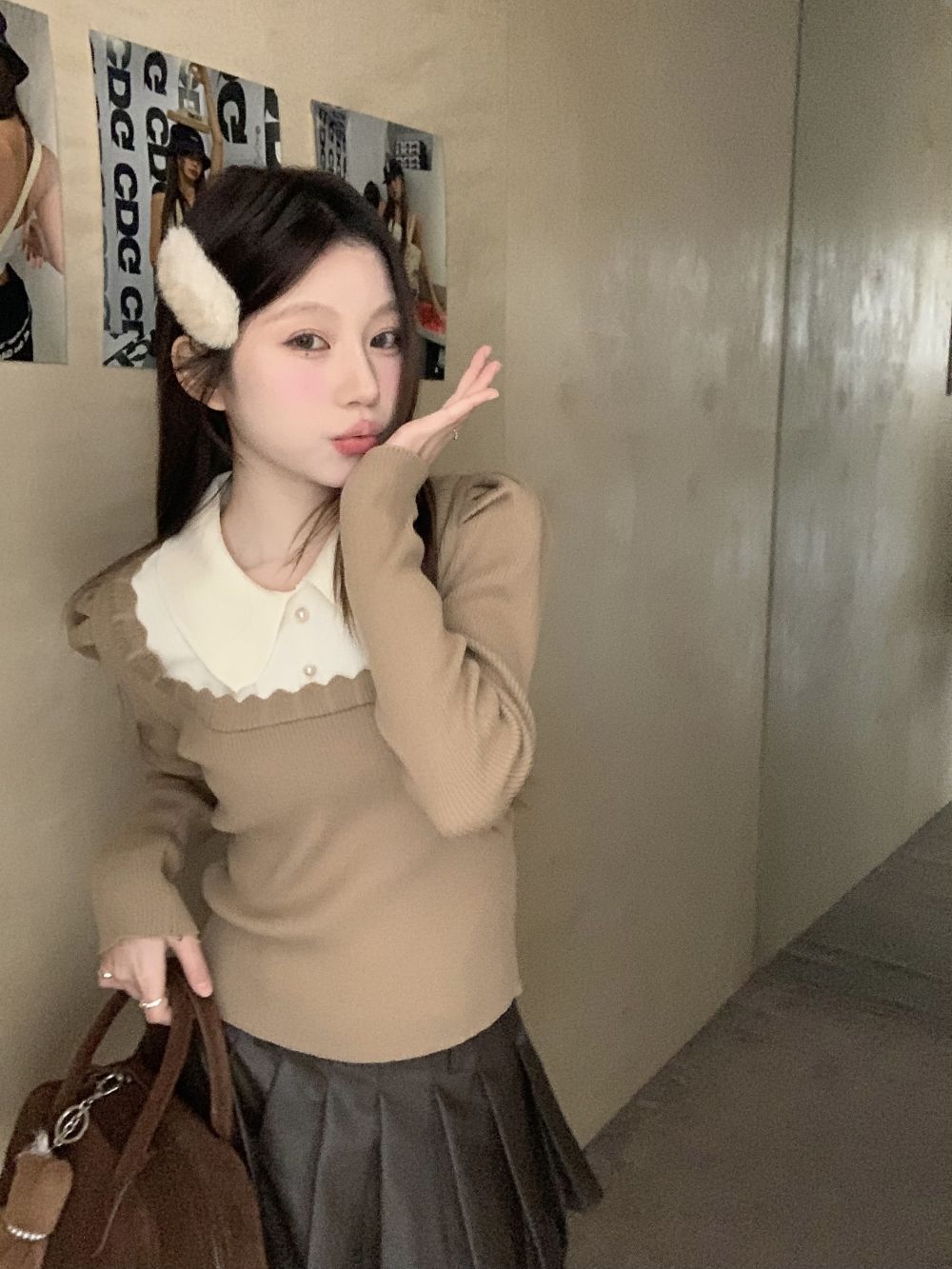 프랑스 스타일 샤넬 칼라 니트 바닥 셔츠 여성 내복 가을과 겨울 가짜 투피스 퍼프 소매 탑 사교계 스웨터스토어 가기