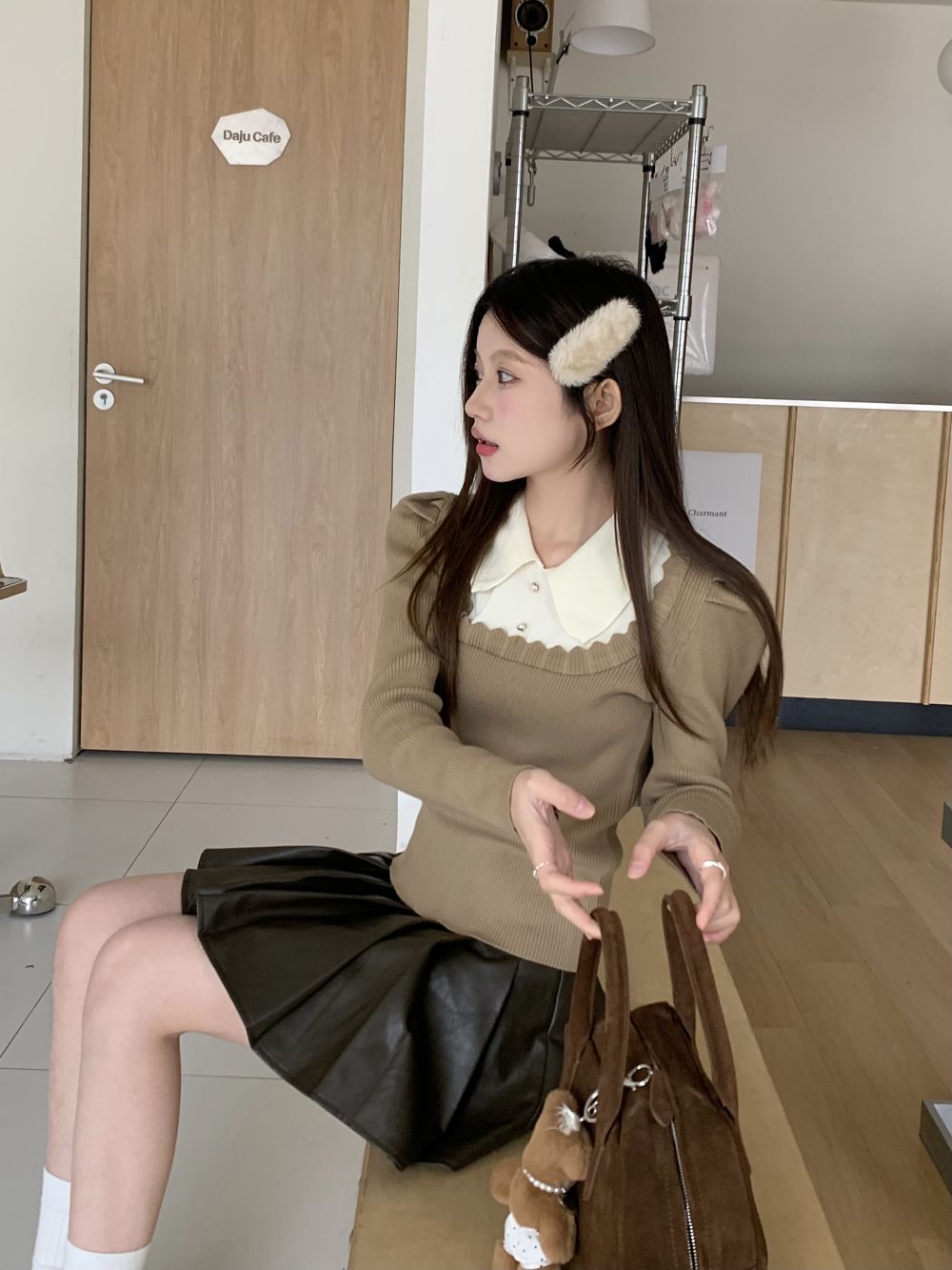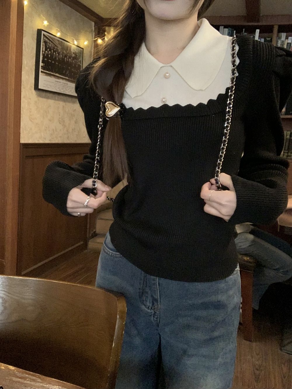 프랑스 스타일 샤넬 칼라 니트 바닥 셔츠 여성 내복 가을과 겨울 가짜 투피스 퍼프 소매 탑 사교계 스웨터