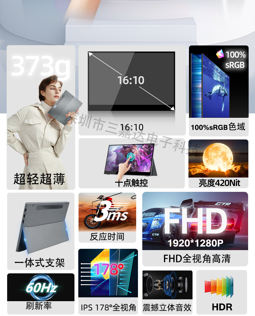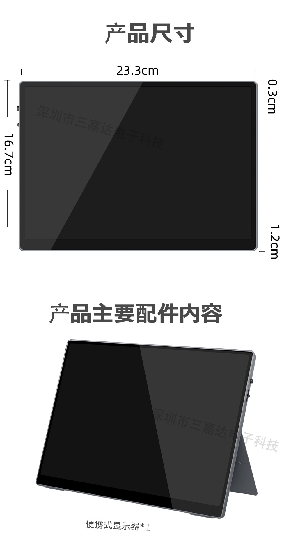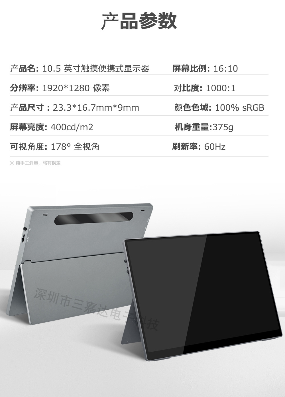 Sanjieda 10.5inch iPS 터치 스크린 휴대용 모니터 휴대 전화 스크린 프로젝션 노트북 확장 사무실 엔터테인먼트