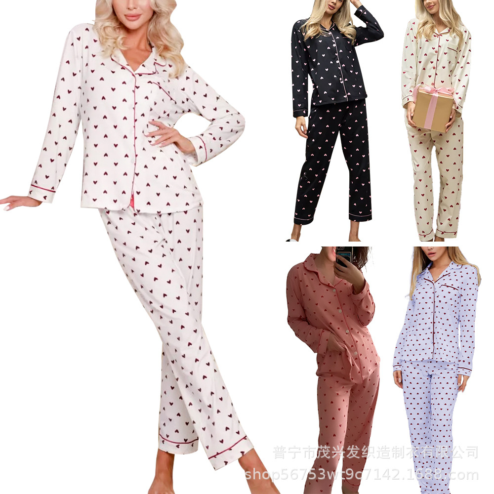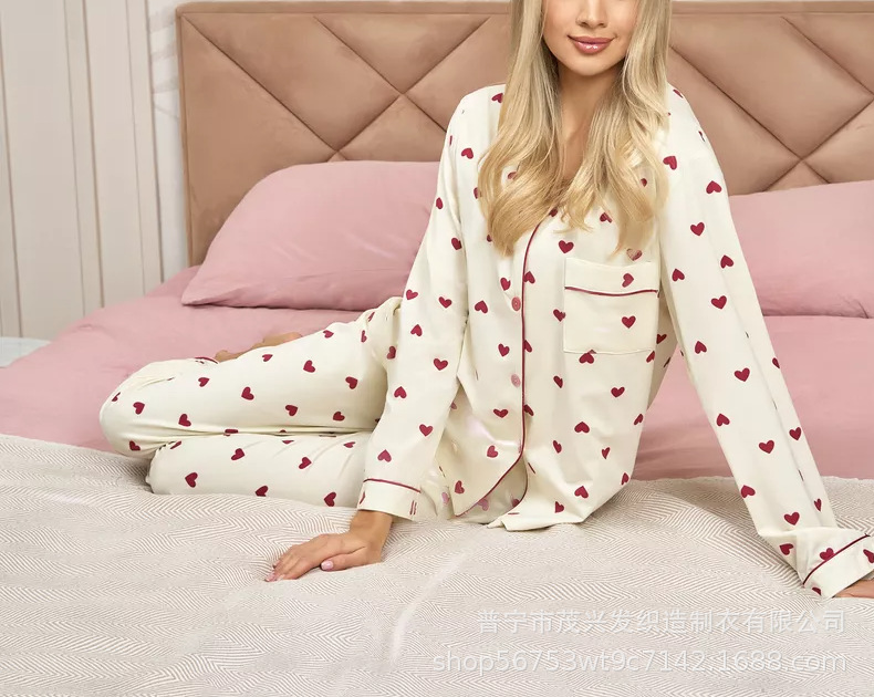 맞춤형 유럽과 미국 여성 홈웨어 밀크 실크 러브 프린트 슈트 카디건 긴팔 라펠 홈웨어 여성용스토어 가기