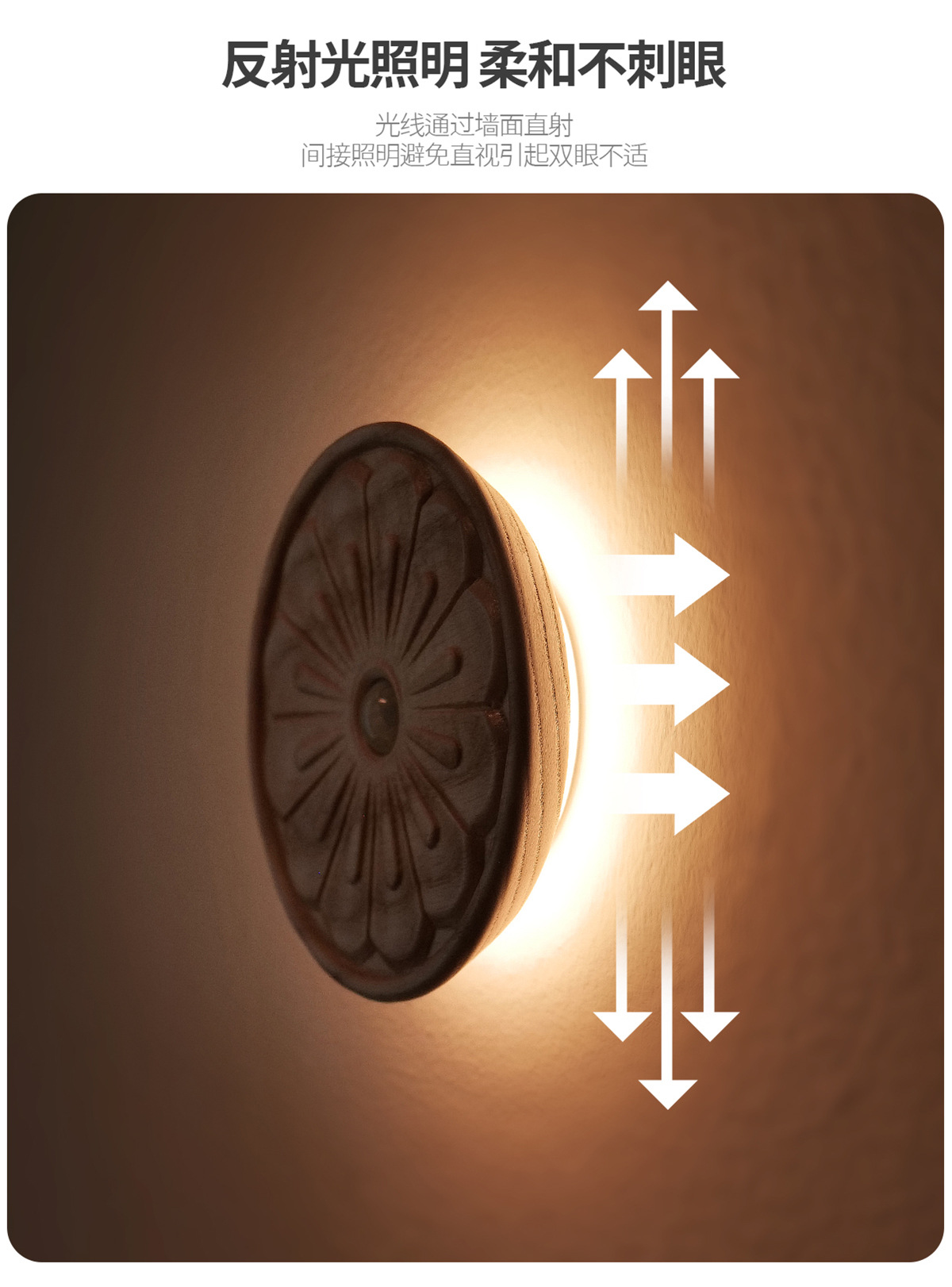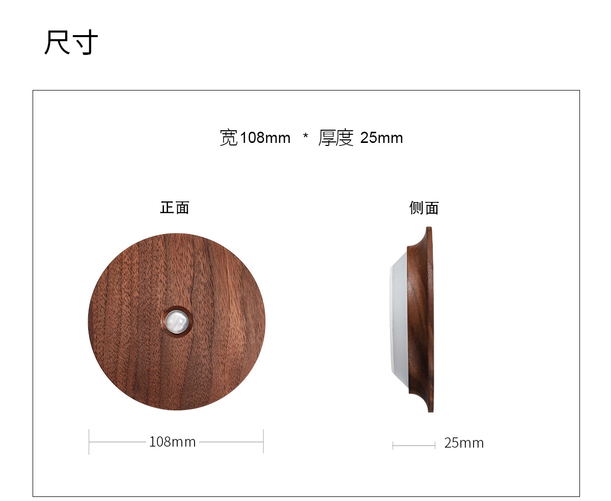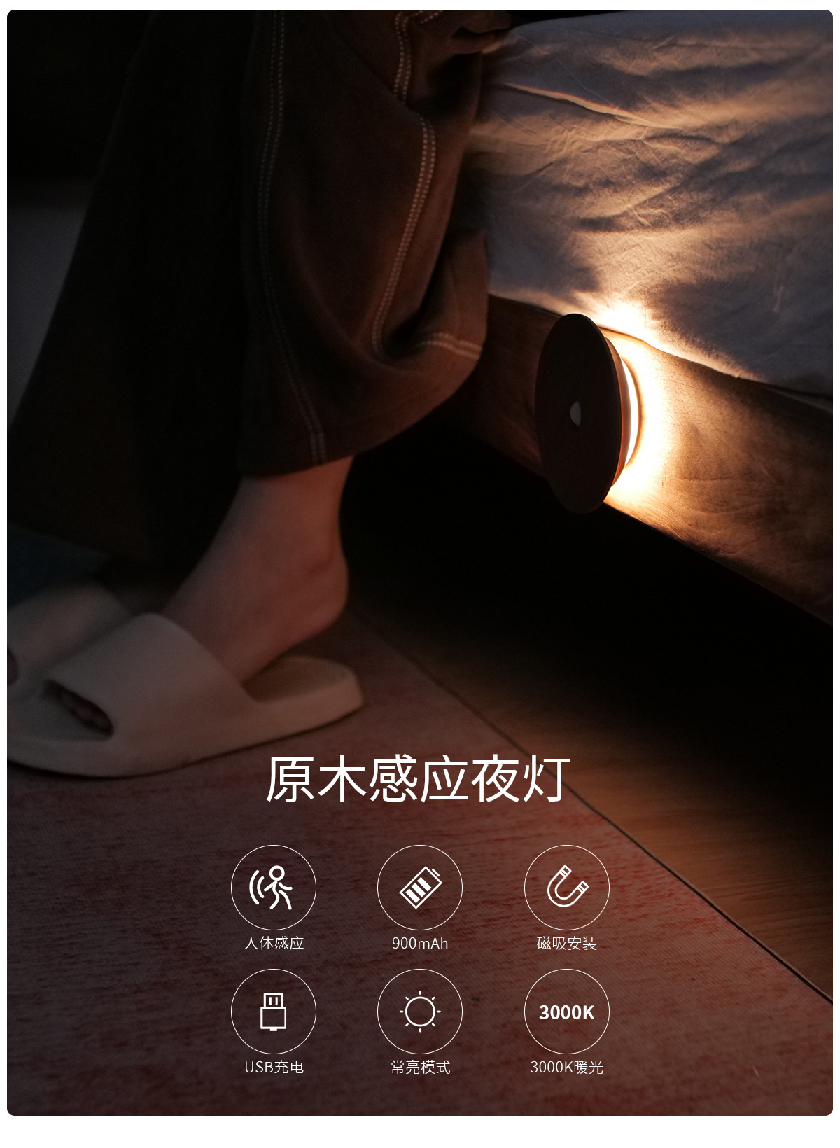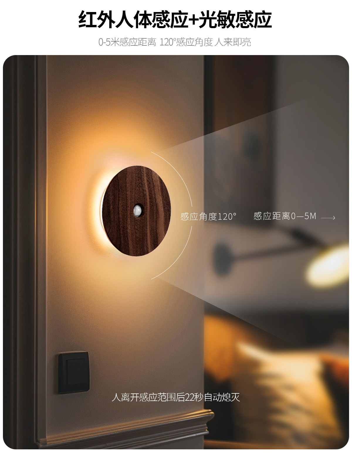 단단한 나무 자기 유도 램프, 스마트 야간 조명, 배선이 필요 없는 벽 램프, 문화 및 창의적 선물, 통로 침실용 충전식 램프