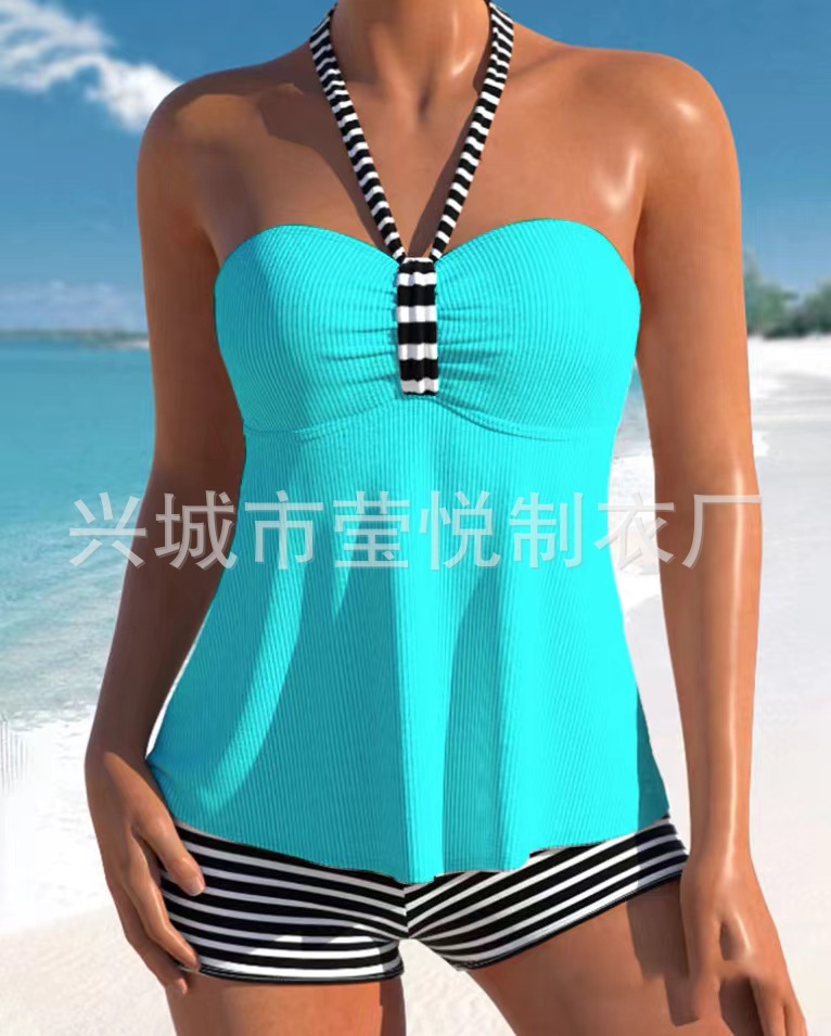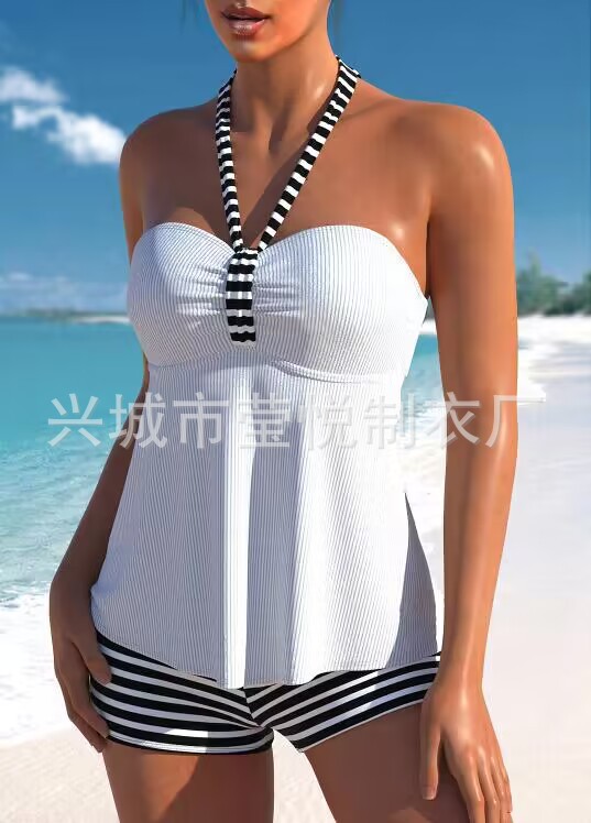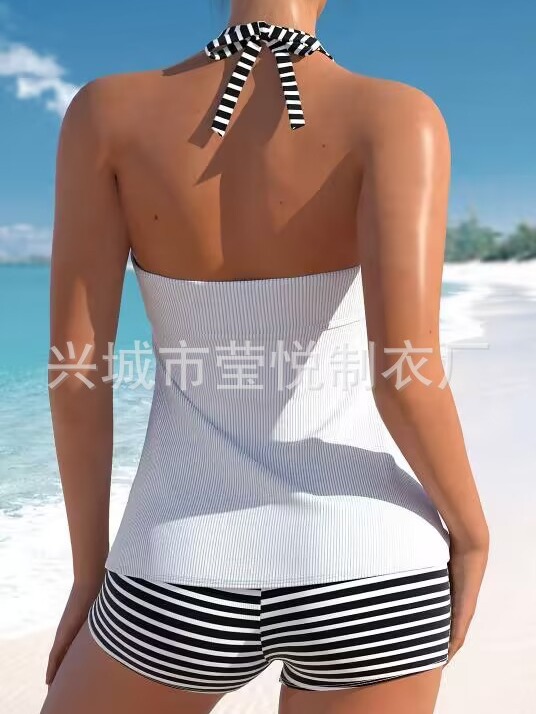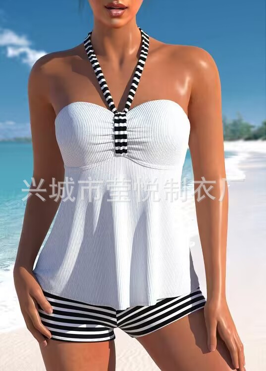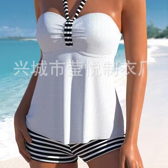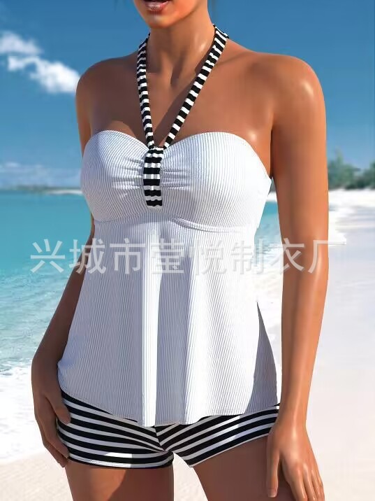 유럽과 미국의 새로운 스타일의 단색 흑백 줄무늬 오프 숄더 수영복 세트 아마존