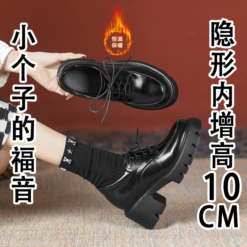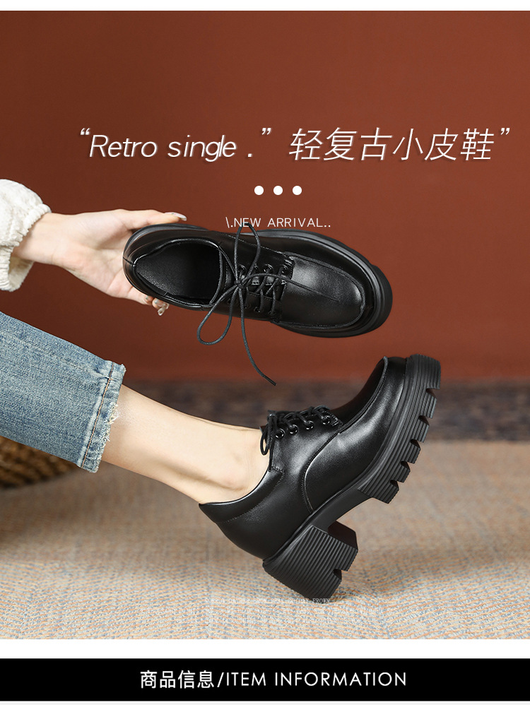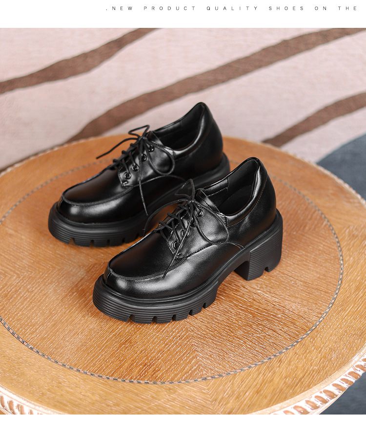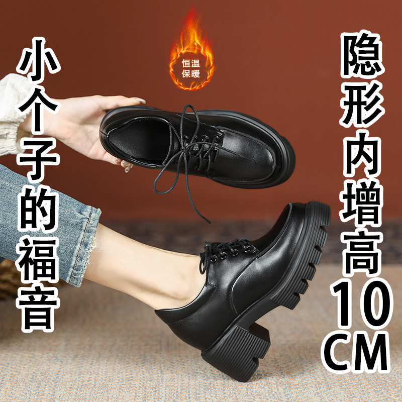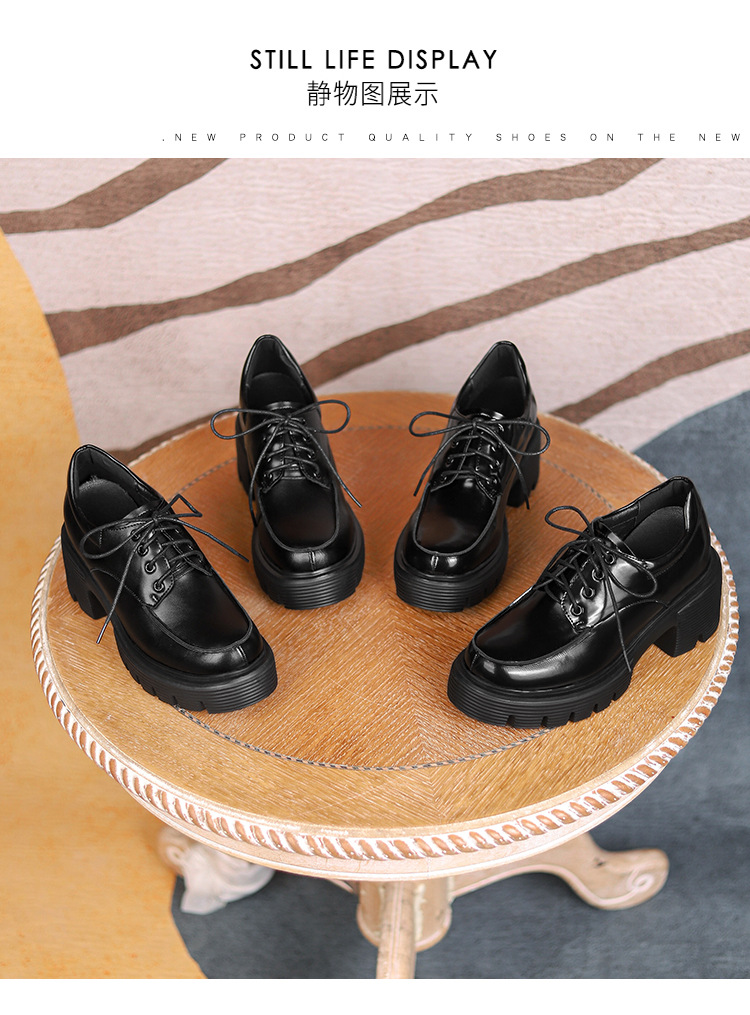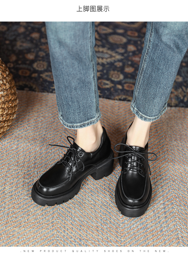 새로운 봄과 가을 레이스 업 둥근 발가락 두꺼운 바닥 스몰 사이즈 두꺼운 뒤꿈치를 2024 여성을위한 10lm 검은 색 영국 가죽 신발 내부 높이 증가스토어 가기