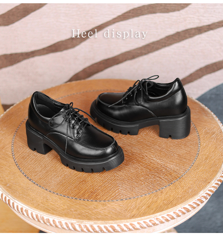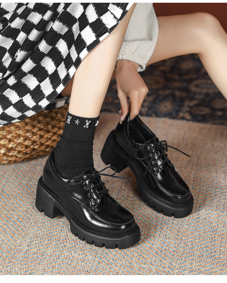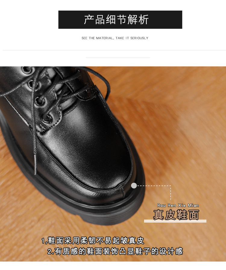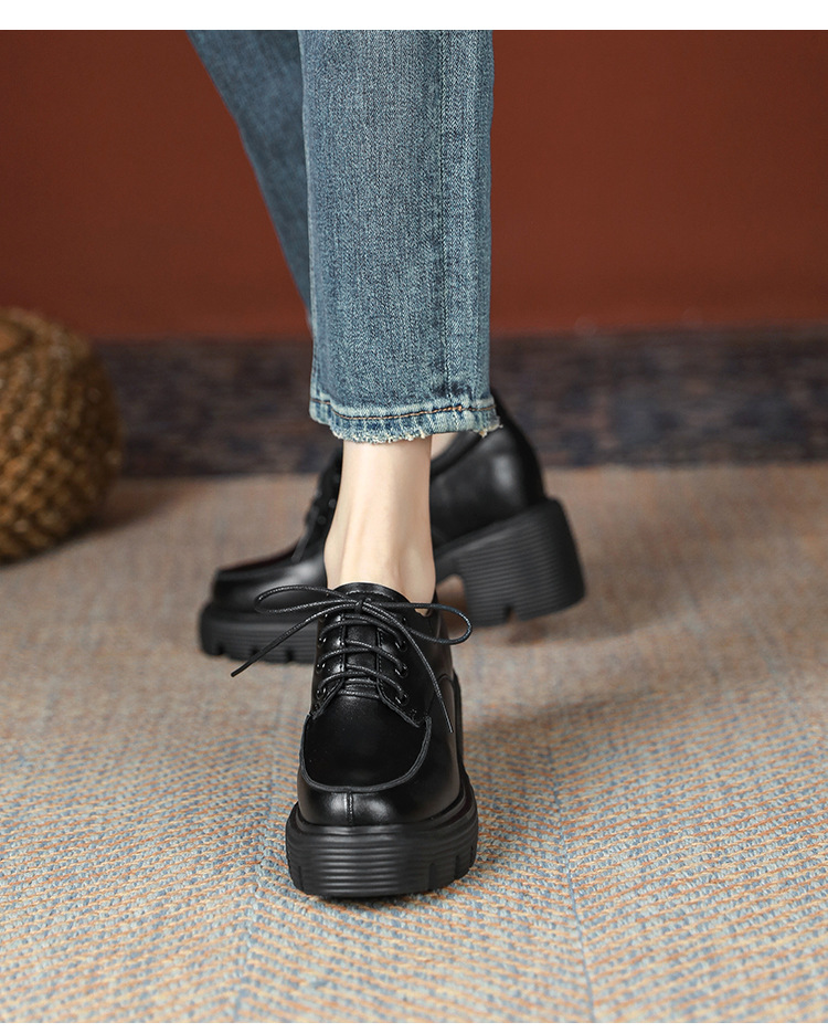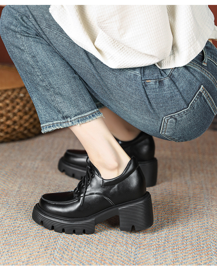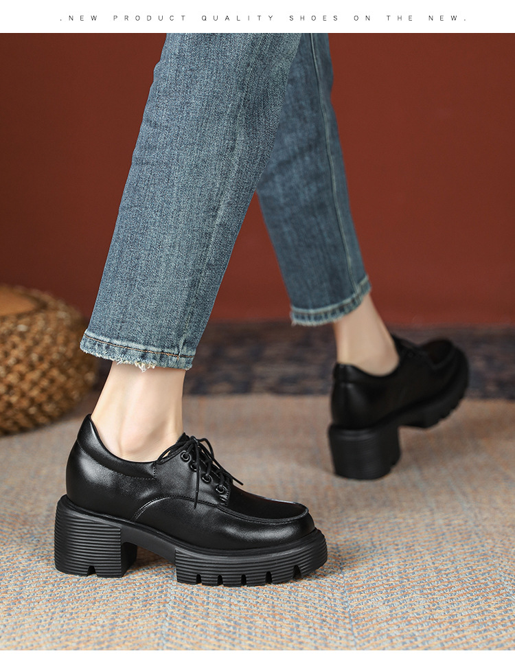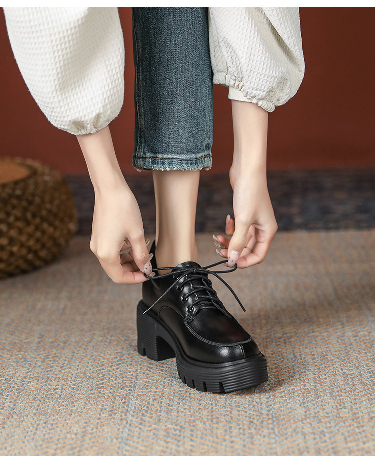 새로운 봄과 가을 레이스 업 둥근 발가락 두꺼운 바닥 스몰 사이즈 두꺼운 뒤꿈치를 2024 여성을위한 10lm 검은 색 영국 가죽 신발 내부 높이 증가스토어 가기