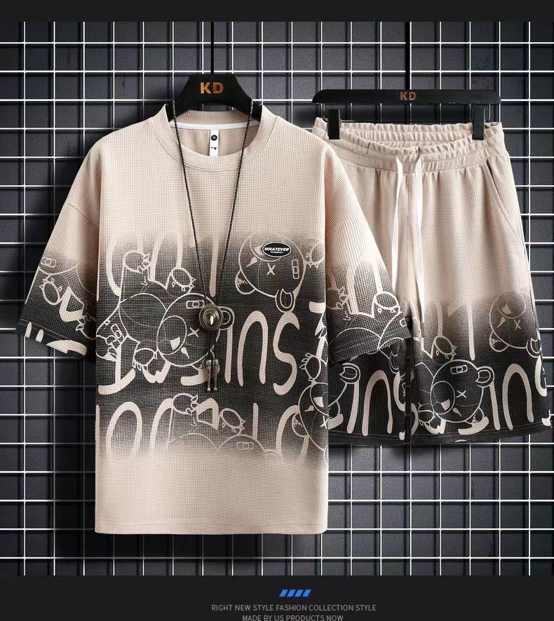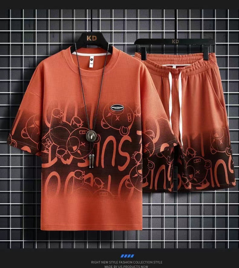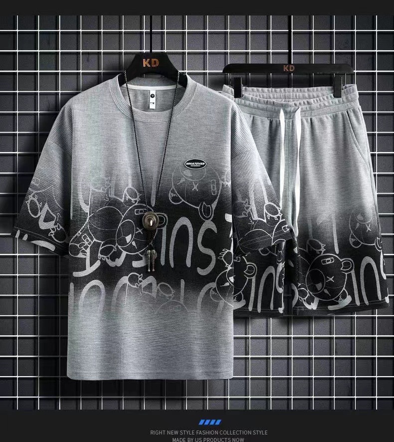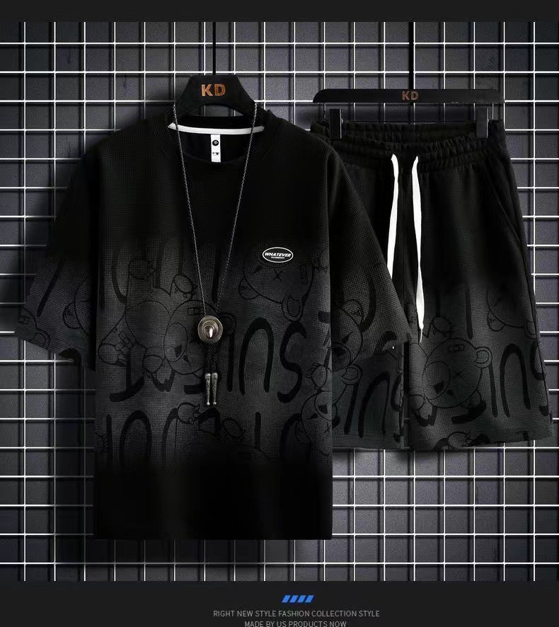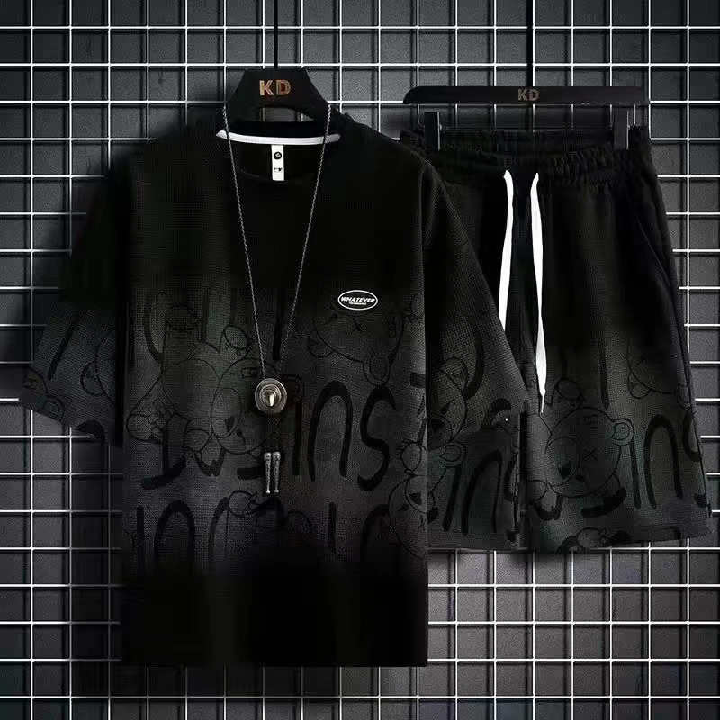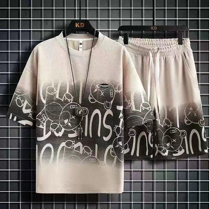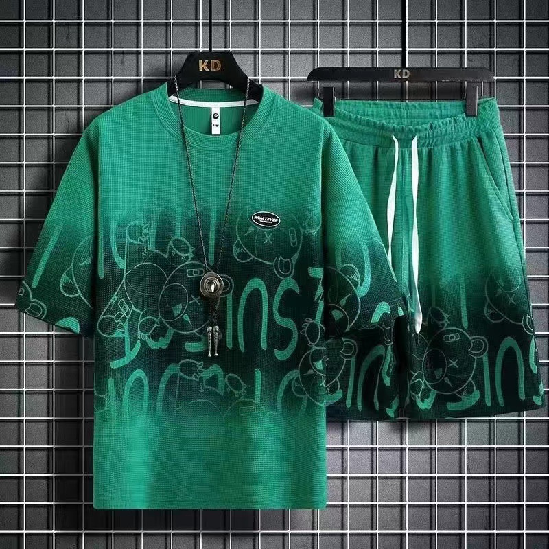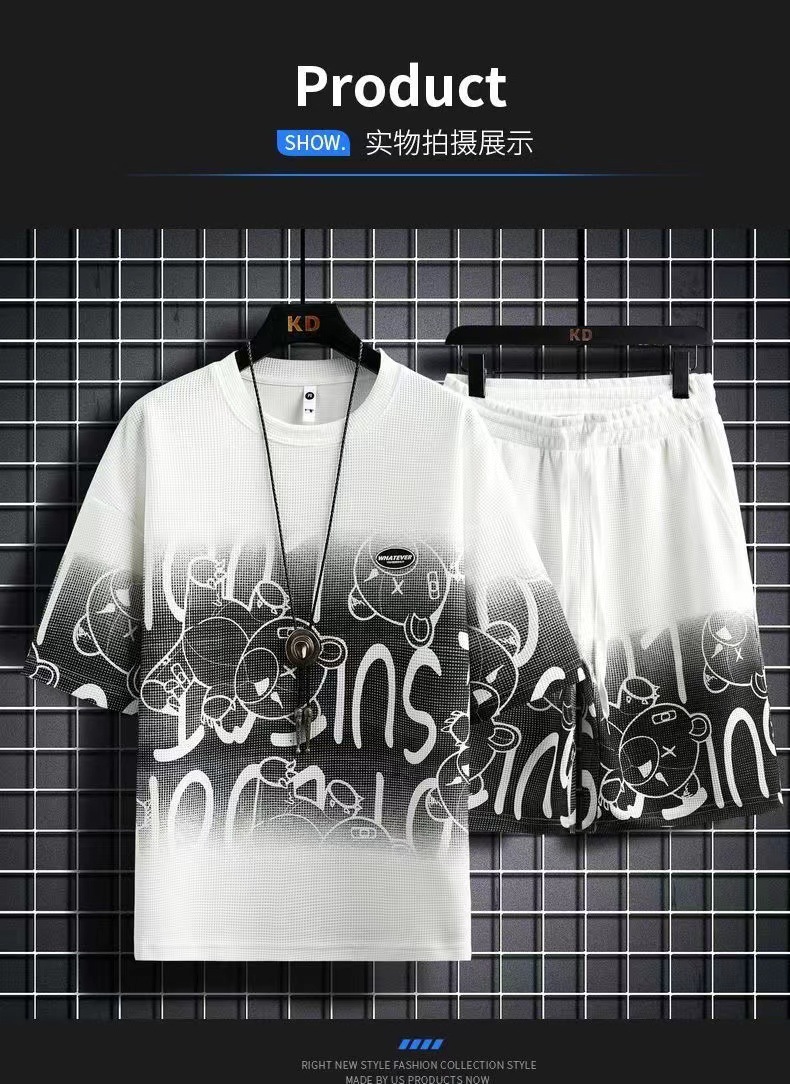 와플 스포츠 캐주얼 세트 남자 여름 얇은 아이스 실크 반팔 반바지 투피스 세트 남자 반팔 티셔츠스토어 가기