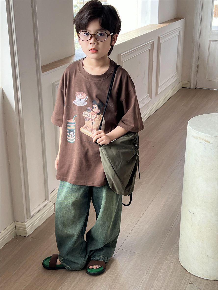 2025 봄과 여름 새로운 아동 의류 아동 반팔 유행 만화 컴퓨터 인쇄 소년과 소녀 서양식 순수 면화 반팔스토어 가기