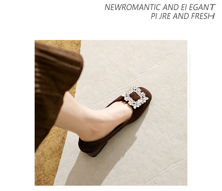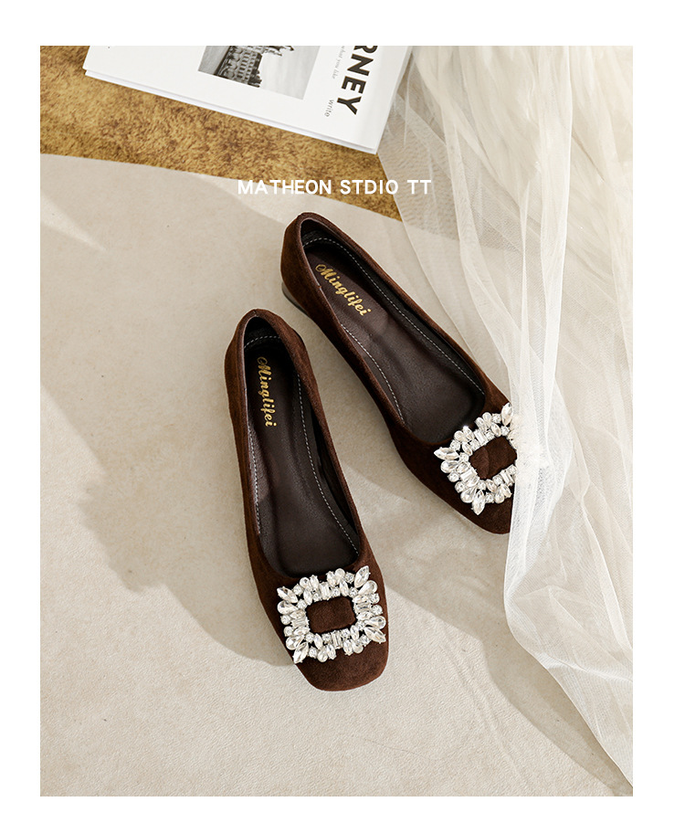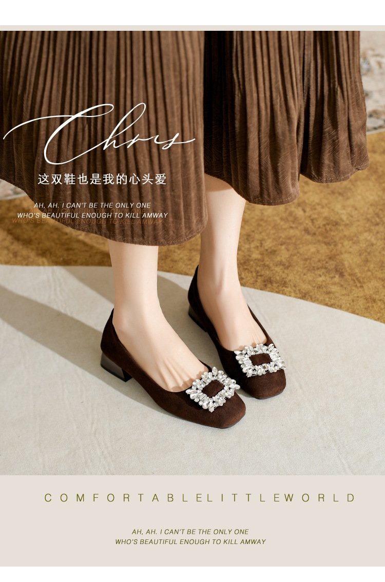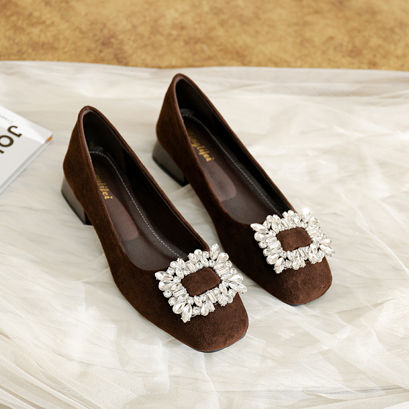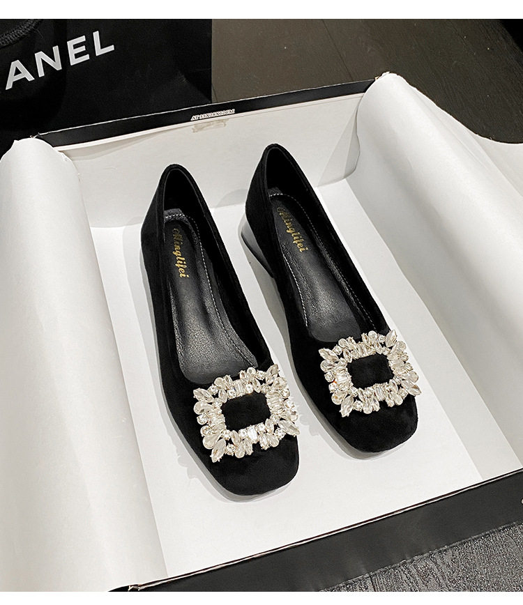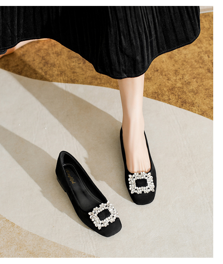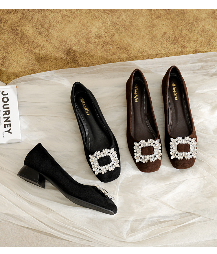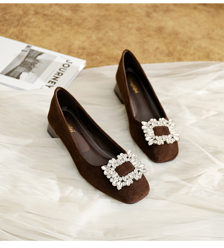 프렌치 스타일의 우아한 여성용 슈즈, 스퀘어토, 얕은 입구, 2026년 봄 신상, 워터다이아몬드 장식, 두꺼운 굽, 낮은 굽의 플랫슈즈스토어 가기